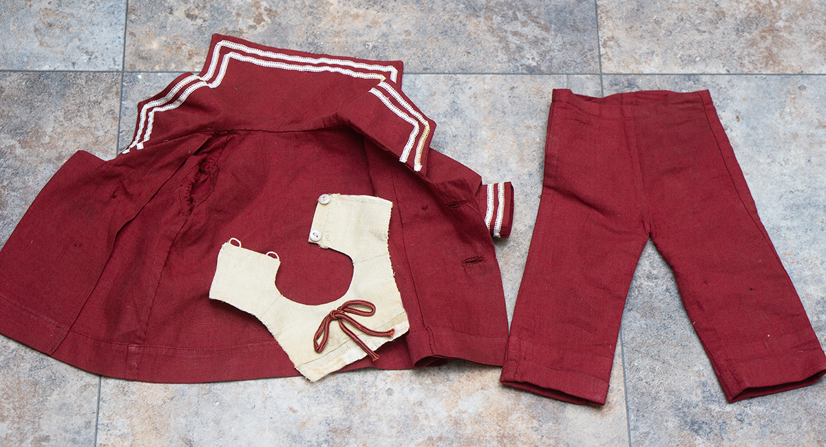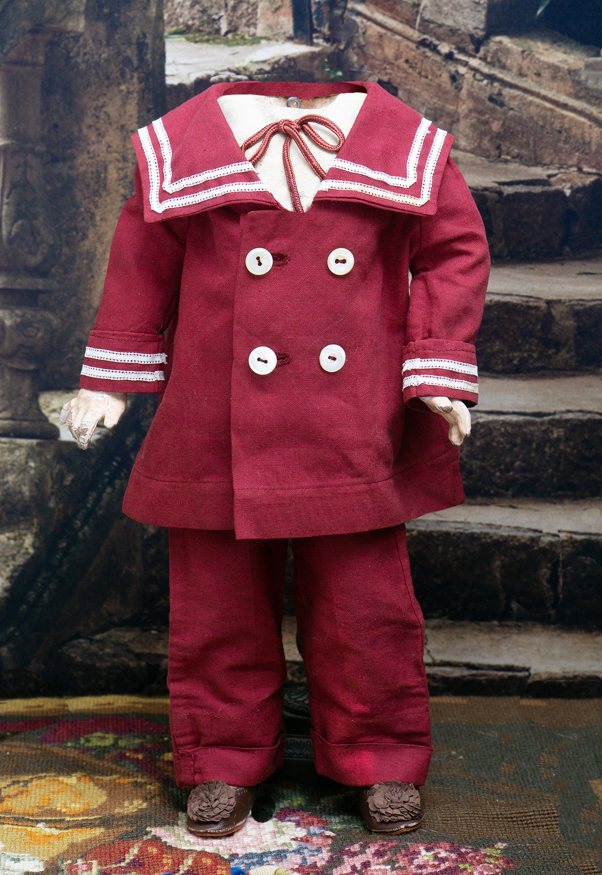 The burgundy cotton sailor costume comprises long-sleeved middy top jacket with white striped cuffs, large sailor collar closure at the front with pearl buttons along with matching shorts and cotton chemisette with cord silk bow.
