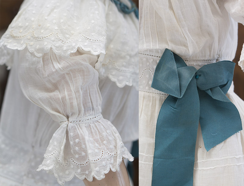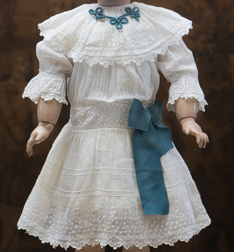 The dress features dropped waist, 2/3 sleeves, rounded neckline, wide collar, narrow tucks, decorated with blue silk cord and silk bow at the front, closure at the back with pearl buttons, hook and eye, fully hand stitched. Measures the length 17 1/2" (45 cm), the sleeve 7" (18 cm), the shoulders 6 1/2" (17 cm), the waist 16" (41 cm). Good condition to age. I DO A LAYAWAY. Please email me if you have any questions or need more photos. Thanks for your visit to Respectfulbear doll shop. ------------------------------------ I DO A LAYAWAY NO STATE SALES TAX! Thanks for your visit to Respectfulbear doll shop!
