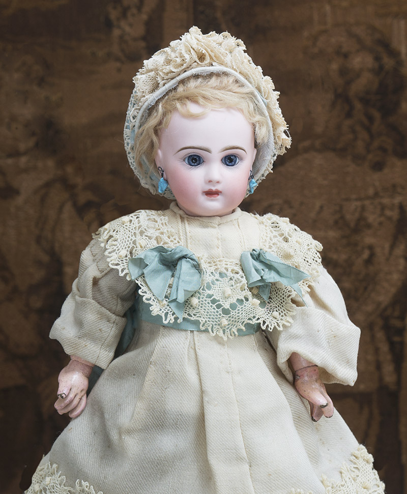 13" (33 cm.) Bisque socket head, large blue glass paperweight inset eyes, dark eyeliner, lushly painted lashes, feathered brows, shaded nostrils, closed mouth with outlined lips, pierced ears, original blonde mohair wig over cork pate, French composition and wooden fully jointed body.