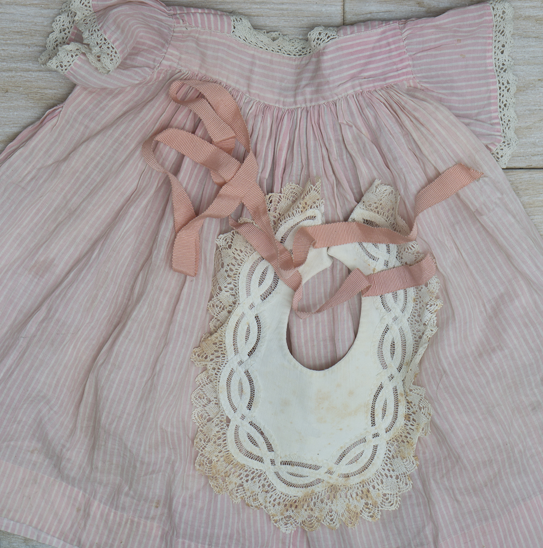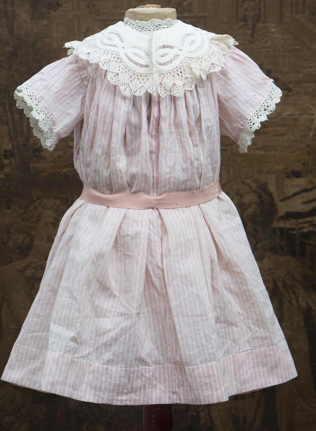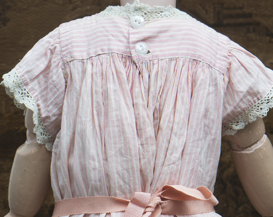 Very nice antique original pink stripped dress features high wast, short sleeves, off white pique collar, closure at the back with pearl buttons, decorated with pearl buttons, silk sash..