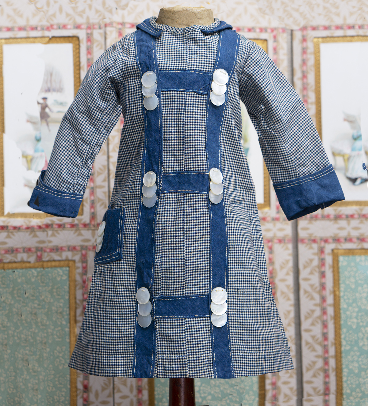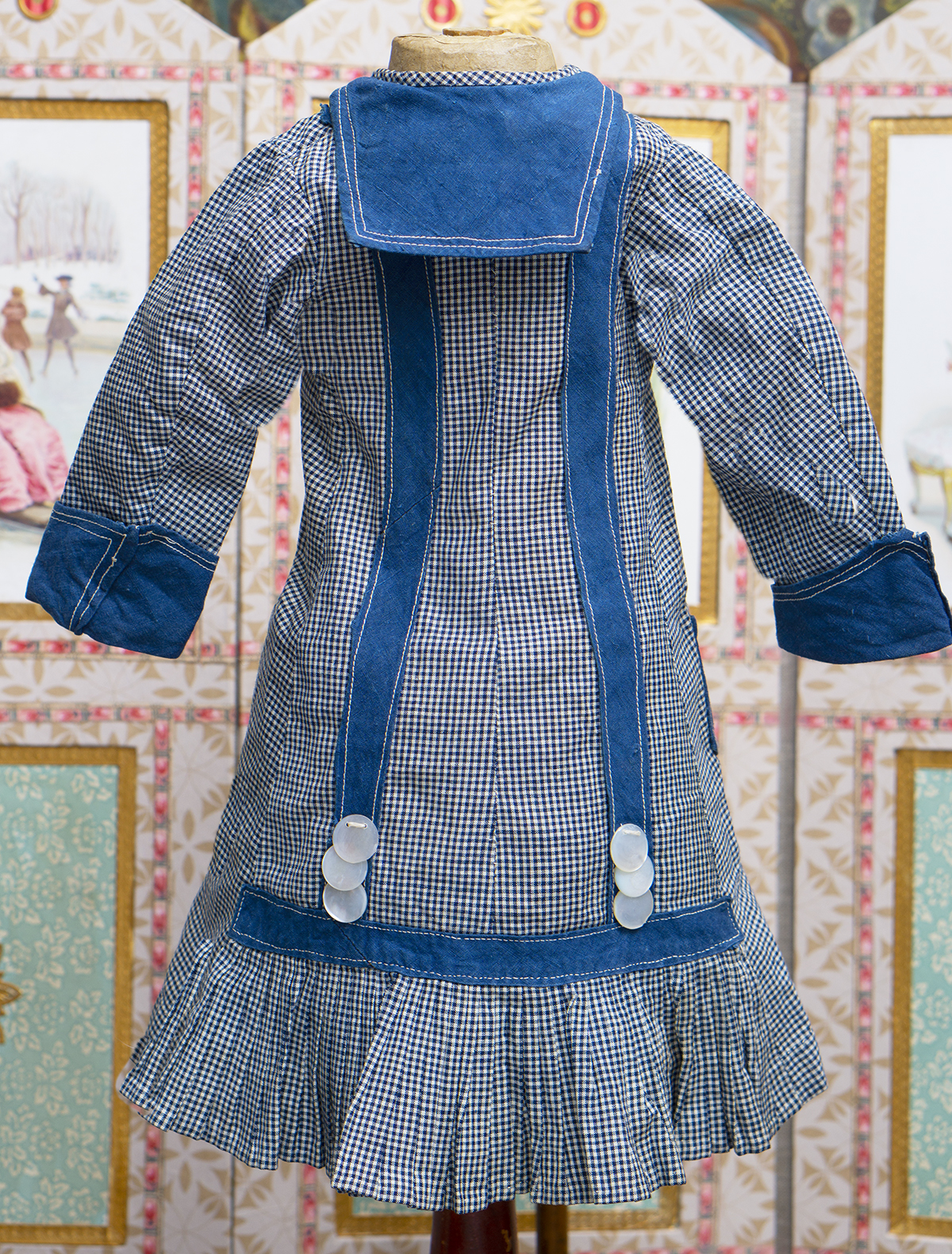 Very beautiful and unusual blue checkered cotton dress features coat sleeves with cuffs, rounded neckline, sailor collar, pleated back, closure t the front with hook and eye, decorated with blue cotton trim and pearl buttons, lined with cotton, very good condition to age.