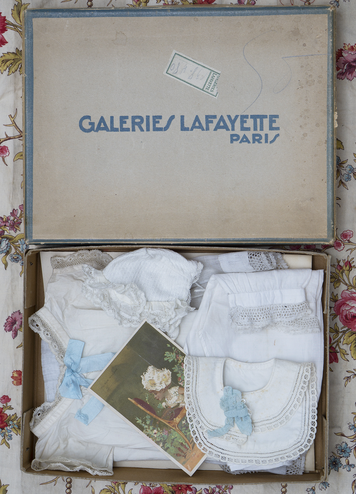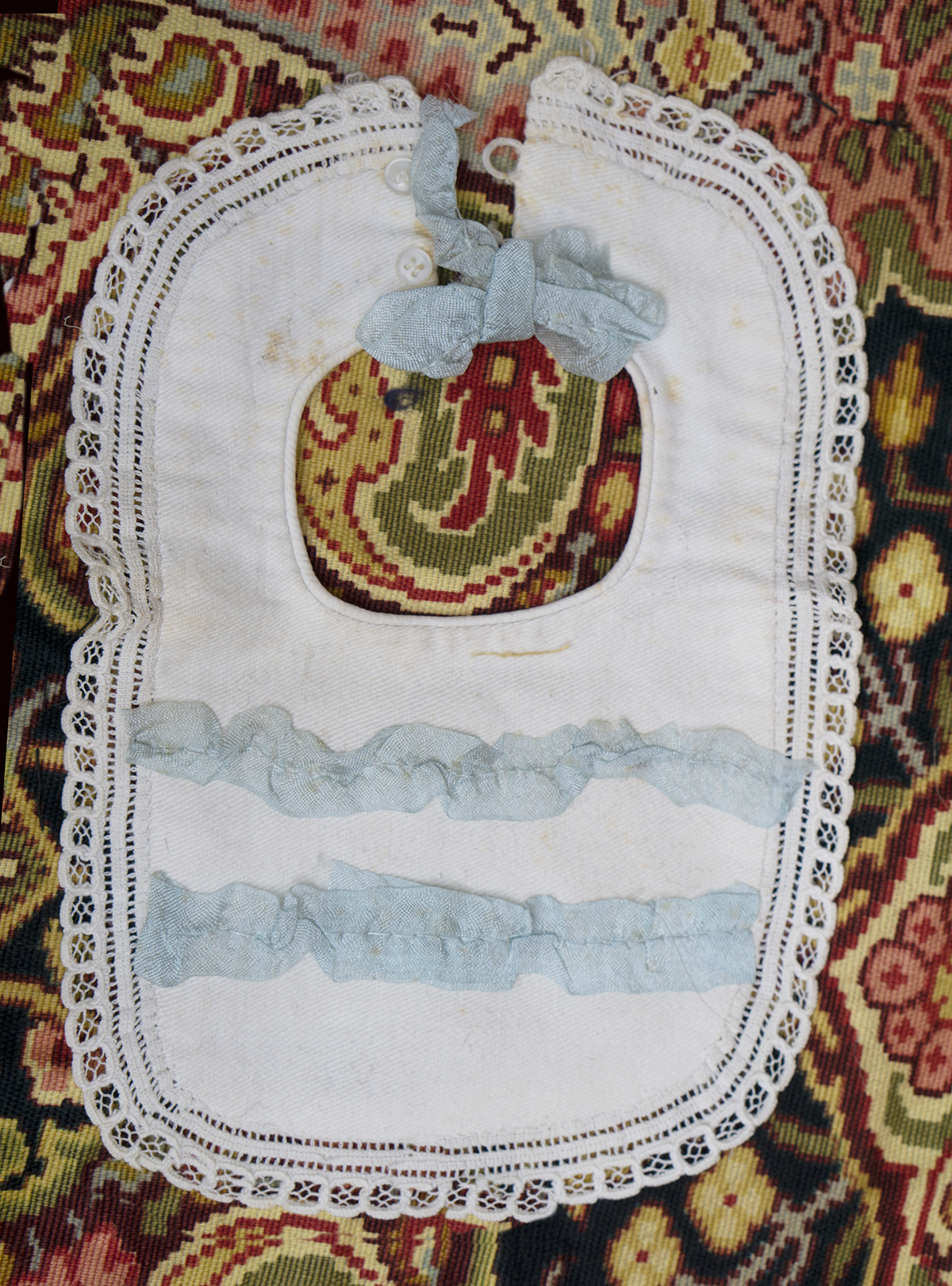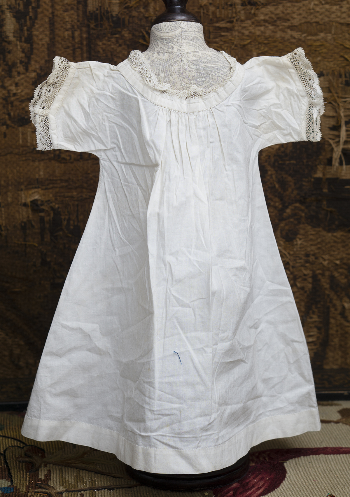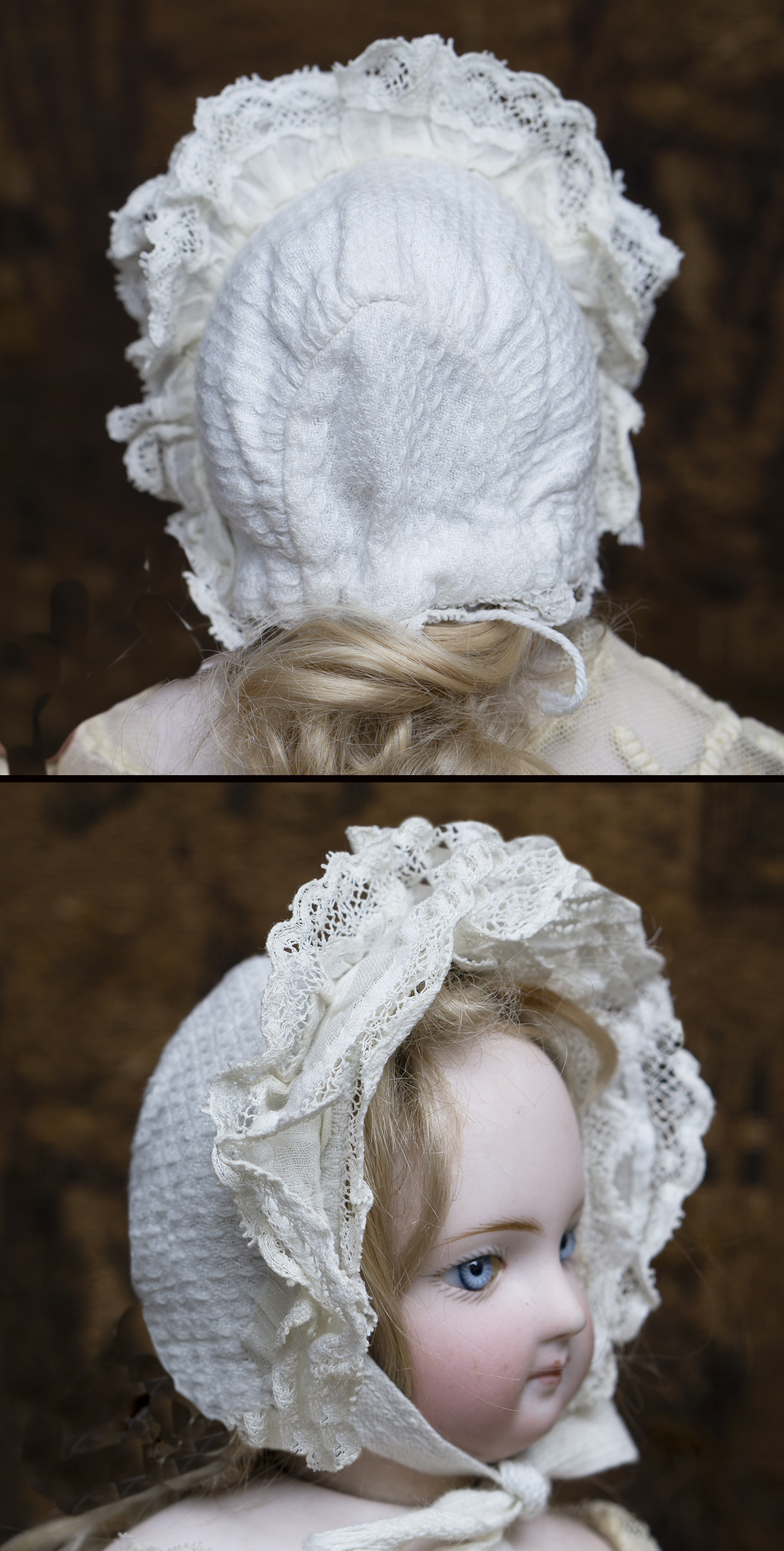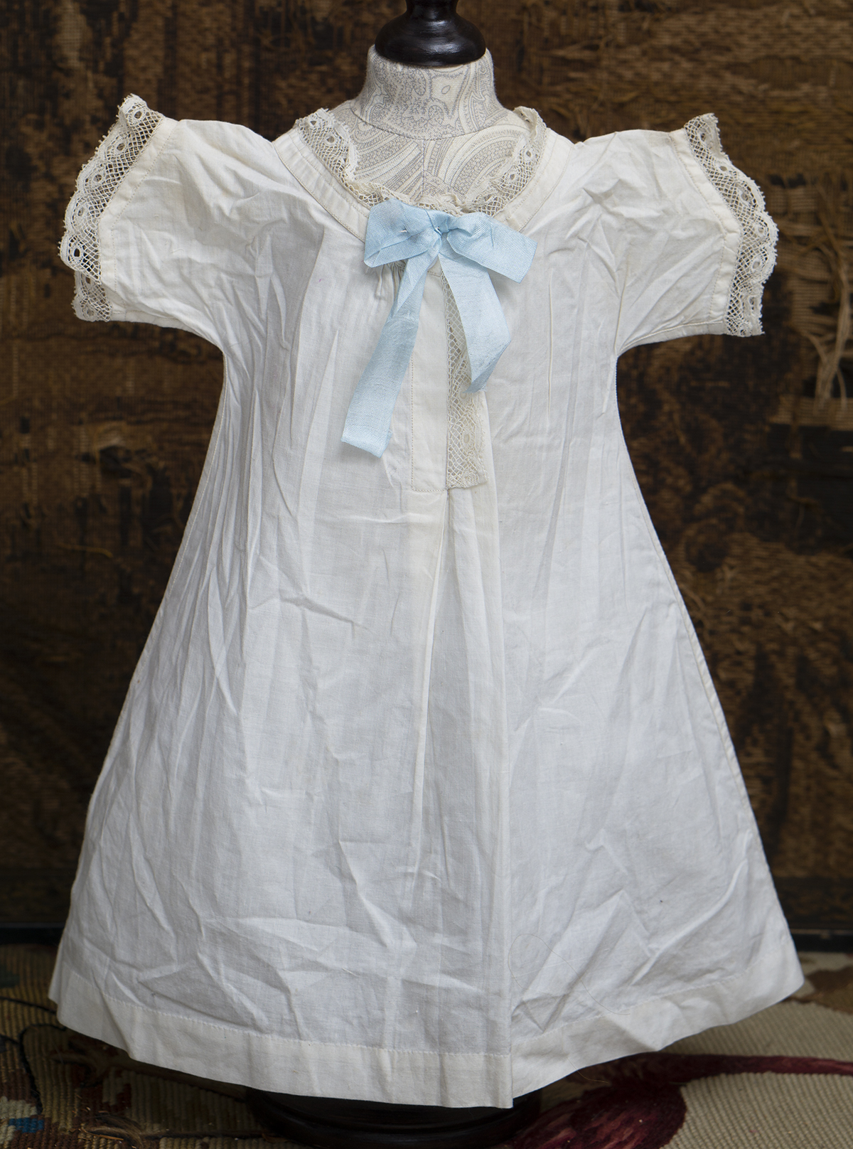 The set consist of 5 pieces: the chemise, pantaloon, petticoat, pique and lace bonnet and small collar. All pieces are hand stitched!! 1/ A very beautiful antique white batiste chemise features short sleeves with lace edging, blue silk bow, closure at the front with pearl button. Measures 11 1/2" (29 cm) length, 5" (13 cm) shoulders, free waist. 2/ A very full antique white batiste petticoat with lace edging. Measures 9" (23 cm) length, 10 1/2" (26cm) waist. 3/ Antique white cotton pantaloon closure at the waist with two pearl buttons, measures 10 1/2" (26cm) waist, 8" (20 cm) length. 4/ Antique white ribbed pique bonnet decorated with lace trim, measures 2 1/2" (7 cm) wide inside, adjusting at the bacl with cotton cord. 5/ The cotton collar with open work and lace trim closure at the front with pearl buttons, decorated with aqua silk bow. Measures 6" (15cm) fill length. The set has french trade card and original presentation box of GALERIES LAFAYETTE PARIS. Measures of the box 10 1/2" (27 cm) x 8" (20 cm) x 2" (5 cm). Fit for french fashion doll 18-19in tall. All items in good condition to age France, Paris, c.1890. ------------------------ I DO A LAYAWAY (max. 3 months for this item) International shipping cost $45.00 NO ANY SALES TAX! Please email me if you have any questions or need more photos. Thanks for your visit to Respectfulbear doll shop. ------------------------------------ I DO A LAYAWAY NO STATE SALES TAX! Thanks for your visit to Respectfulbear doll shop!