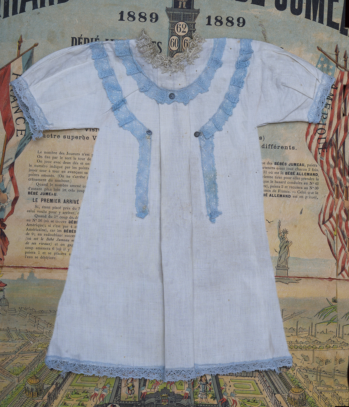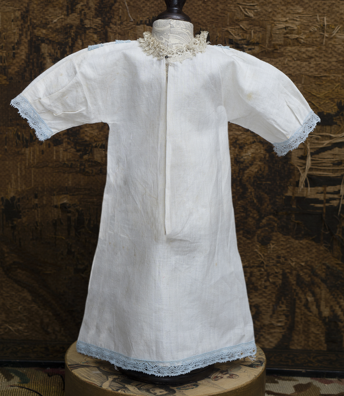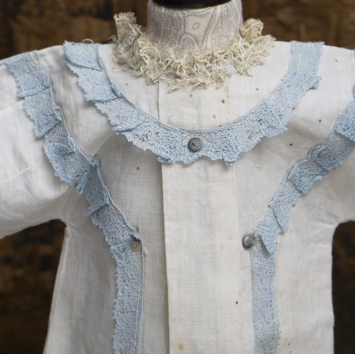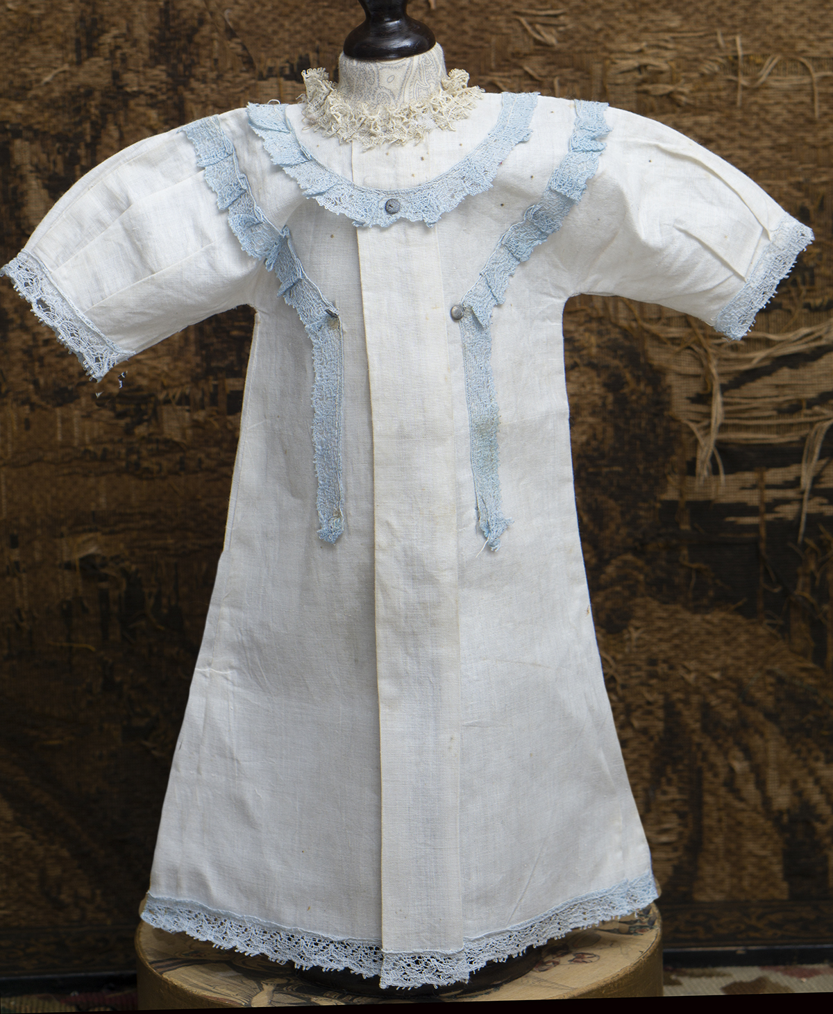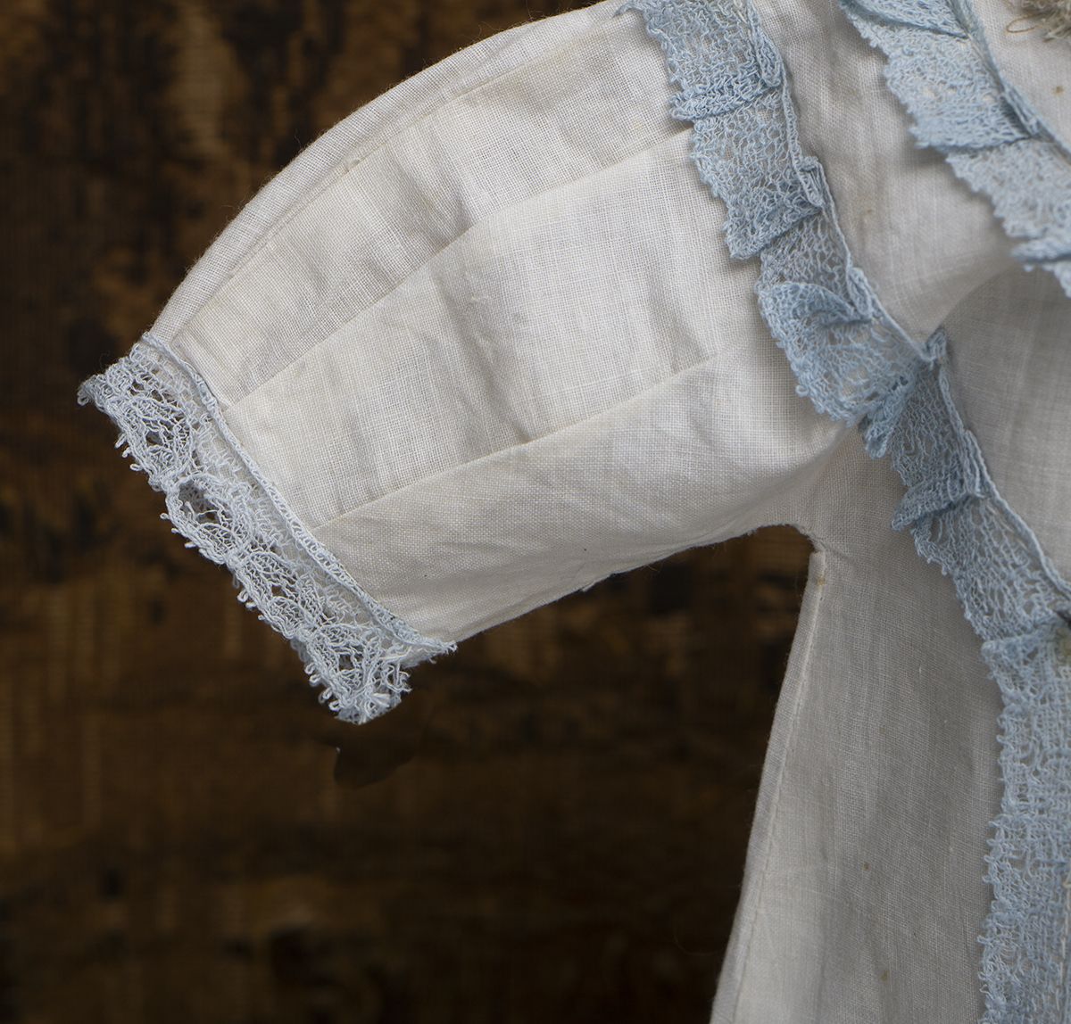 Off white muslin chemise features rounded neckline with lace collar, puffed short sleeves, one center box pleat at the front, decorated with blue lace and tiny metal buttons, closure at the back with hook and eye .