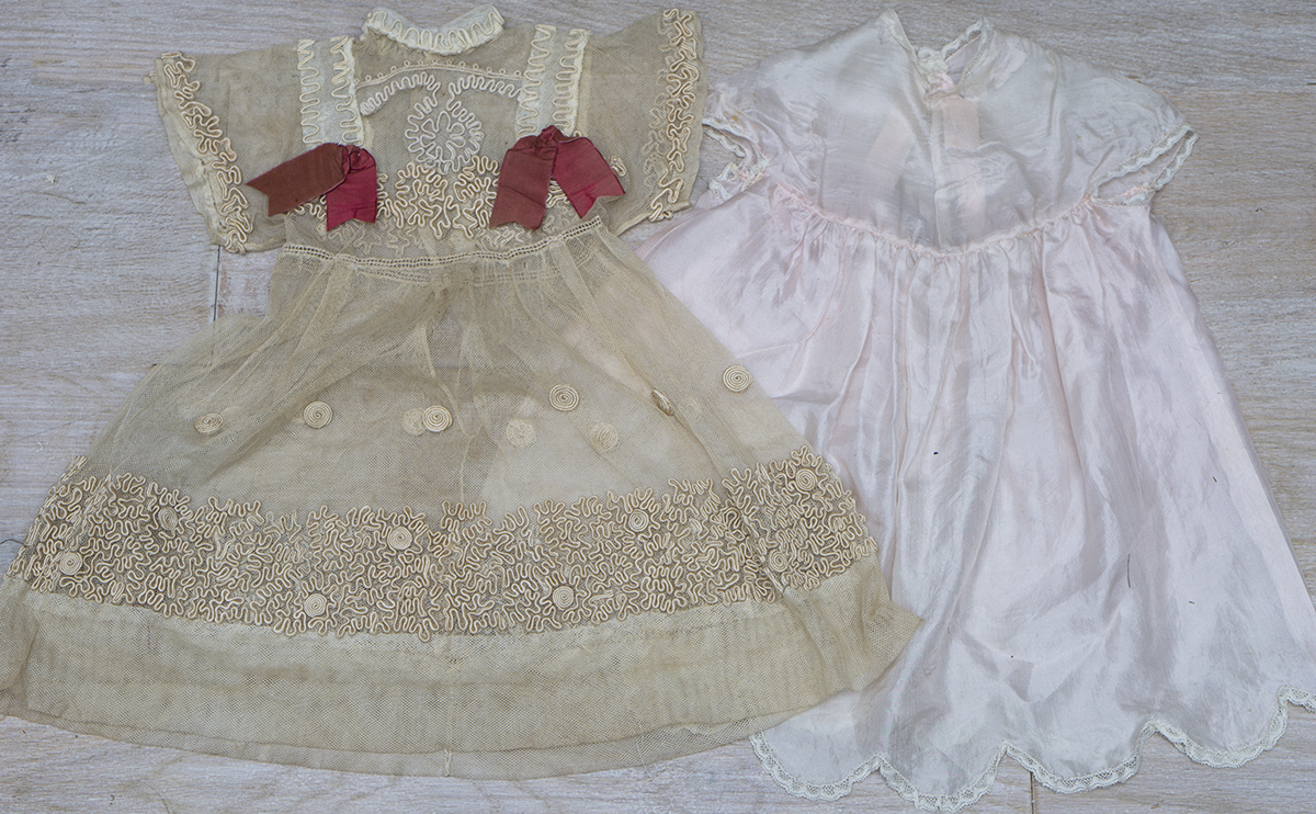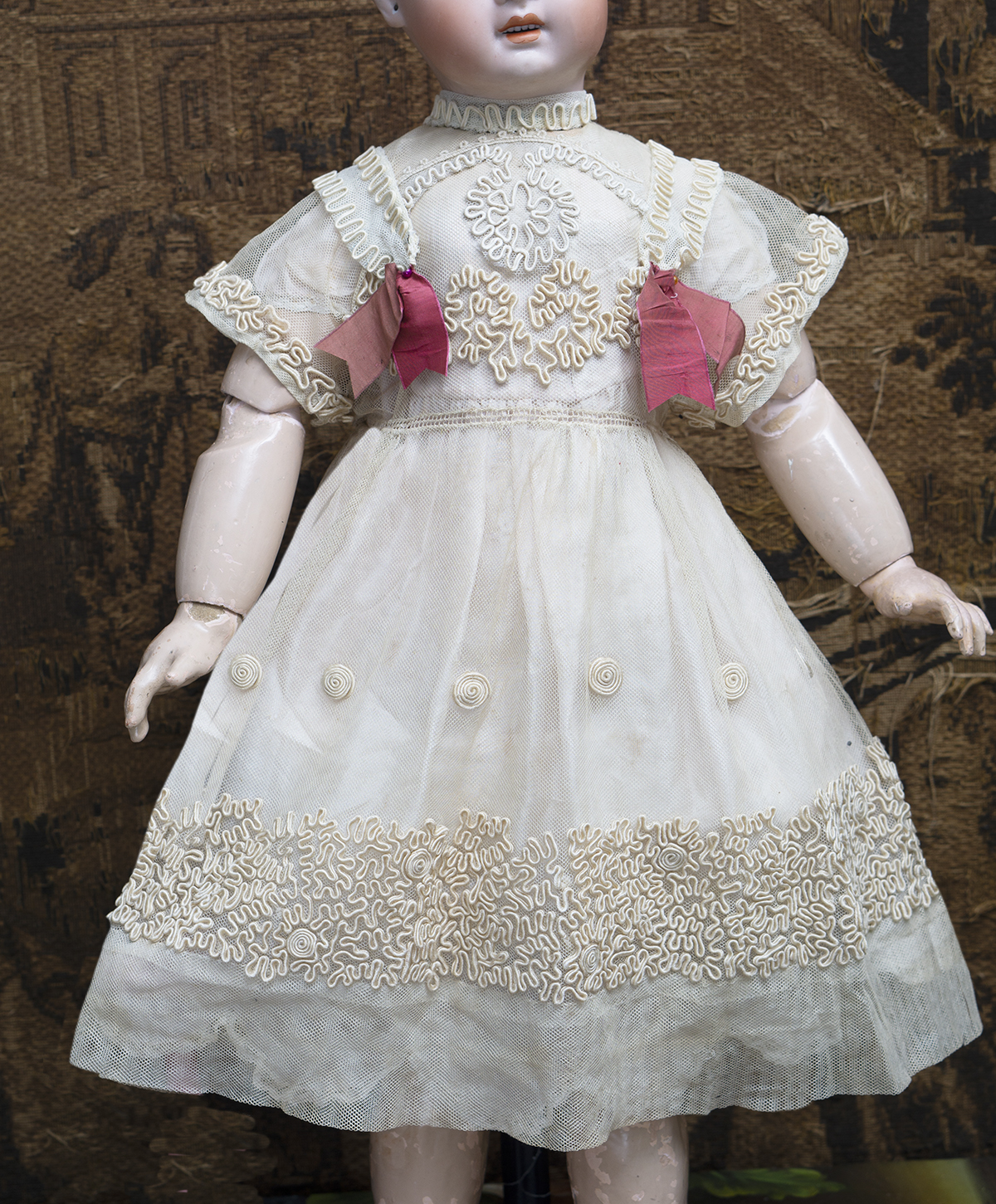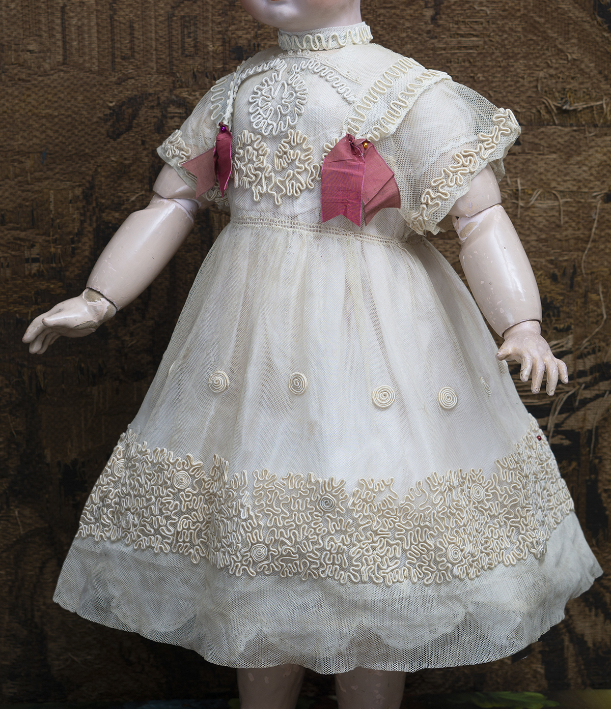 The dress decorated with silk soutache. Each line of soutache was hand sewn onto the net lace base with painstaking accuracy, every curve and line produced with delicate needlework and precision. The dress has matching pale pink silk underdress with scalloped edge with lace trim, closure at the back with hook and eye. Measures of the dress 16 1/2" (42 cm) length, 4 1/2" (11 cm) sleeve, 6 1/2" (17 cm) shoulders, 15" (38cm) chest. Fit for large bebe doll about 25-26" (62-65 cm) ---------------------------------------- I DO A LAYAWAY. NI ANY SALES TAX! International shipping cost $38.00 Please email me if you have any questions. Thanks for your visit to Respectfulbear doll shop. ------------------------------------ I DO A LAYAWAY NO STATE SALES TAX! Thanks for your visit to Respectfulbear doll shop!