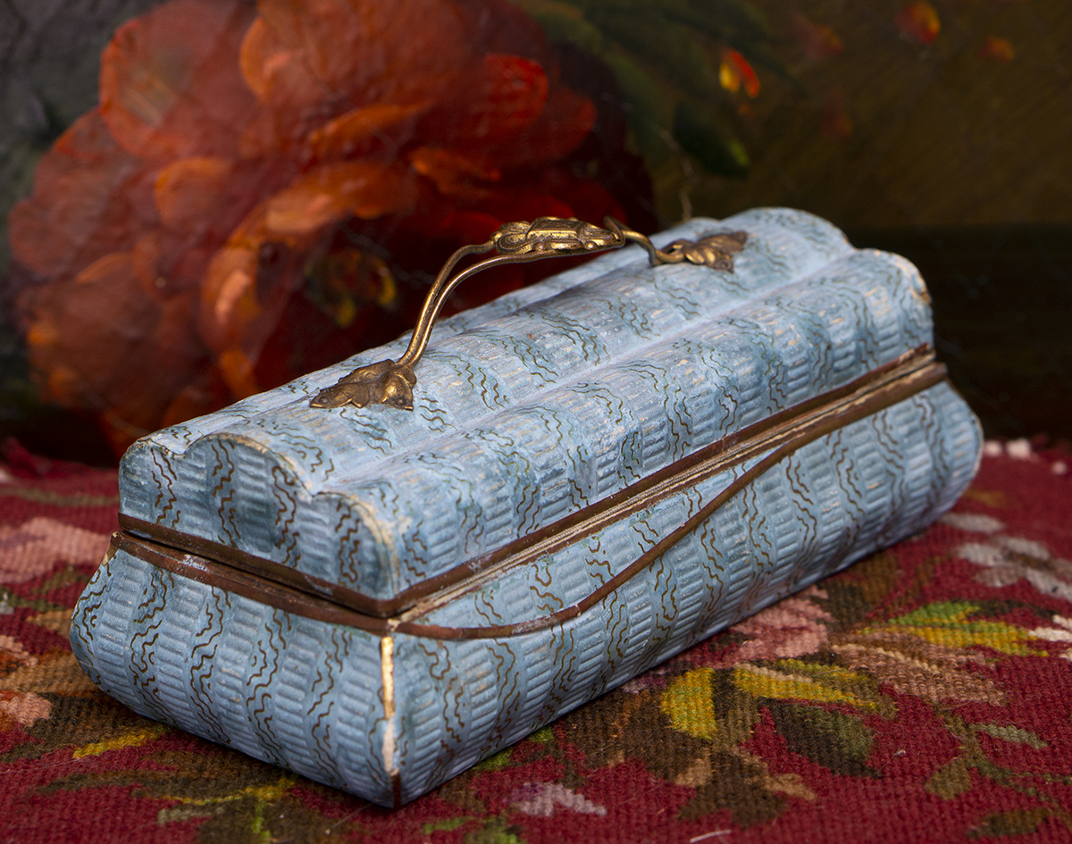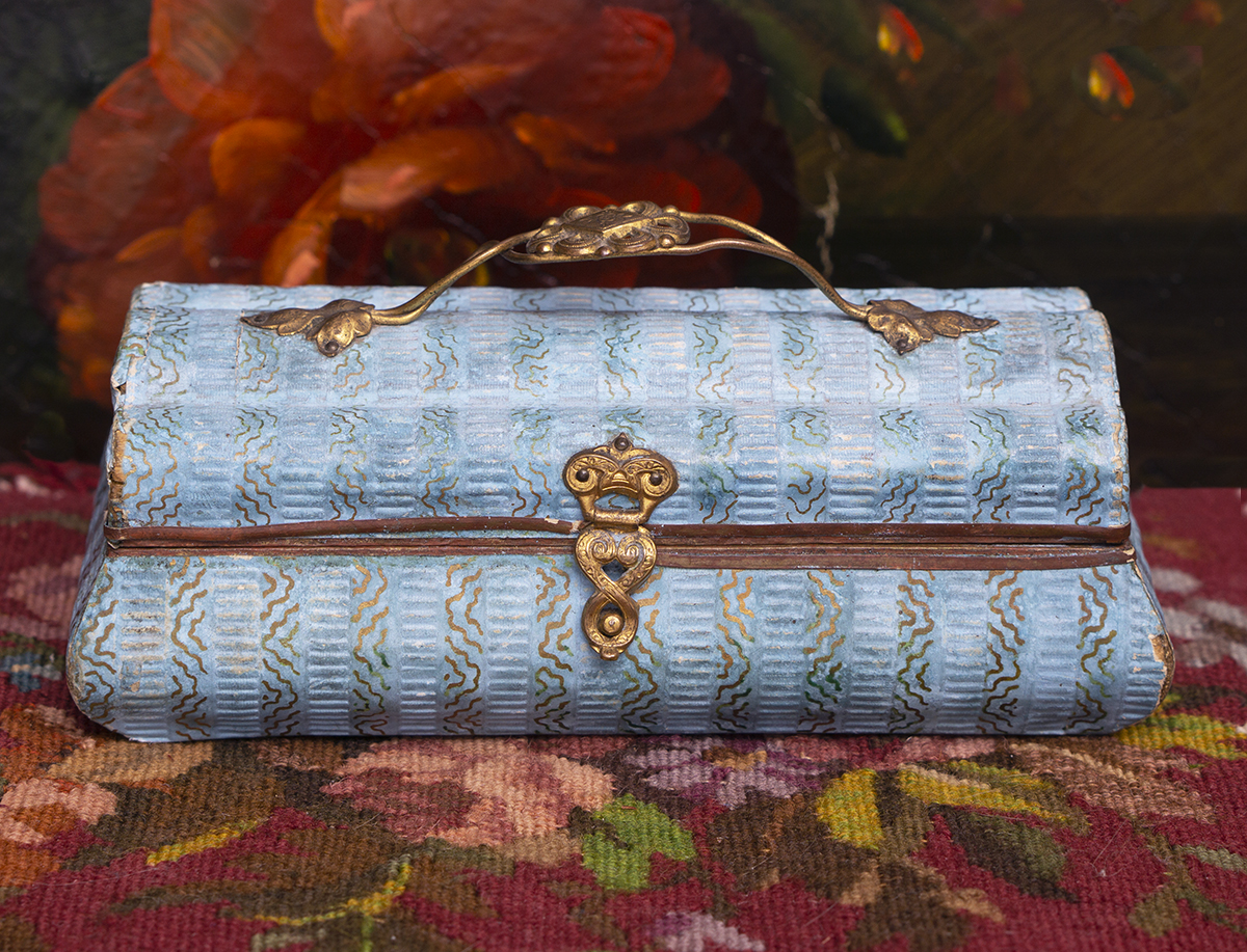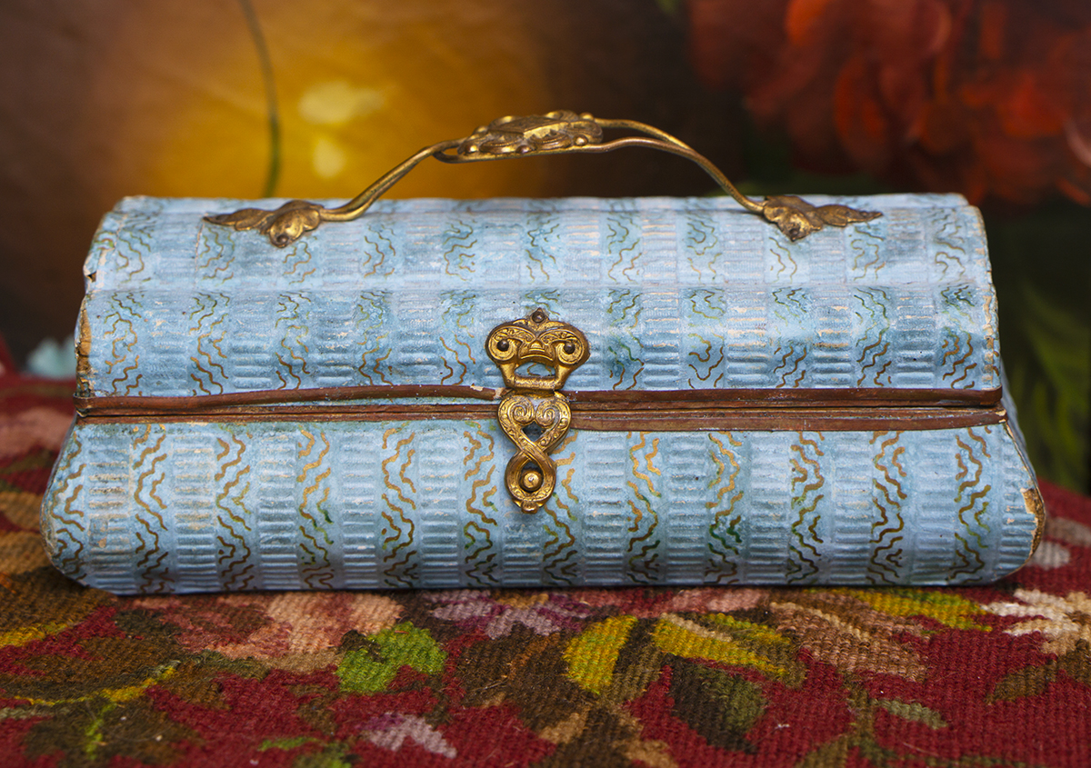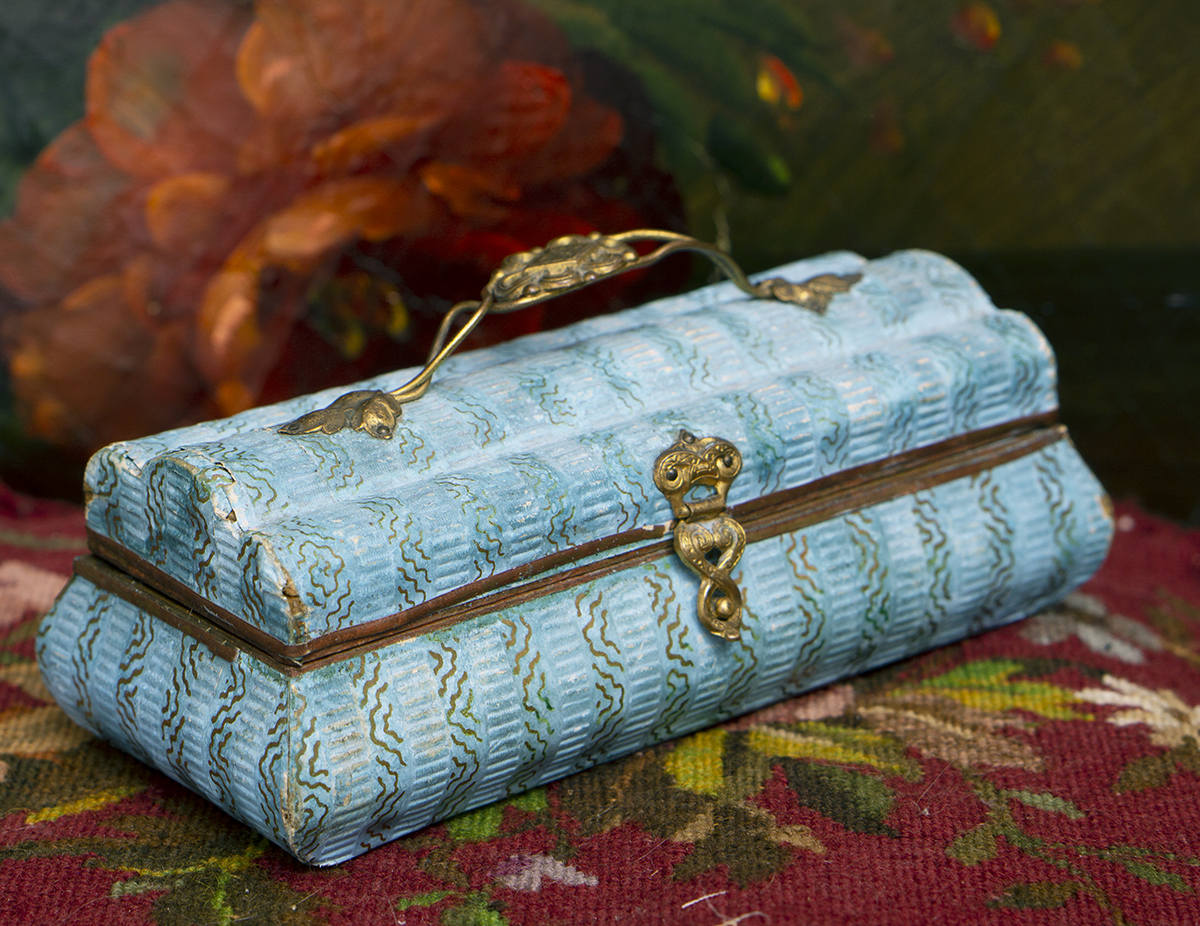 The candy box / doll purse can be opened by lifting its lid. It closes with a brass closure on the front. It has a metal handle. The unusual appealing form makes this candy container a very desirable piece, It measures 2" (5cm) wide, 2" (5cm) high and 4 3/4" (12 cm) length. Good condition to age. French, c.1890 -------------------- I DO A LAYAWAY. No any sales tax. International shipping cost $35.00 Please email me if you have any questions. Thanks for your visit to Respectfulbear doll shop. ------------------------------------ I DO A LAYAWAY NO STATE SALES TAX! Thanks for your visit to Respectfulbear doll shop!