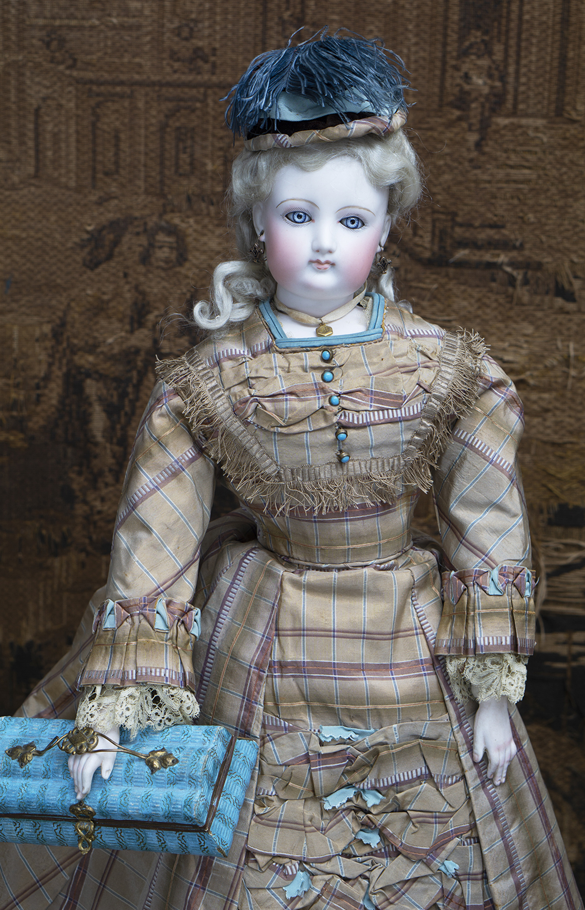 An Exceptional find is this original antique french doll candy container/ Doll purse/ Bag made of fine patterned sturdy carton.