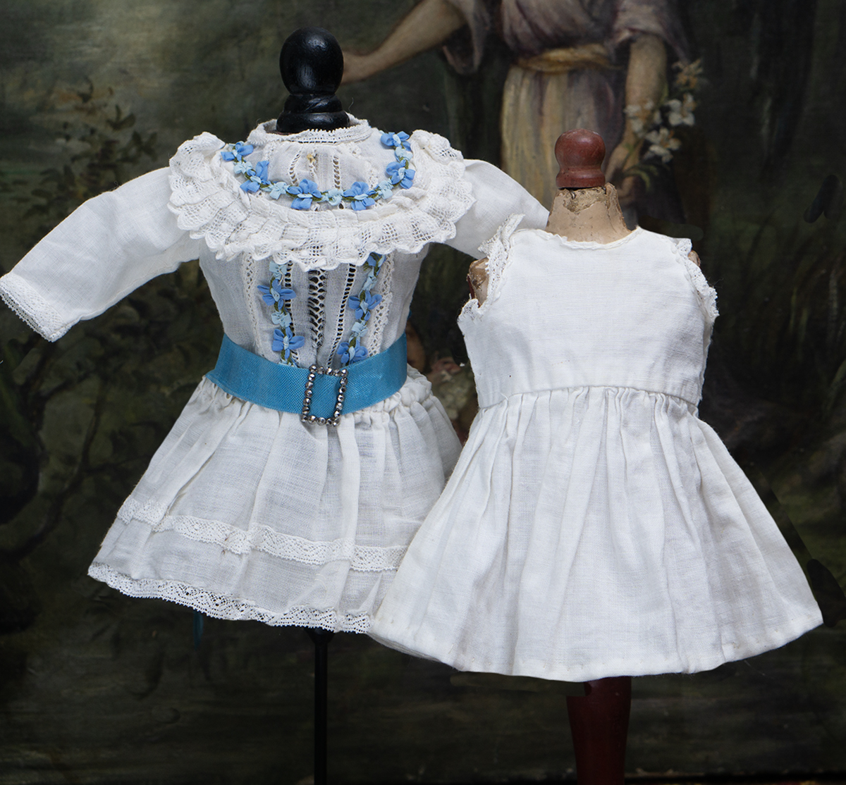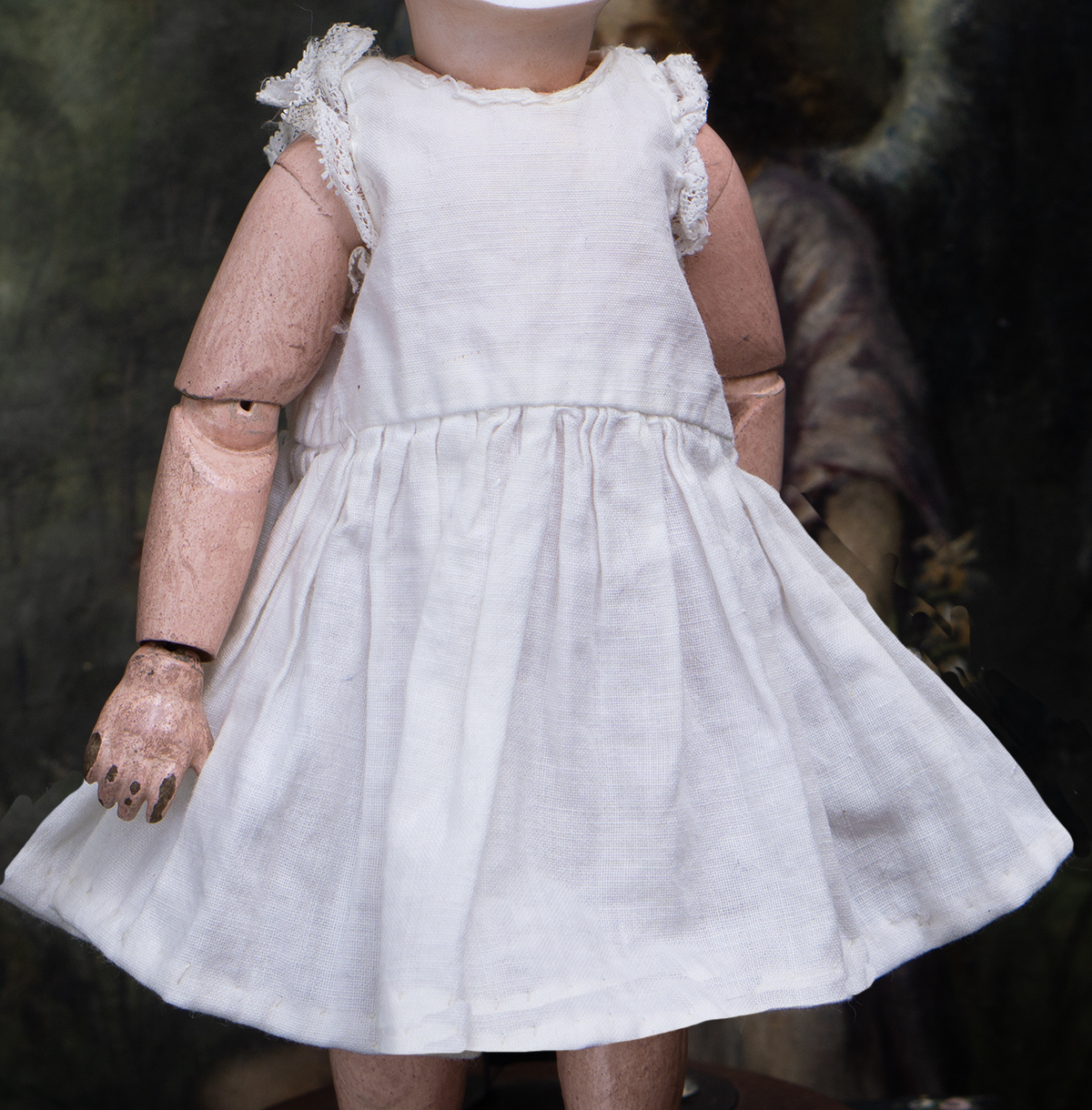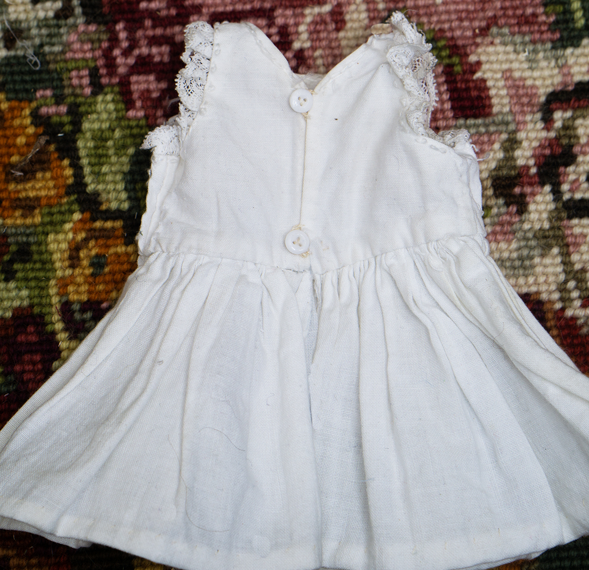 The matching whitq cotton chemise closure at the back with pearl buttons. Good condition to age. Measures of the dress 6" (15 cm) length, 2 1/2" (6 cm) sleeve, 3" (8 cm) shoulders, 6 1/2" (16.5cm cm) waist. The chemise: 5 1/2" (14 cm) length. Fit for doll about 9 in tall (22-24 cm). International shipping cost $35.00 ------------------------------------ I DO A LAYAWAY NO STATE SALES TAX! Thanks for your visit to Respectfulbear doll shop!