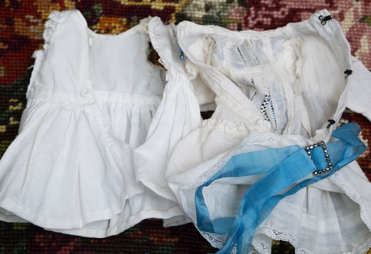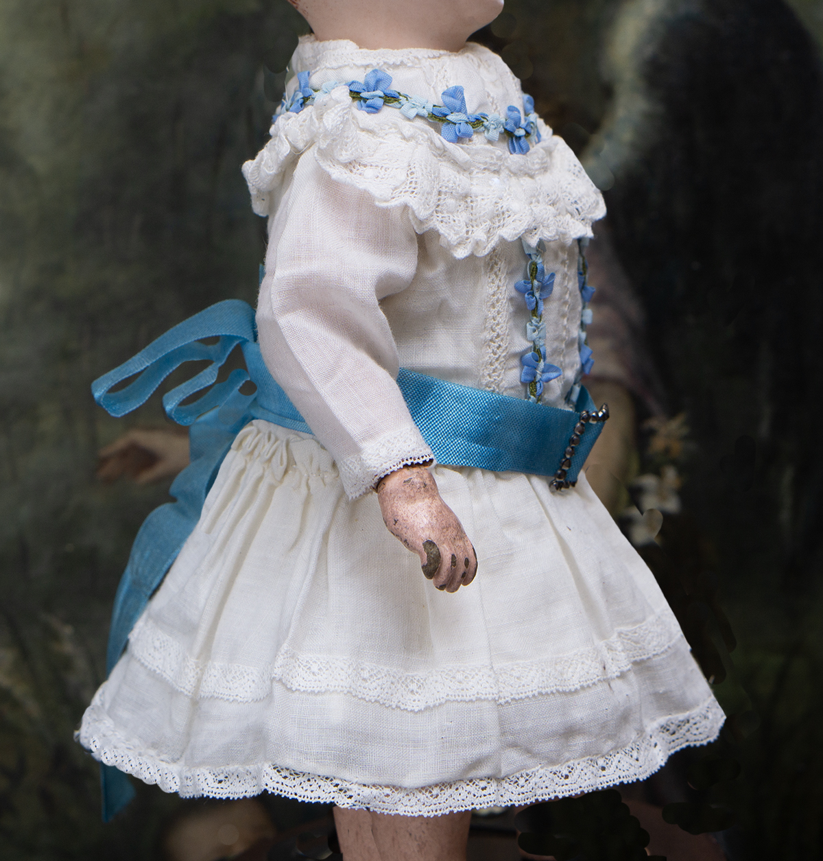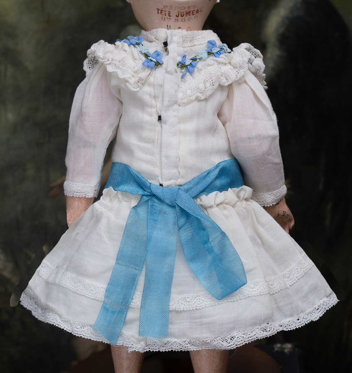 The matching whitq cotton chemise closure at the back with pearl buttons. Good condition to age. Measures of the dress 6" (15 cm) length, 2 1/2" (6 cm) sleeve, 3" (8 cm) shoulders, 6 1/2" (16.5cm cm) waist. The chemise: 5 1/2" (14 cm) length. Fit for doll about 9 in tall (22-24 cm). International shipping cost $35.00 ------------------------------------ I DO A LAYAWAY NO STATE SALES TAX! Thanks for your visit to Respectfulbear doll shop!