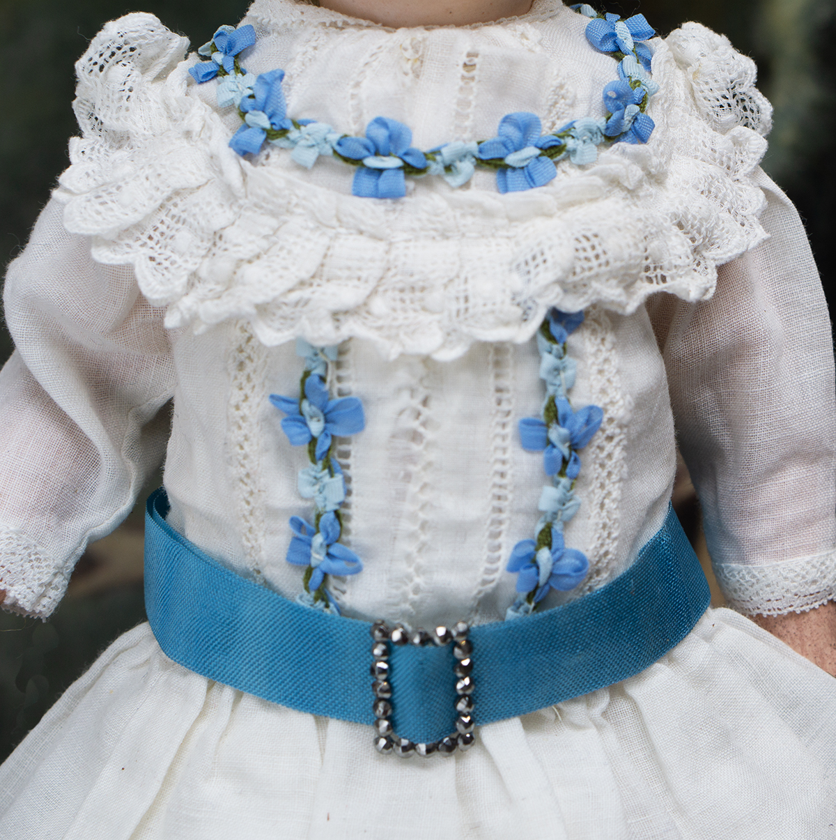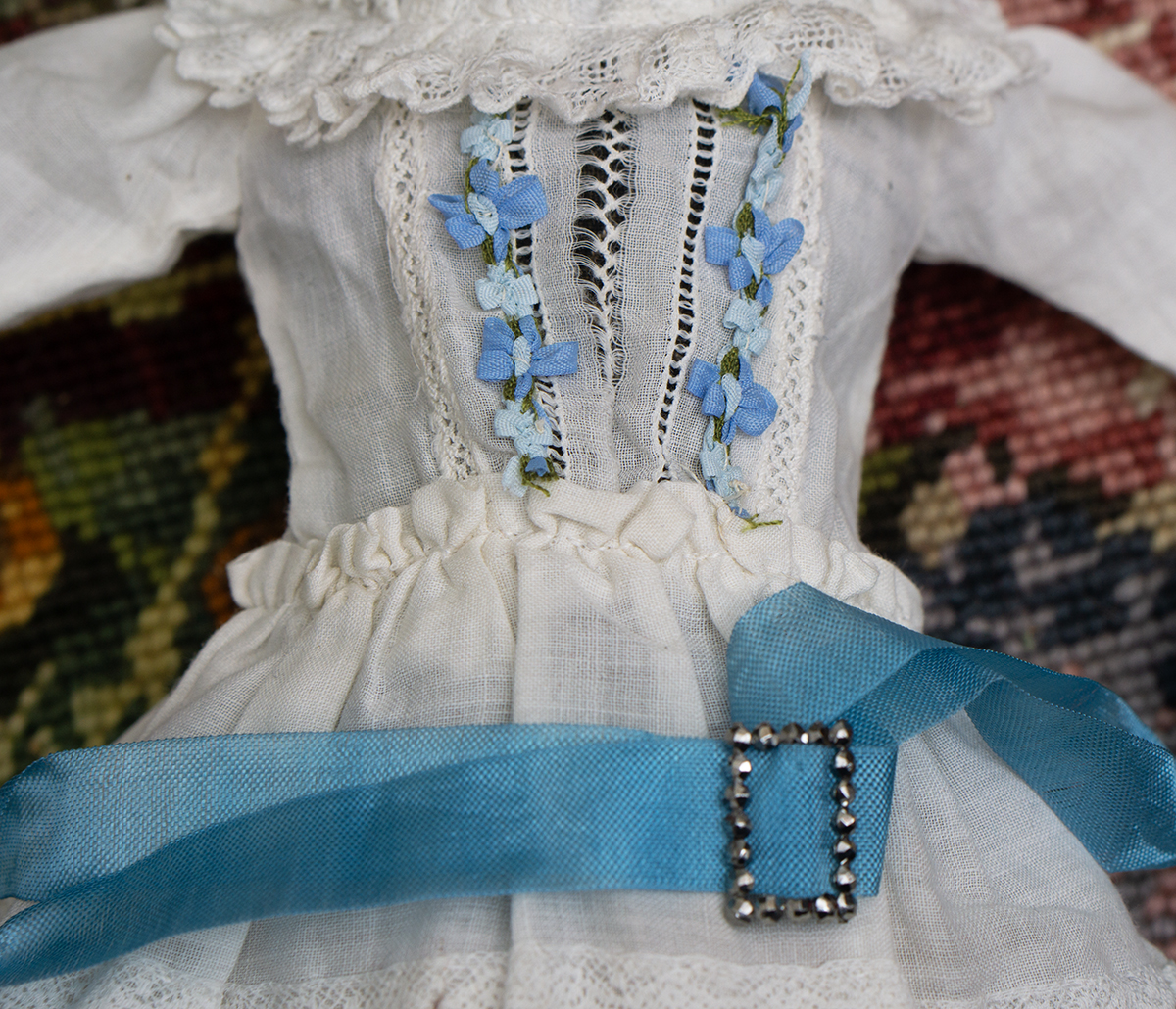 Very beautiful antique french original muslin dress features rounded neckline, Bertha lace collar, fitted bodice with bands of open work, 2/3 sleeves with lace edging, set-in waistband, blue silk sash with cut-steel slide buckle, decorated with blue flowers trim, closure at the back with hook and eye.
