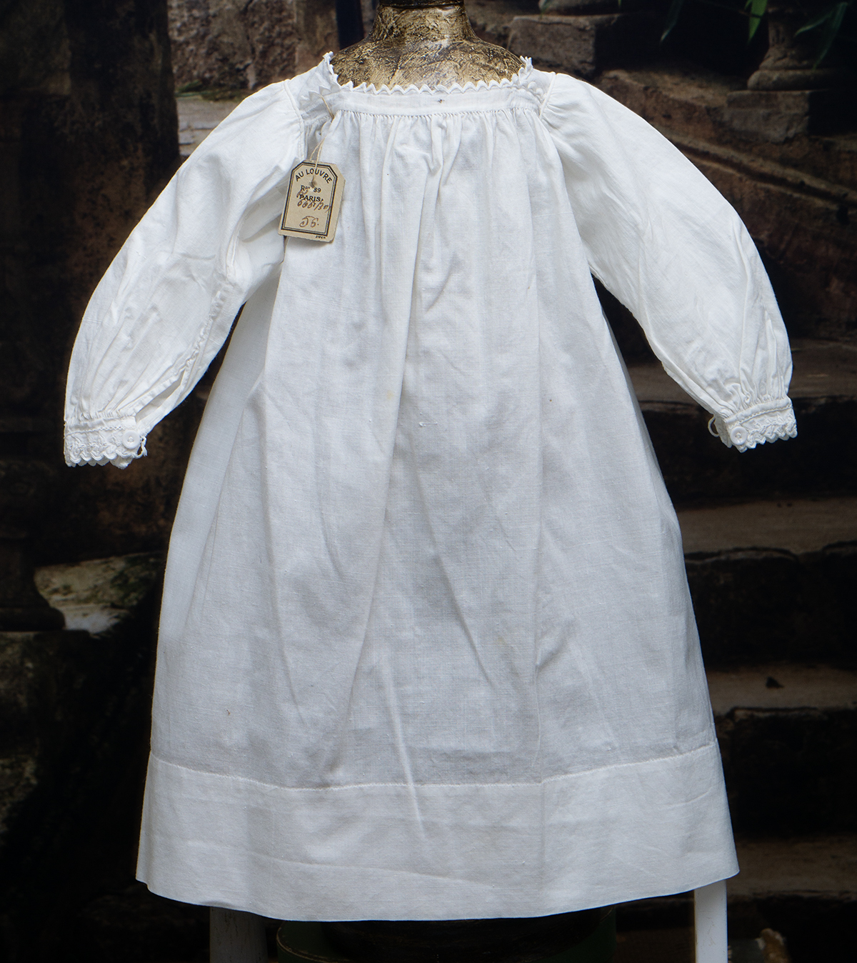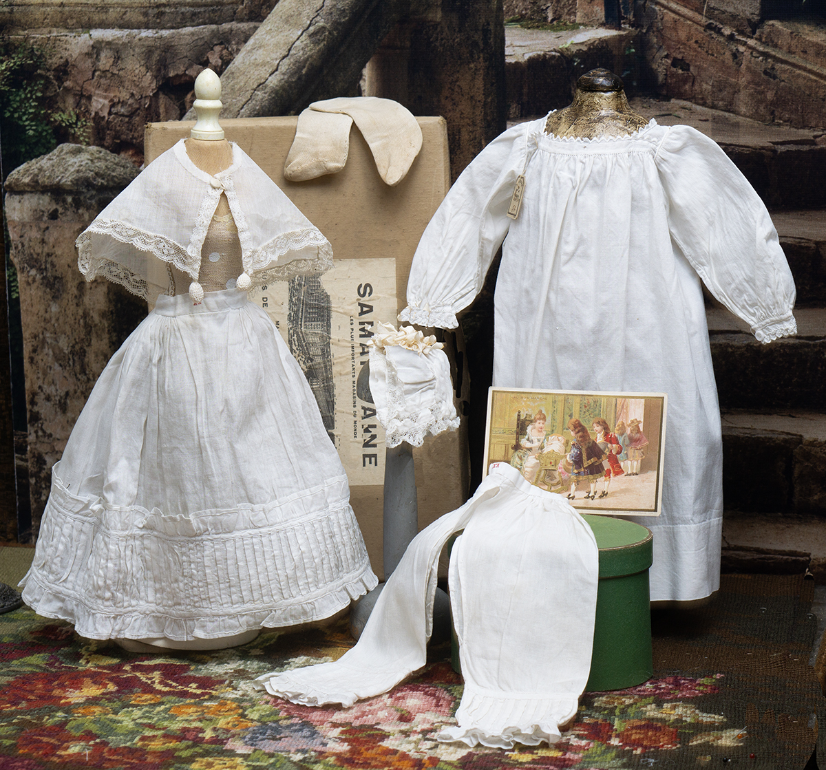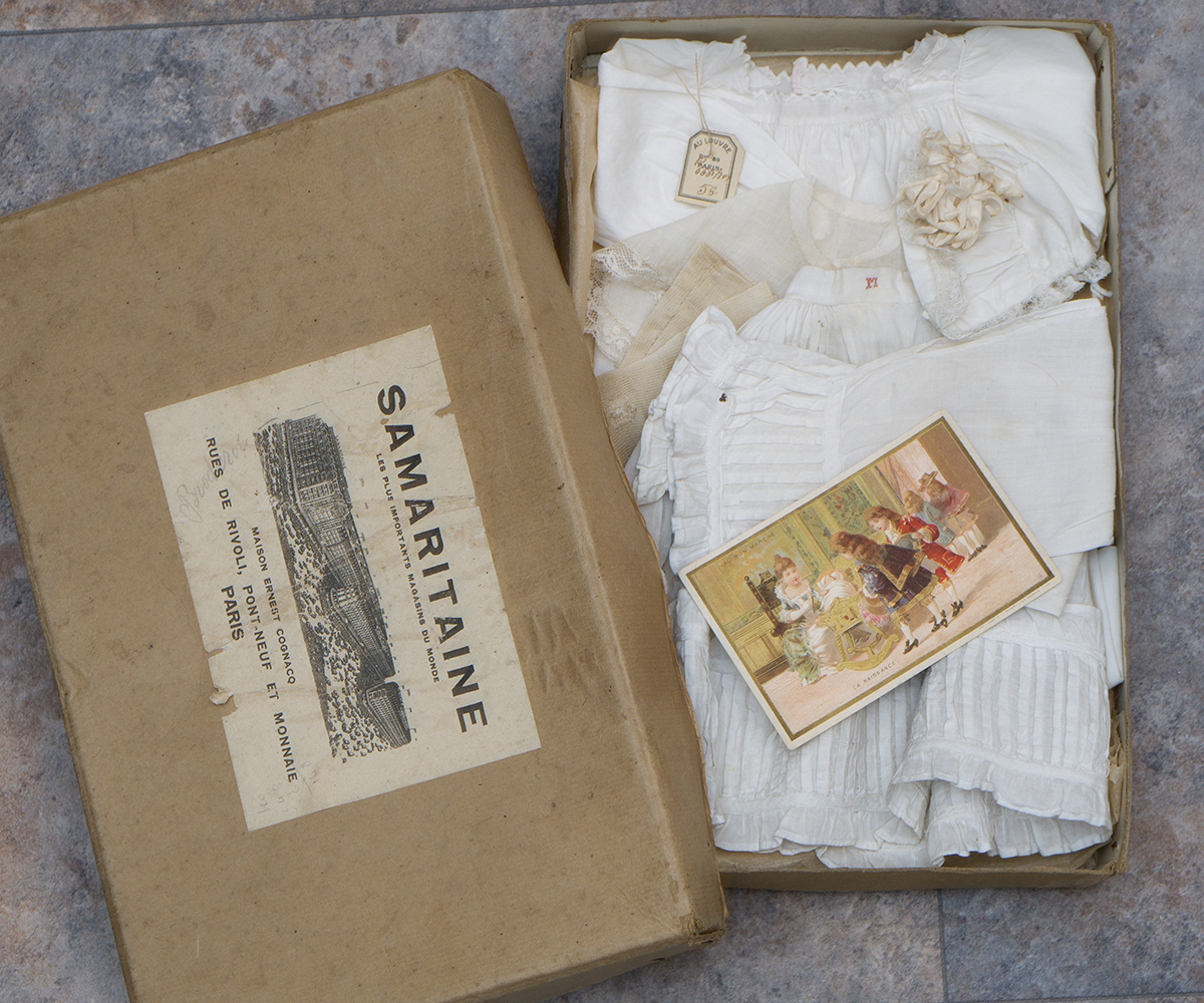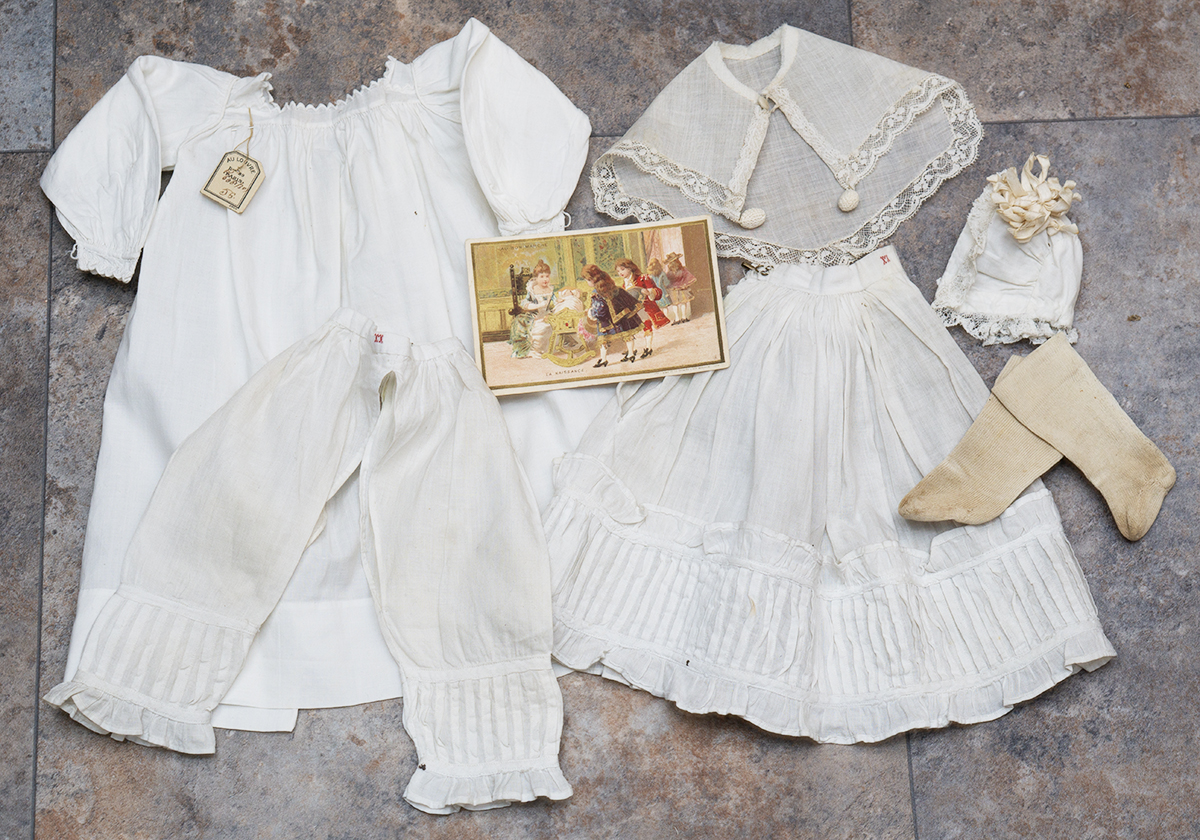 The set consist of 7 pieces: pantaloon, petticoat, bonnet, muslin shawl, night chemise, socks and trade card. All pieces are hand stitched!! The set for sale in the french SAMARITANE presentation box. 1/ Antique cotton Huret style night chemise has long sleeves, closure at the back with pearl button. Measures 12 1/2" (32cm) length. 6" (15 cm) sleeve, 4 1/2" (12cm) shoulders. 2/ A very full antique white muslin petticoat with wide pleated hem has red embroidered "M" monogram, closure at the back with hook and eye. Measures 8 3/4" (22 cm) length, the waist 7" (18cm). 3/ Antique white muslin pantaloon decorated with wide pleated trim has red embroidered "M" monogram, closure with hook and eye. Measures 7" (18 cm) waist, 8 3/4" (22 cm) length. 4/ Antique cotton bonnet wit lace trim decorated with ivory silk rosette. Measures 3" (7.5 cm) wide inside. 5/ Antique muslin white shawl decorated with lace trim and two small cotton balls. Measures 5" (13cm) height at the back. 6/ Antique original cotton socks 4 1/2" (11cm) height 7/ Antique original trade card AU BON MARCHE PARIS - 4 3/4" (12 cm) length, 3 1/2" (8 cm) height. Measures of the box 12 3/4" (33cm) x 8 1/2" (22cm) x 2 1/2" (7cm)/. The clothing is in good never - used condition , all hand made and perfect for your Huret or Rohmer doll trousseau. Suitable for early size 4 fashion doll like Huret , Rohmer or other. France, Paris, c.1890. International shipping cost by UPS $55.00 ------------------------------------ I DO A LAYAWAY NO STATE SALES TAX! Thanks for your visit to Respectfulbear doll shop!