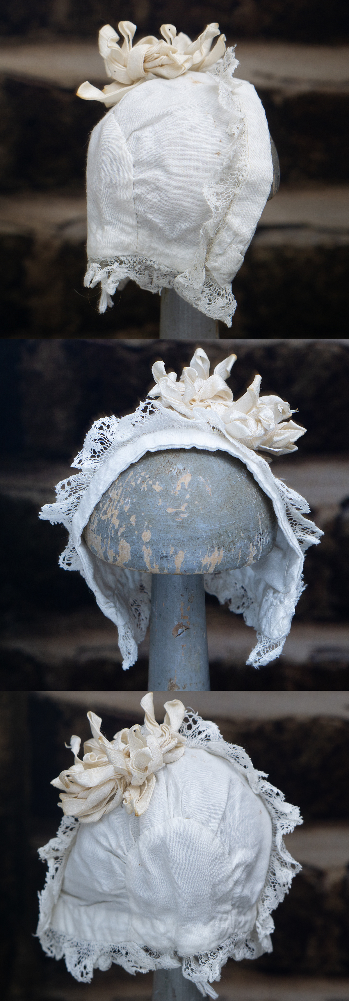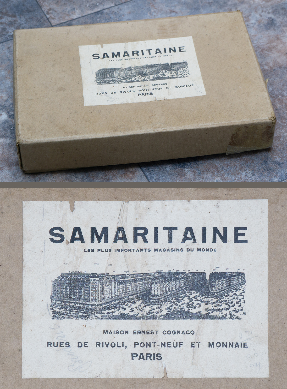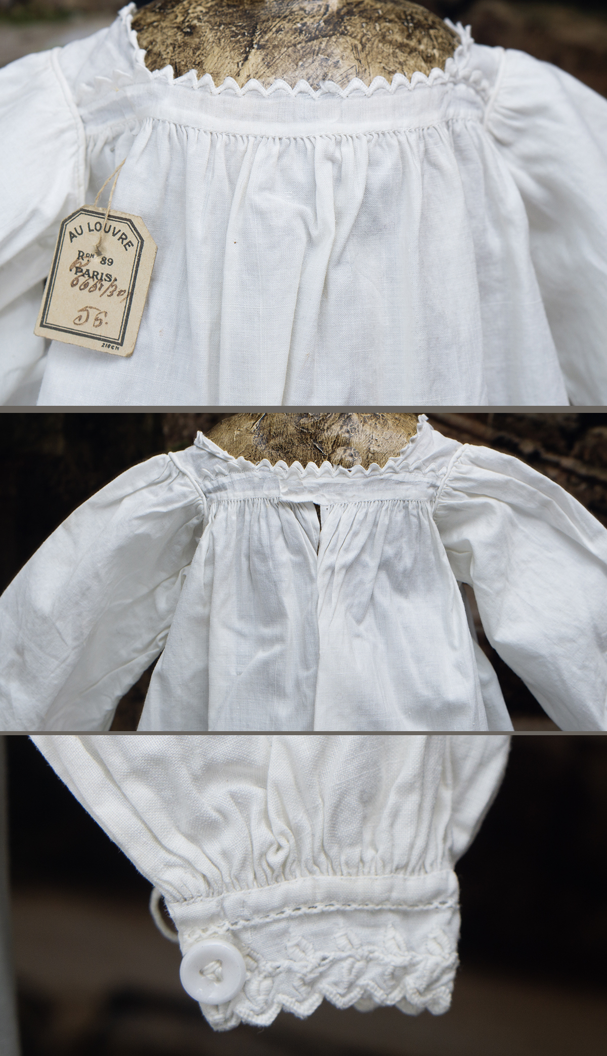 The set consist of 7 pieces: pantaloon, petticoat, bonnet, muslin shawl, night chemise, socks and trade card. All pieces are hand stitched!! The set for sale in the french SAMARITANE presentation box. 1/ Antique cotton Huret style night chemise has long sleeves, closure at the back with pearl button. Measures 12 1/2" (32cm) length. 6" (15 cm) sleeve, 4 1/2" (12cm) shoulders. 2/ A very full antique white muslin petticoat with wide pleated hem has red embroidered "M" monogram, closure at the back with hook and eye. Measures 8 3/4" (22 cm) length, the waist 7" (18cm). 3/ Antique white muslin pantaloon decorated with wide pleated trim has red embroidered "M" monogram, closure with hook and eye. Measures 7" (18 cm) waist, 8 3/4" (22 cm) length. 4/ Antique cotton bonnet wit lace trim decorated with ivory silk rosette. Measures 3" (7.5 cm) wide inside. 5/ Antique muslin white shawl decorated with lace trim and two small cotton balls. Measures 5" (13cm) height at the back. 6/ Antique original cotton socks 4 1/2" (11cm) height 7/ Antique original trade card AU BON MARCHE PARIS - 4 3/4" (12 cm) length, 3 1/2" (8 cm) height. Measures of the box 12 3/4" (33cm) x 8 1/2" (22cm) x 2 1/2" (7cm)/. The clothing is in good never - used condition , all hand made and perfect for your Huret or Rohmer doll trousseau. Suitable for early size 4 fashion doll like Huret , Rohmer or other. France, Paris, c.1890. International shipping cost by UPS $55.00 ------------------------------------ I DO A LAYAWAY NO STATE SALES TAX! Thanks for your visit to Respectfulbear doll shop!
