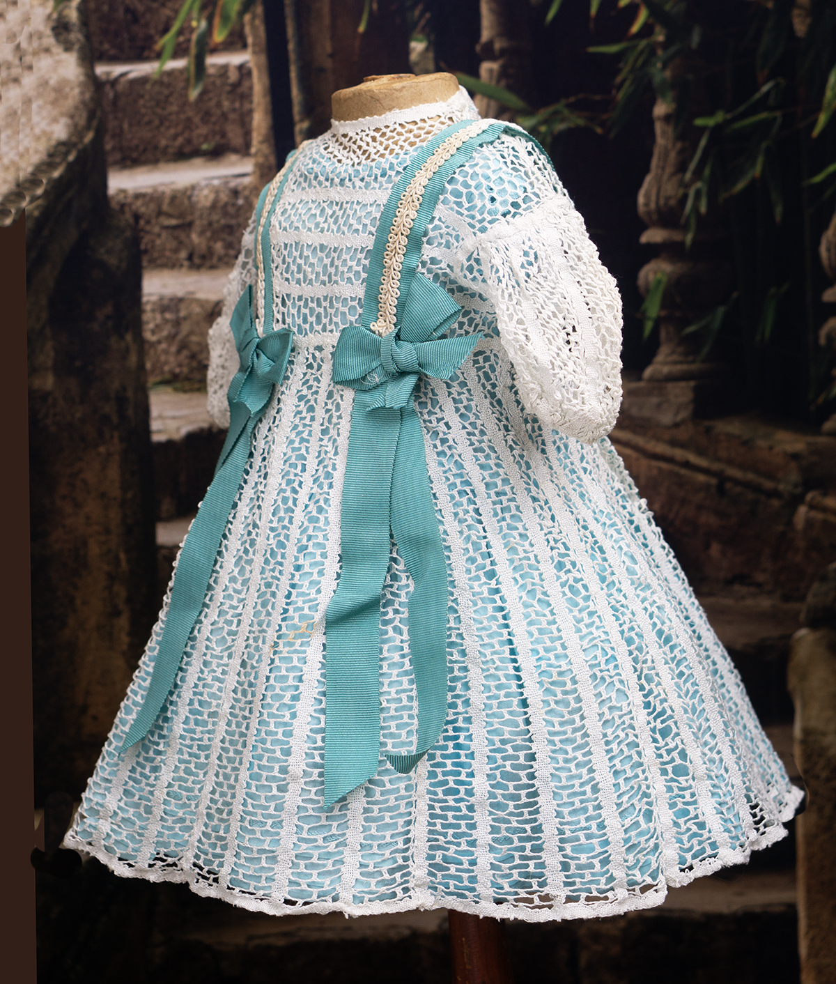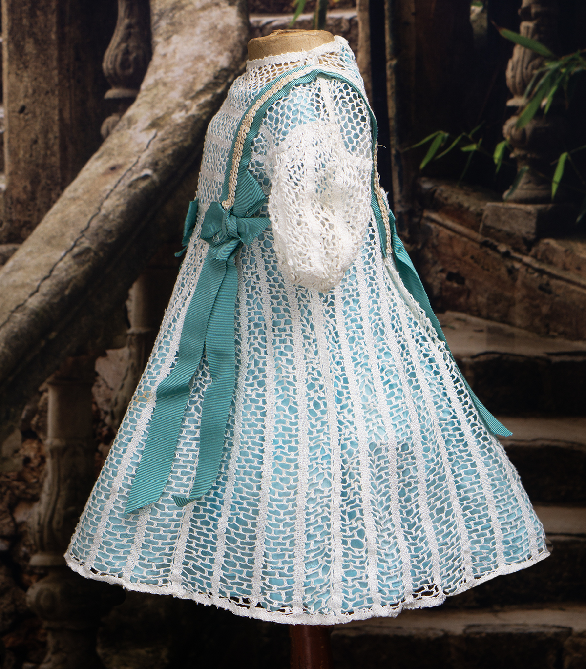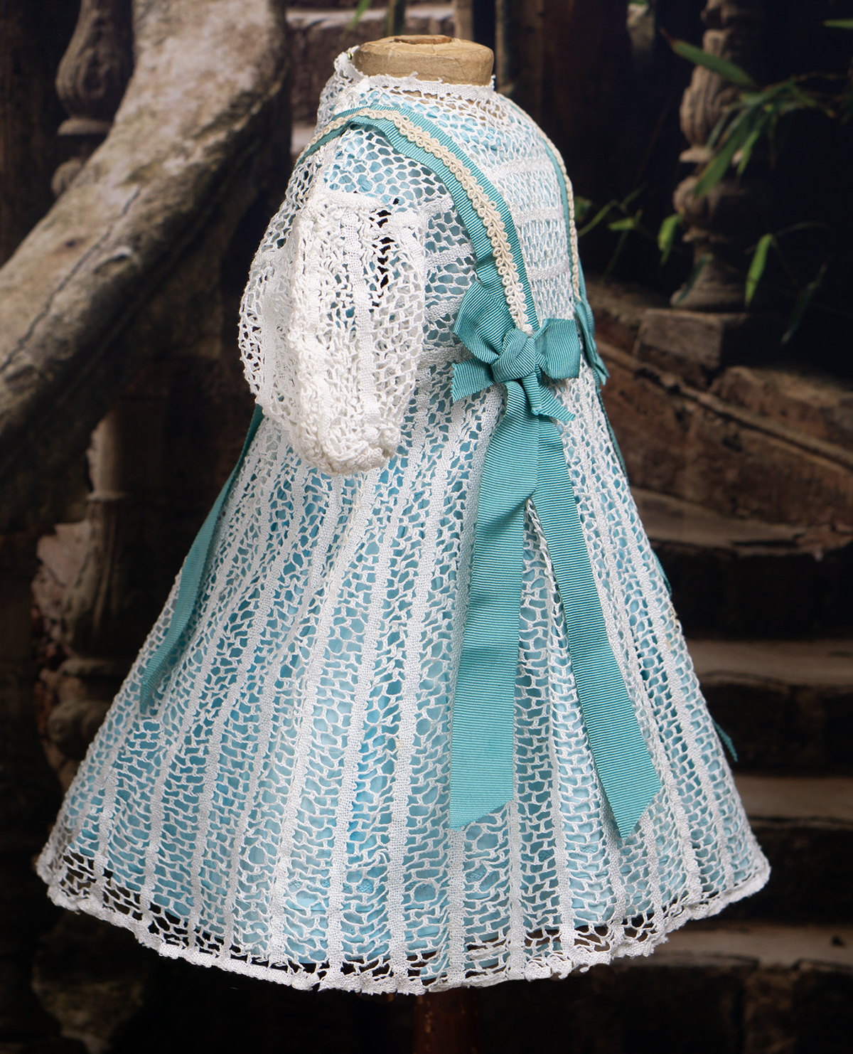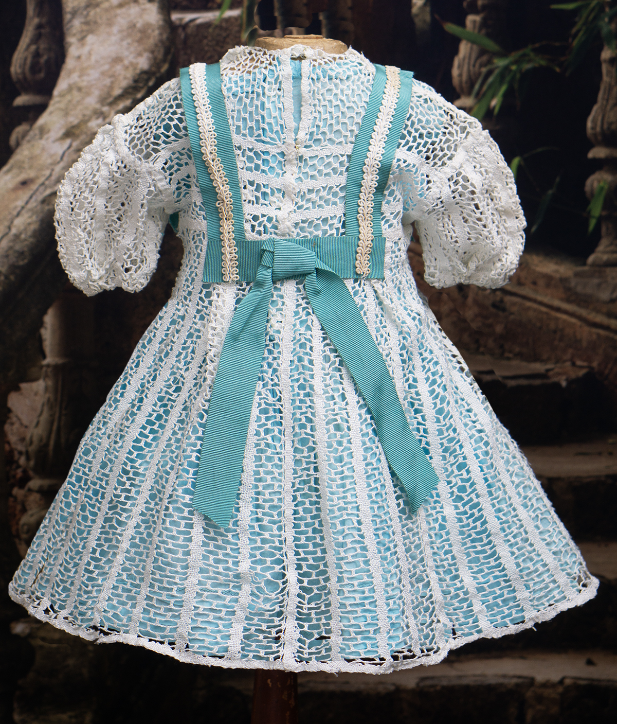 Very beautiful two-pieces doll outfit consist of white open work cotton lace dress and separate light blue cotton chemise. The dress is made of airy white openwork lace with a beautiful structured pattern. It has short puff sleeves and rounded neckline, scalloped hem.