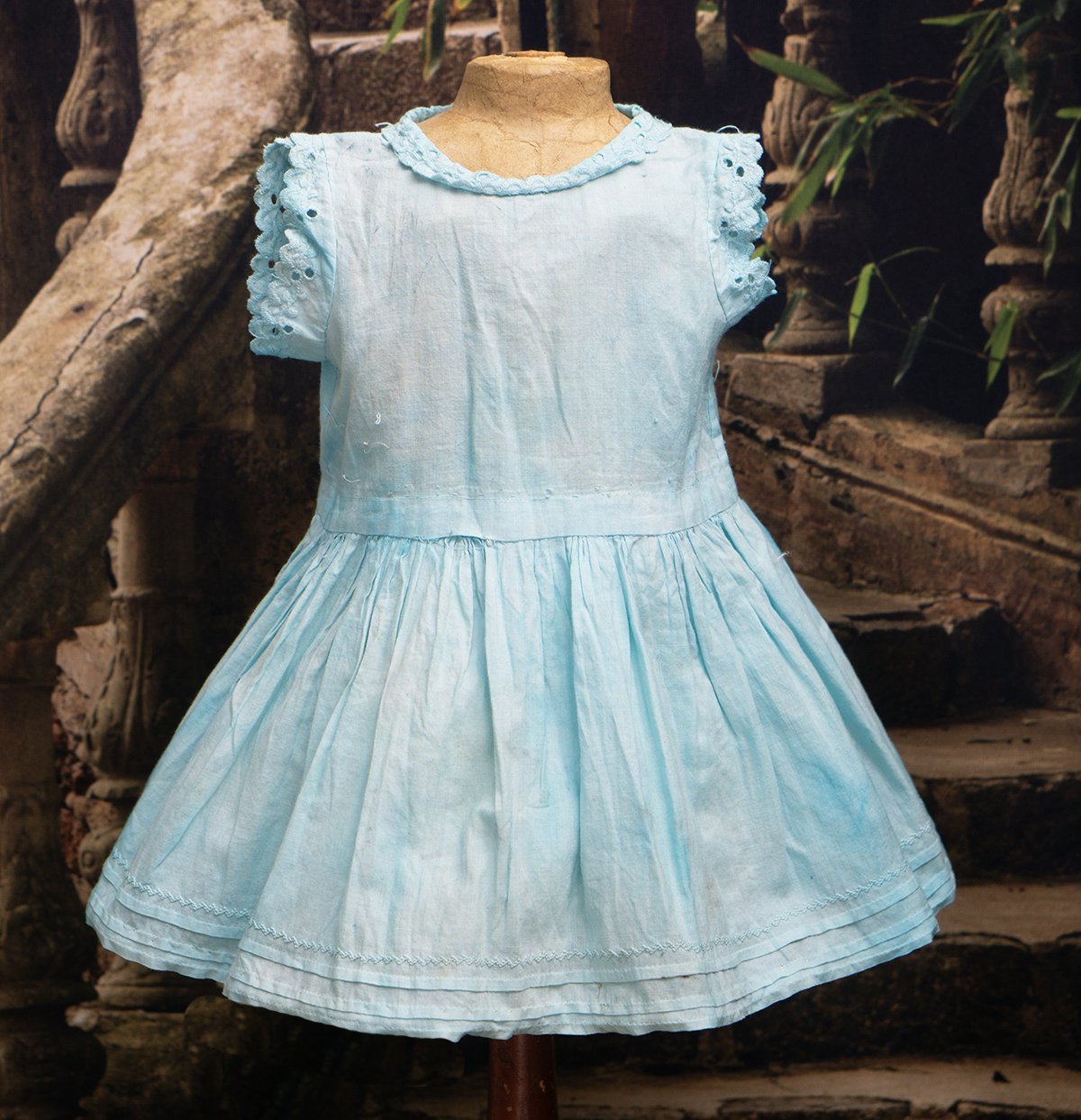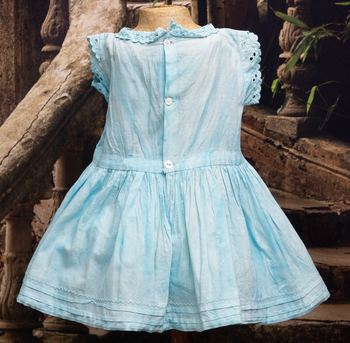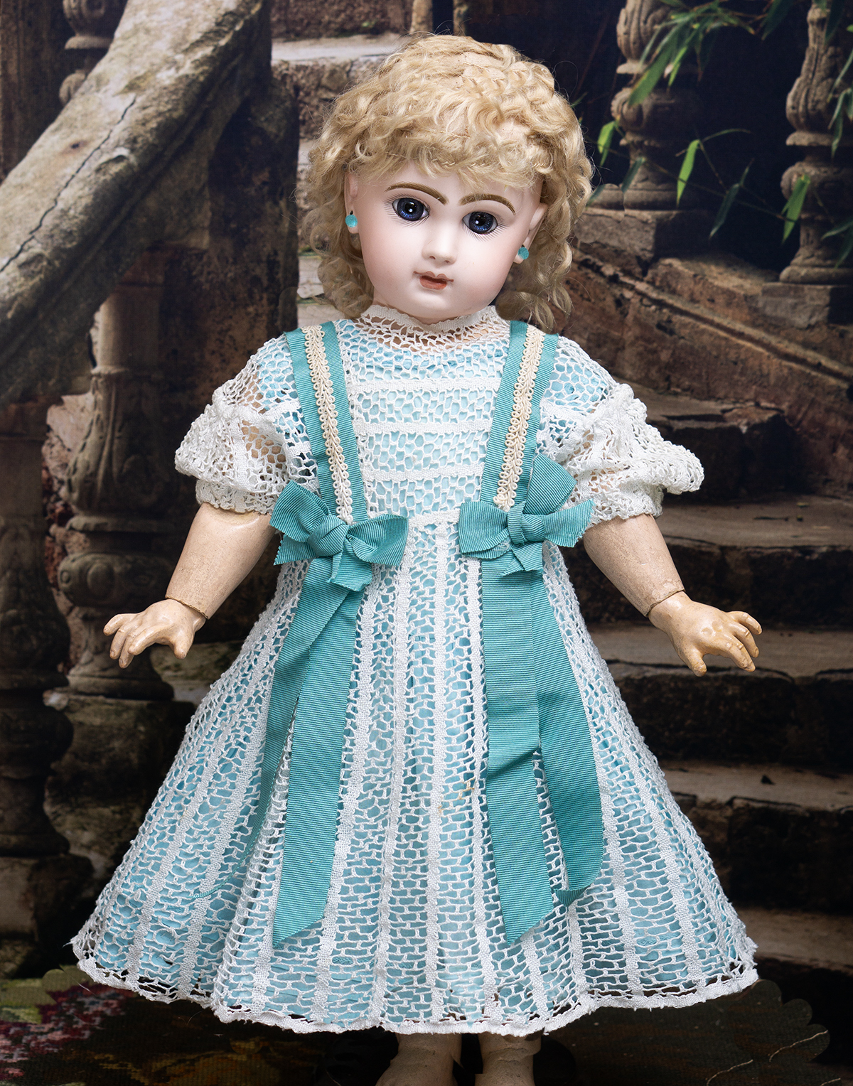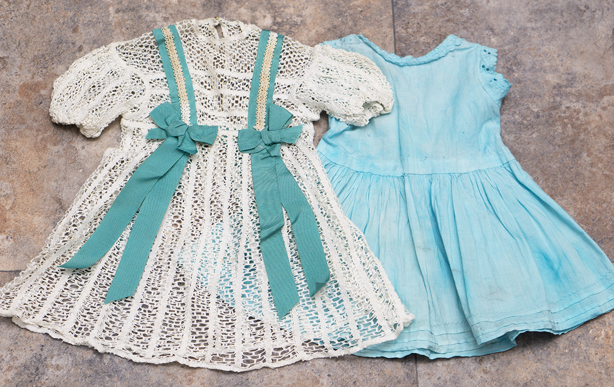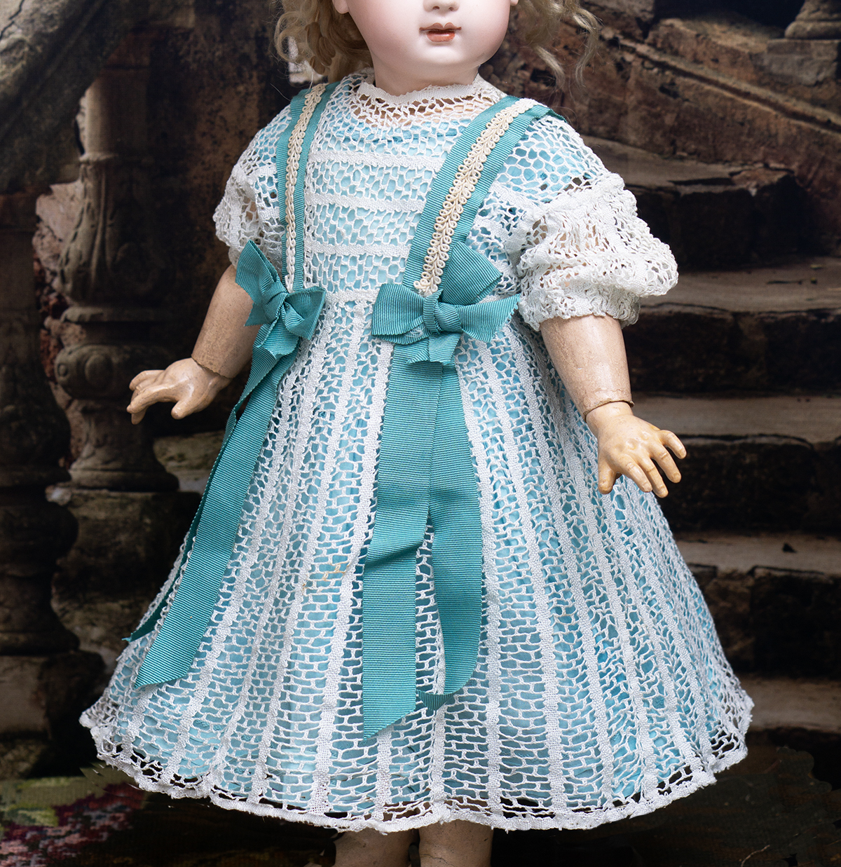 Very beautiful two-pieces doll outfit consist of white open work cotton lace dress and separate light blue cotton chemise. The dress is made of airy white openwork lace with a beautiful structured pattern. It has short puff sleeves and rounded neckline, scalloped hem.