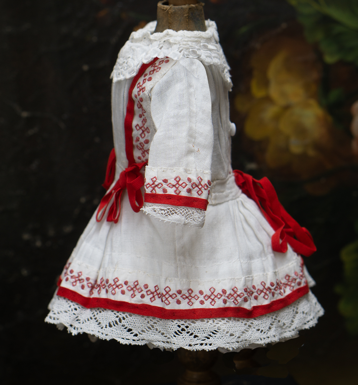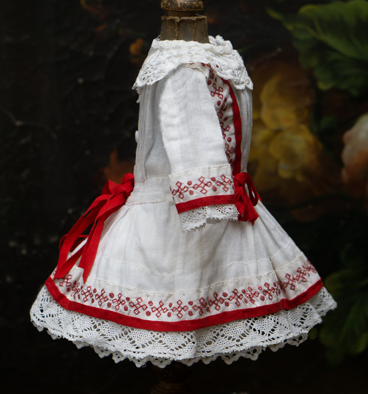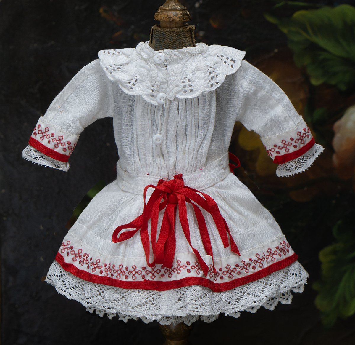 The dress has matching original cotton petticoat. Very good condition to age. Fit for doll about 11-12" tall (28-31 cm) Measures the dress 6 3/4" (17 cm) length, 3 1/4" (8.5 cm) sleeve, 4" (10 cm) shoulders, 8" (20cm) waist. The petticoat 4" (10cm) length. Intrenational shipping cost $45.00 ------------------------------------ I DO A LAYAWAY NO STATE SALES TAX! Thanks for your visit to Respectfulbear doll shop!