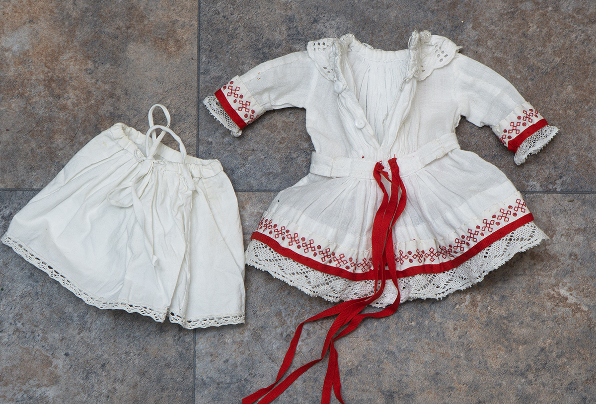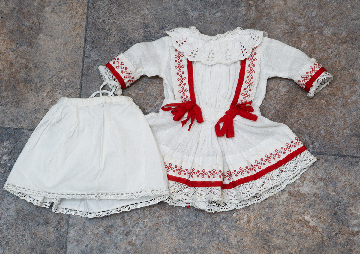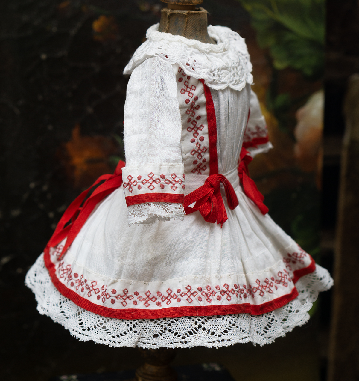The dress has matching original cotton petticoat. Very good condition to age. Fit for doll about 11-12" tall (28-31 cm) Measures the dress 6 3/4" (17 cm) length, 3 1/4" (8.5 cm) sleeve, 4" (10 cm) shoulders, 8" (20cm) waist. The petticoat 4" (10cm) length. Intrenational shipping cost $45.00 ------------------------------------ I DO A LAYAWAY NO STATE SALES TAX! Thanks for your visit to Respectfulbear doll shop!