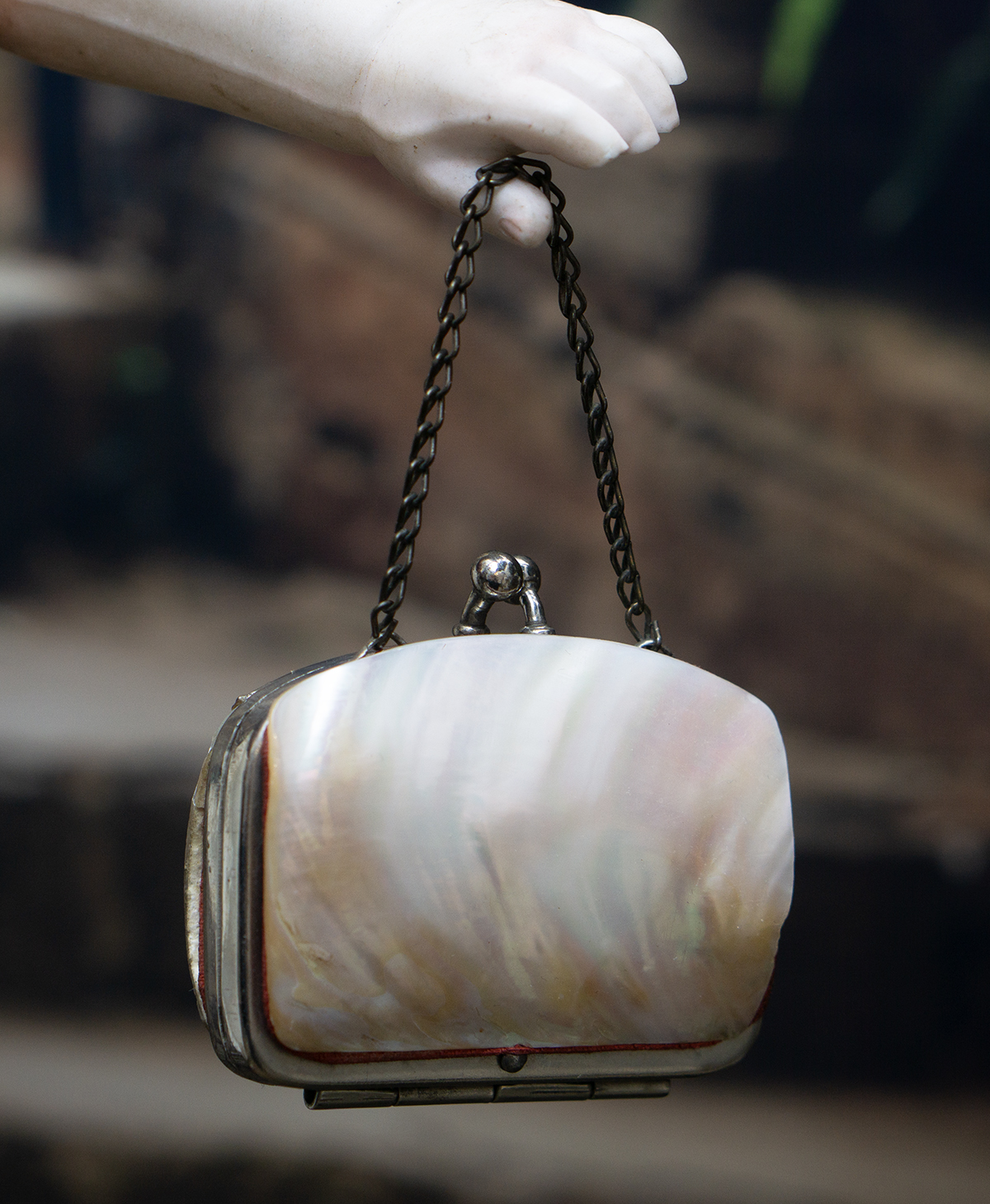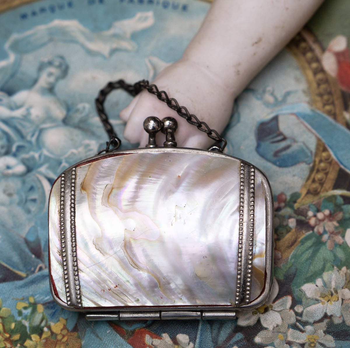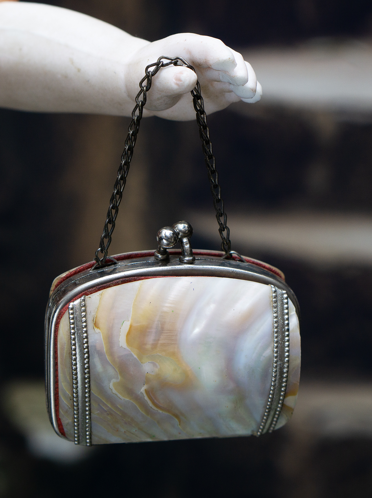 his is a very lovely small Mother of Pearl purse for fashion doll.