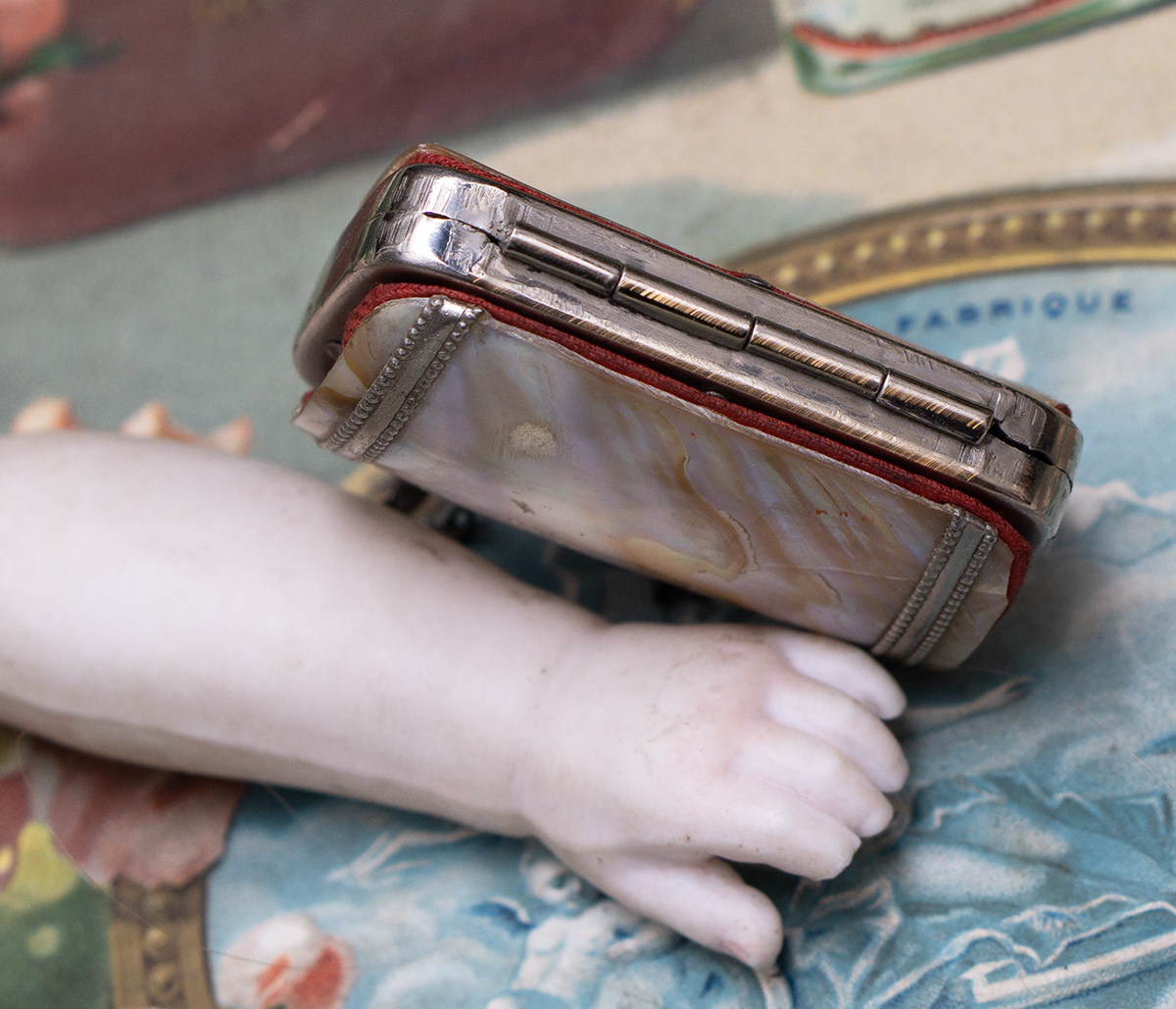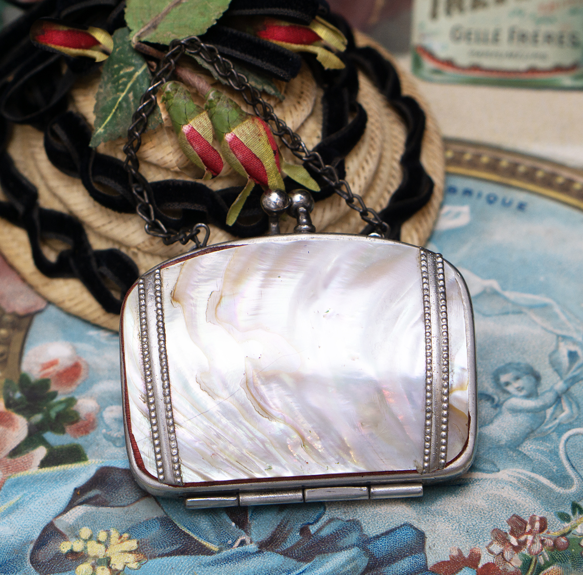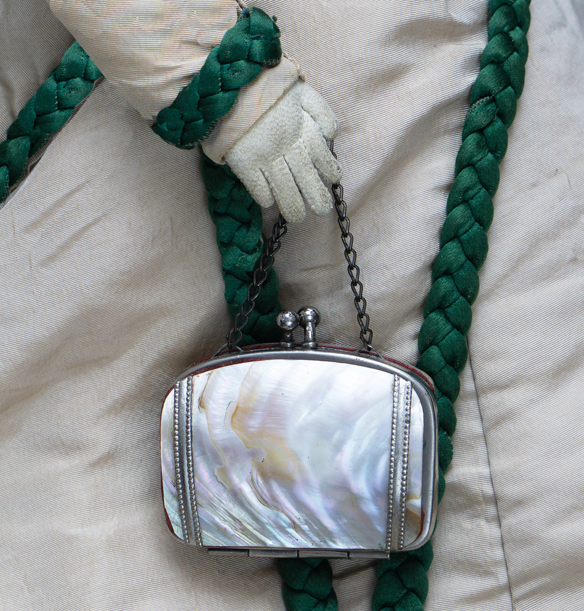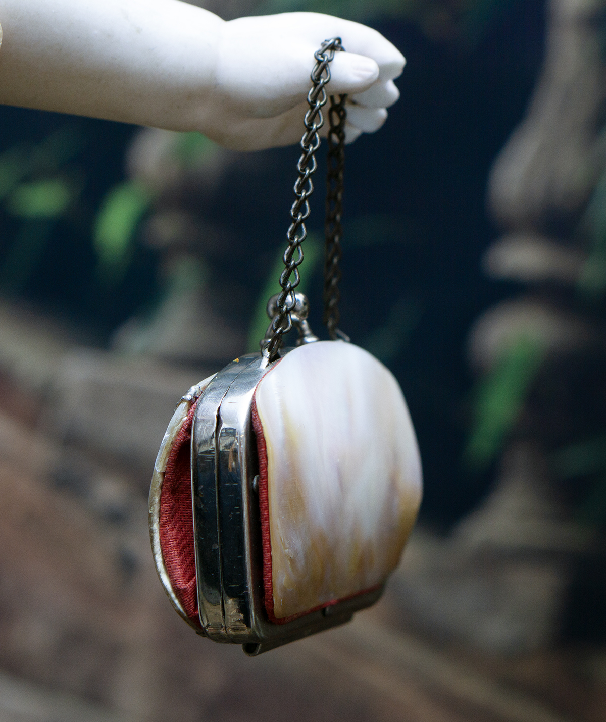 his is a very lovely small Mother of Pearl purse for fashion doll.