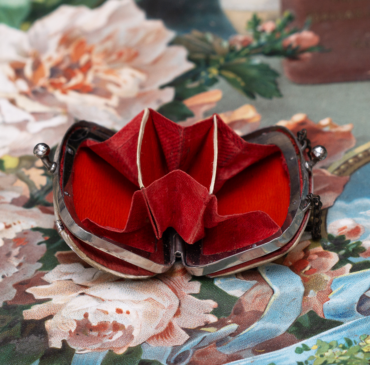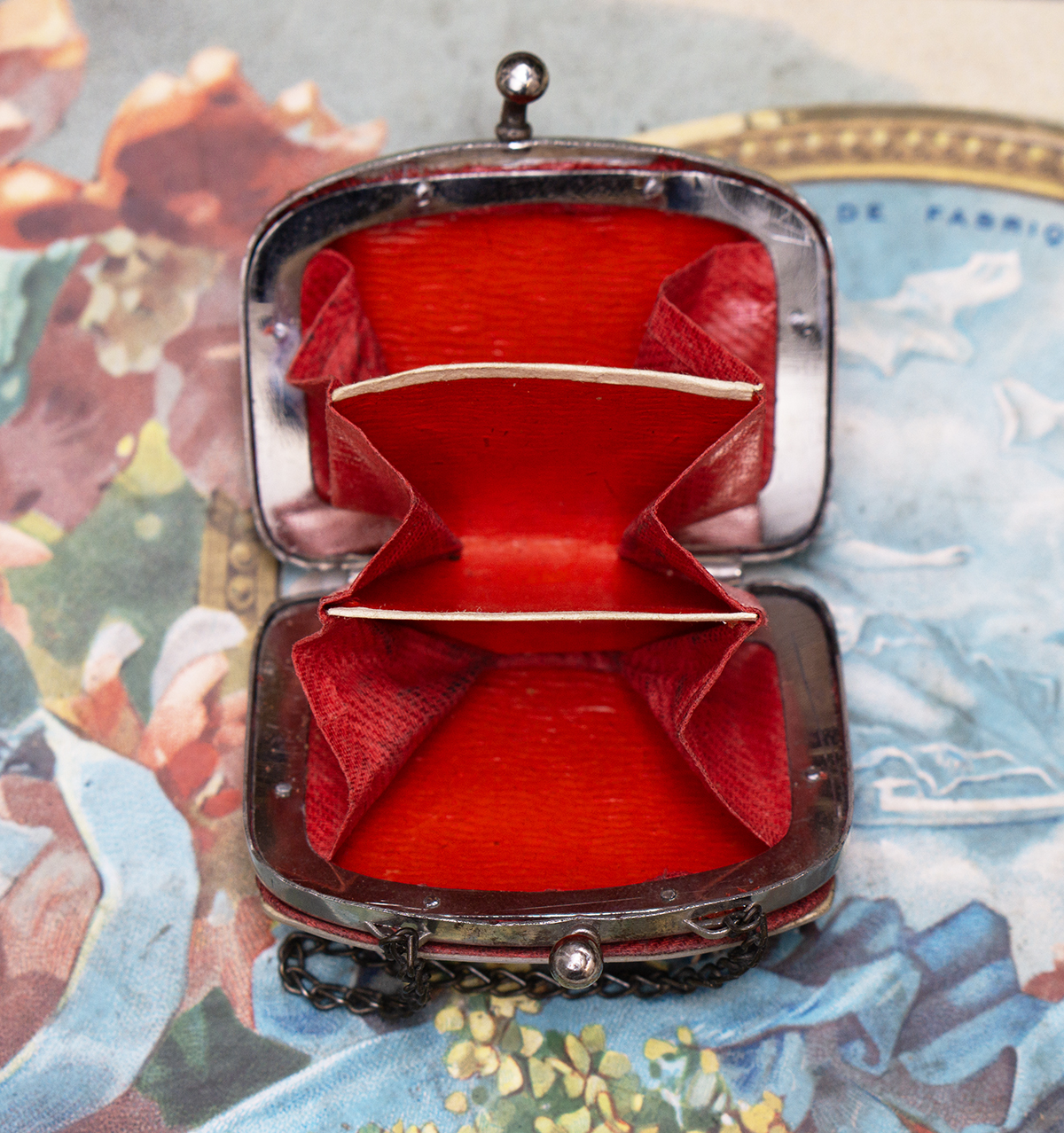 The red interior and the chain are original. Very good condition. Measures length 2 1/4 by 1 3/4 inches height (5.5 x 4,5 cm) and 3 1/2 inches(9cm) to top of chain. International shipping cost 45 USD. ------------------------------------ I DO A LAYAWAY NO STATE SALES TAX! Thanks for your visit to Respectfulbear doll shop!