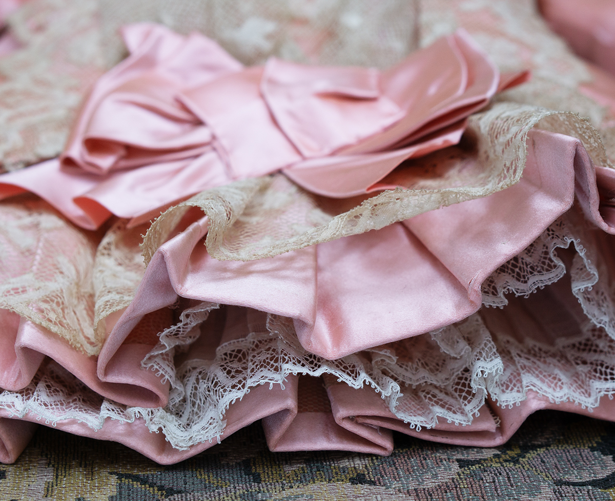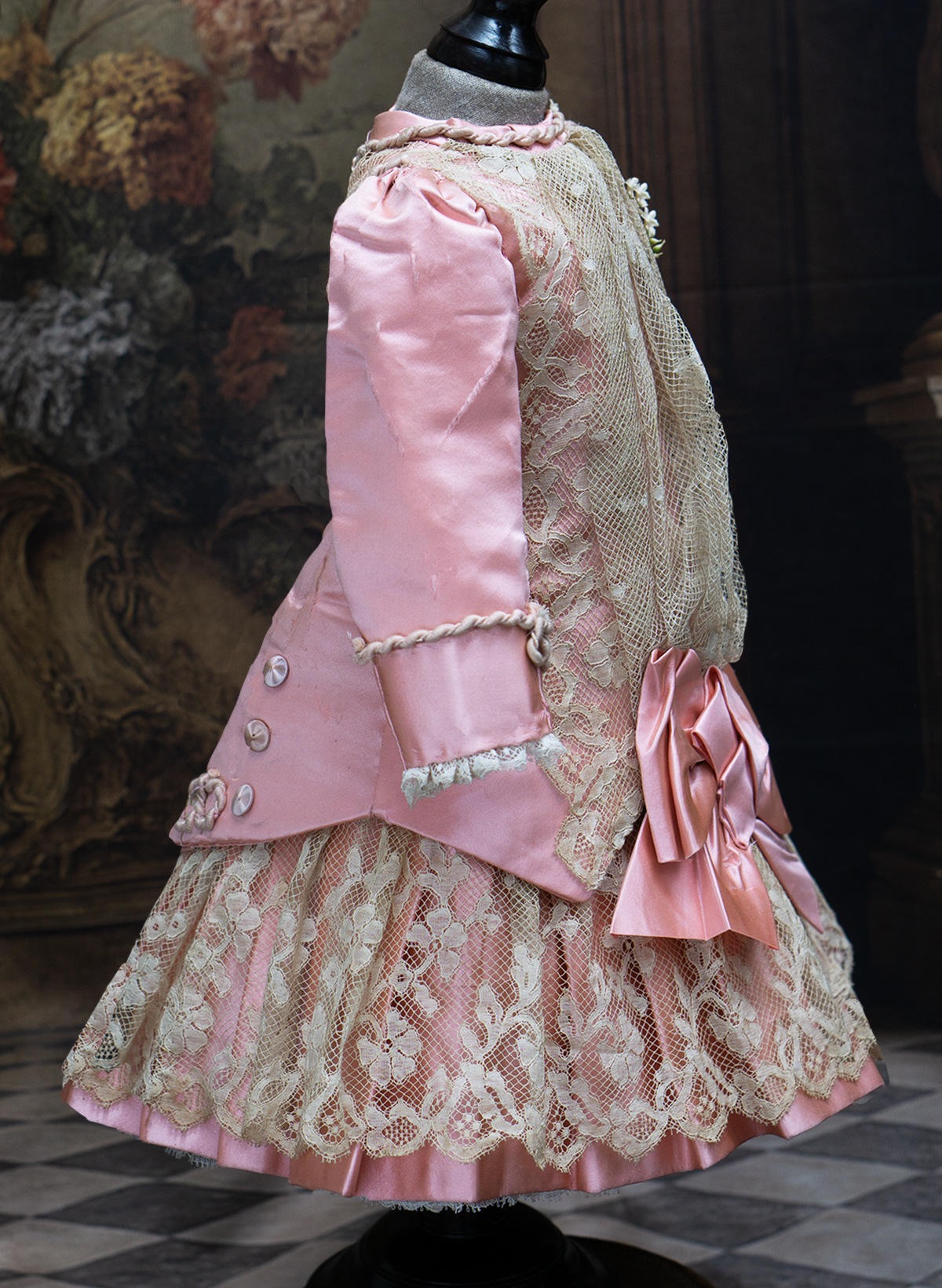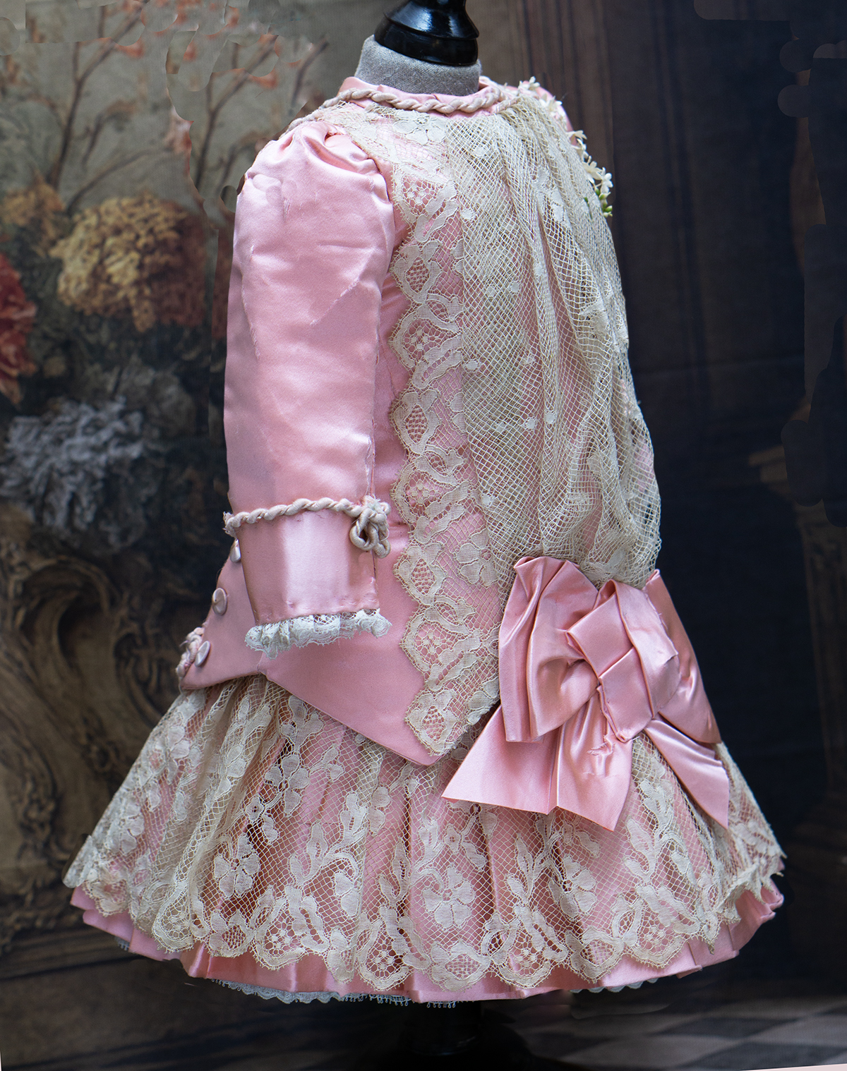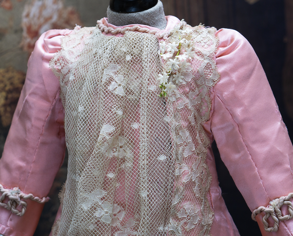 Wonderful salmon pink silk satin dress features dropped waist, long coat sleeves, an insert plastron with gathered lace, silk skirt pleats with lace covered, closure at the front with hook and eyes, decorated with beautiful net lace, small silk buttons, flowers, silk cord, large silk satin bow at the front, with muslin petticoat inside. Fully lined with tarlatan.