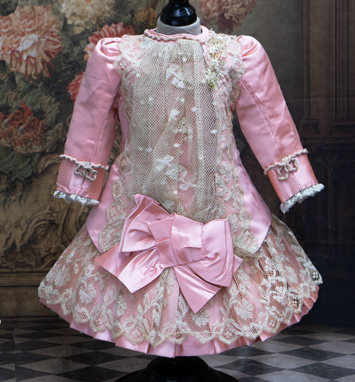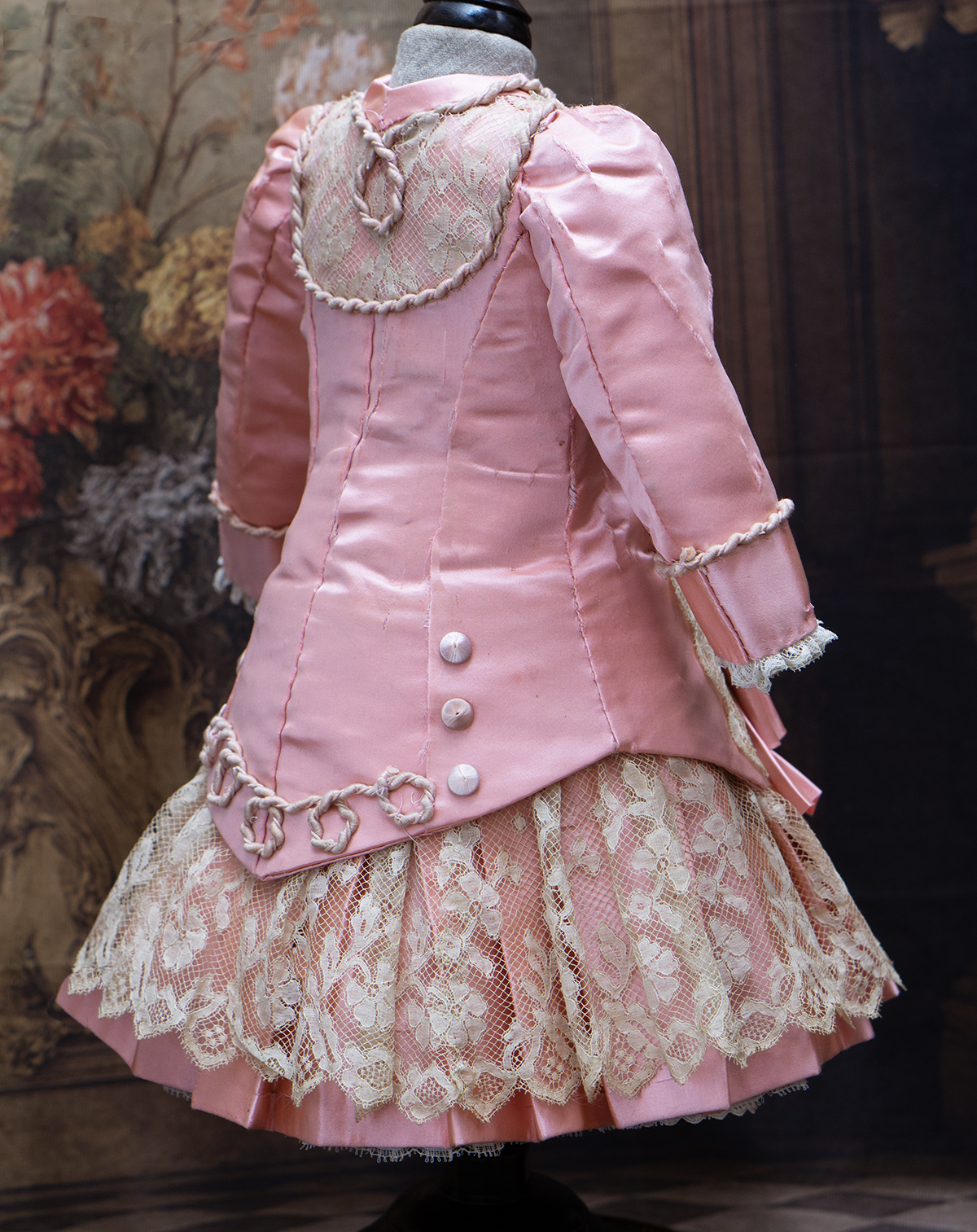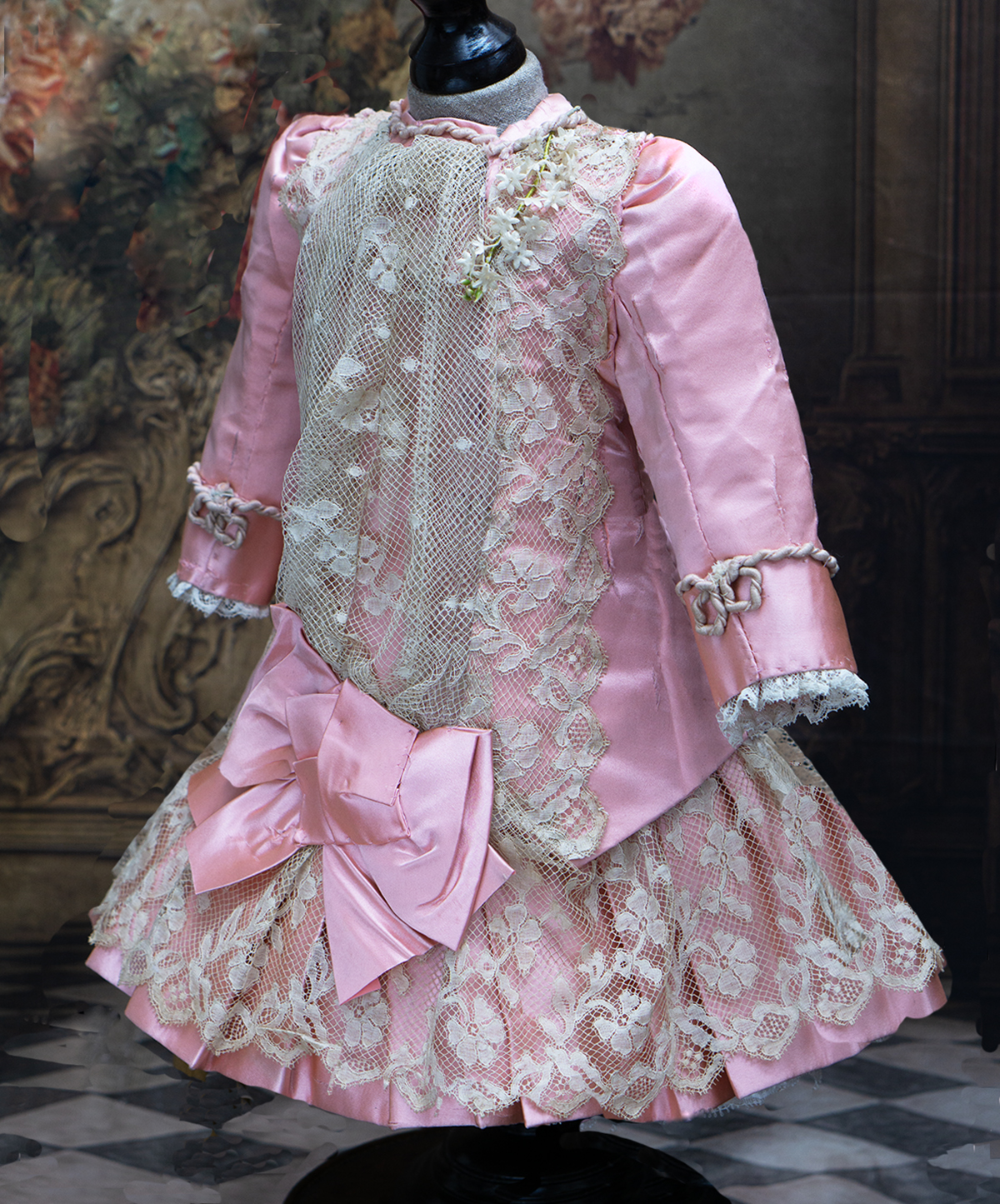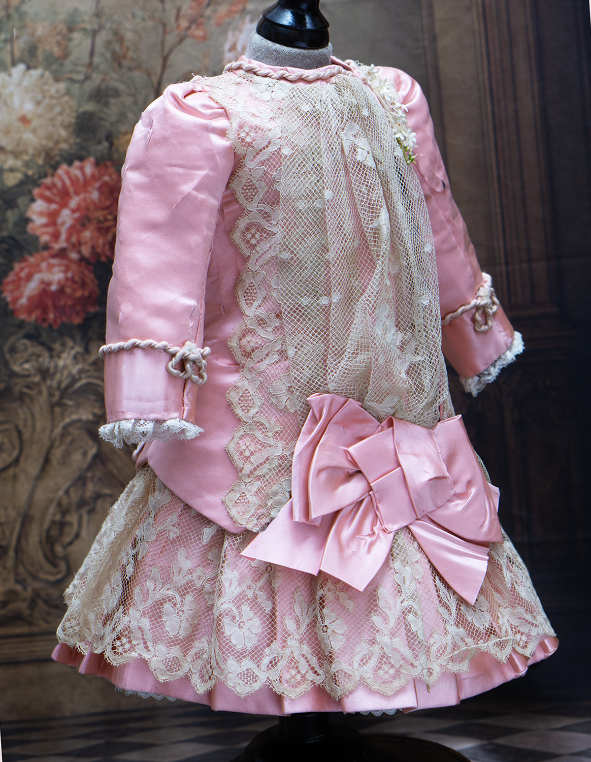 Wonderful salmon pink silk satin dress features dropped waist, long coat sleeves, an insert plastron with gathered lace, silk skirt pleats with lace covered, closure at the front with hook and eyes, decorated with beautiful net lace, small silk buttons, flowers, silk cord, large silk satin bow at the front, with muslin petticoat inside. Fully lined with tarlatan.