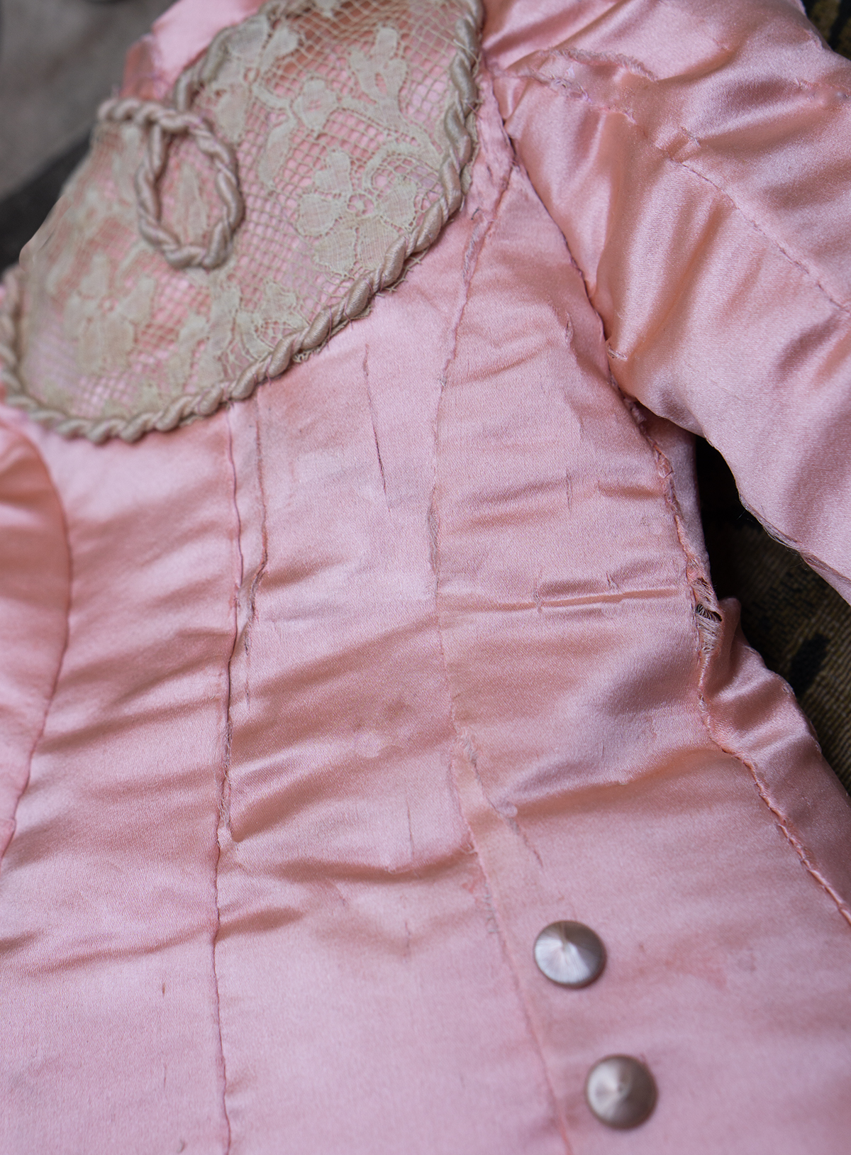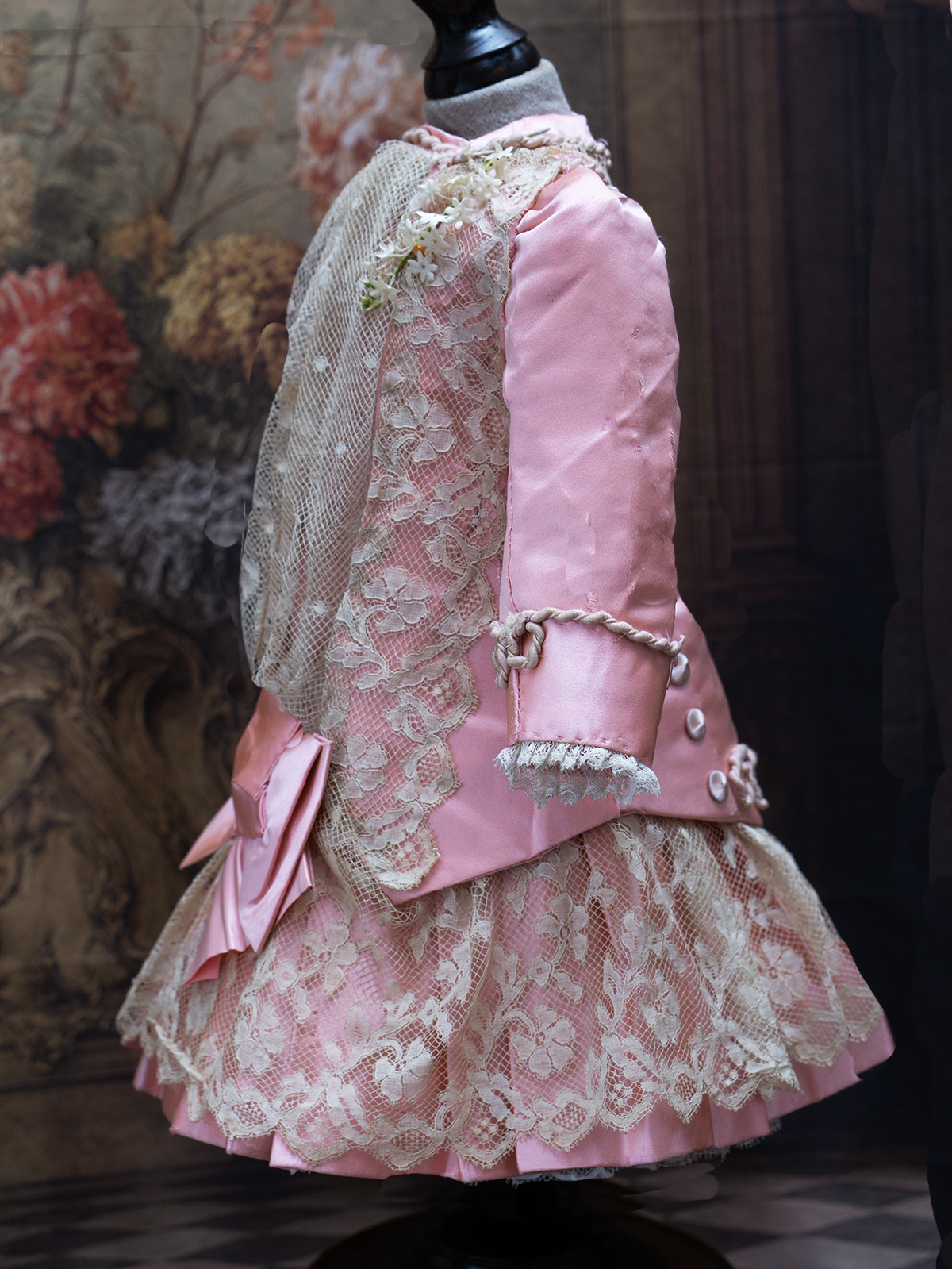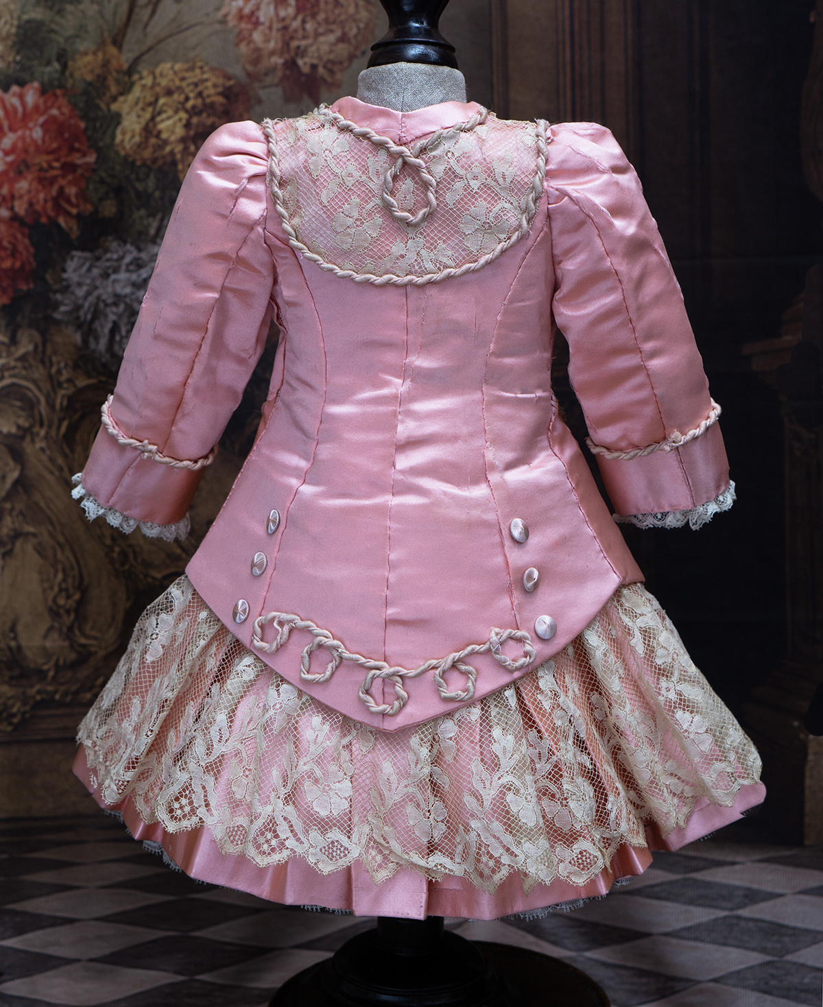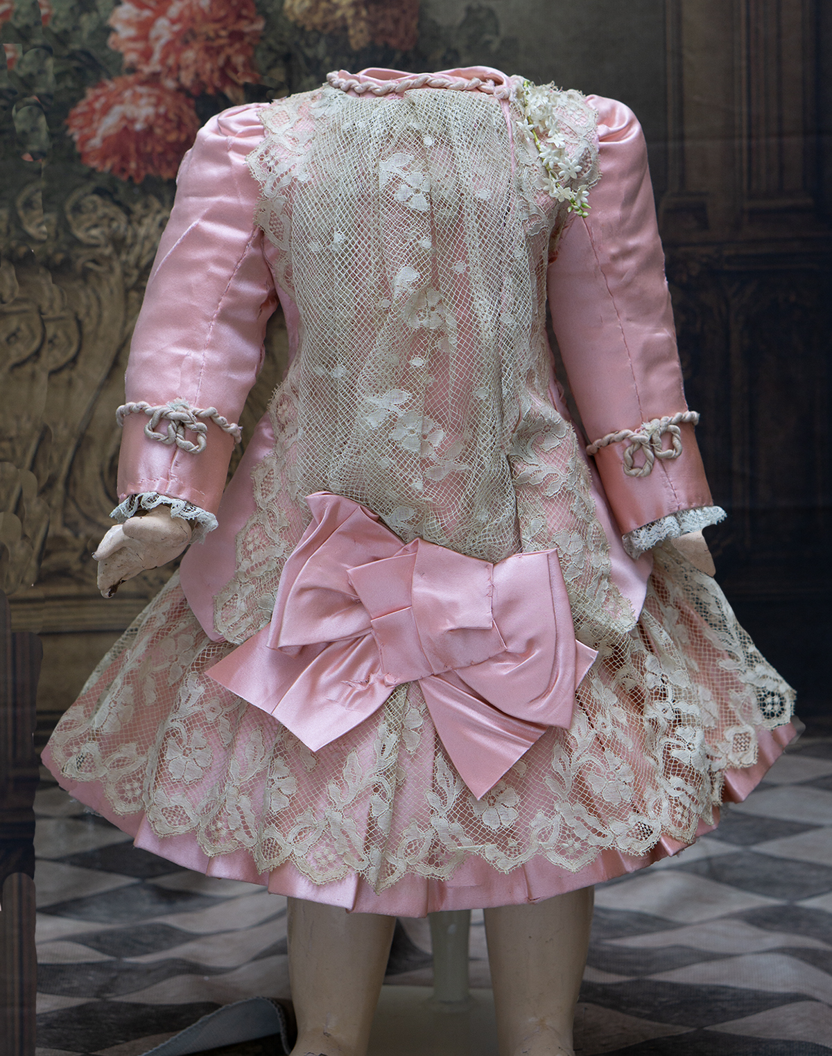 Wonderful salmon pink silk satin dress features dropped waist, long coat sleeves, an insert plastron with gathered lace, silk skirt pleats with lace covered, closure at the front with hook and eyes, decorated with beautiful net lace, small silk buttons, flowers, silk cord, large silk satin bow at the front, with muslin petticoat inside. Fully lined with tarlatan.