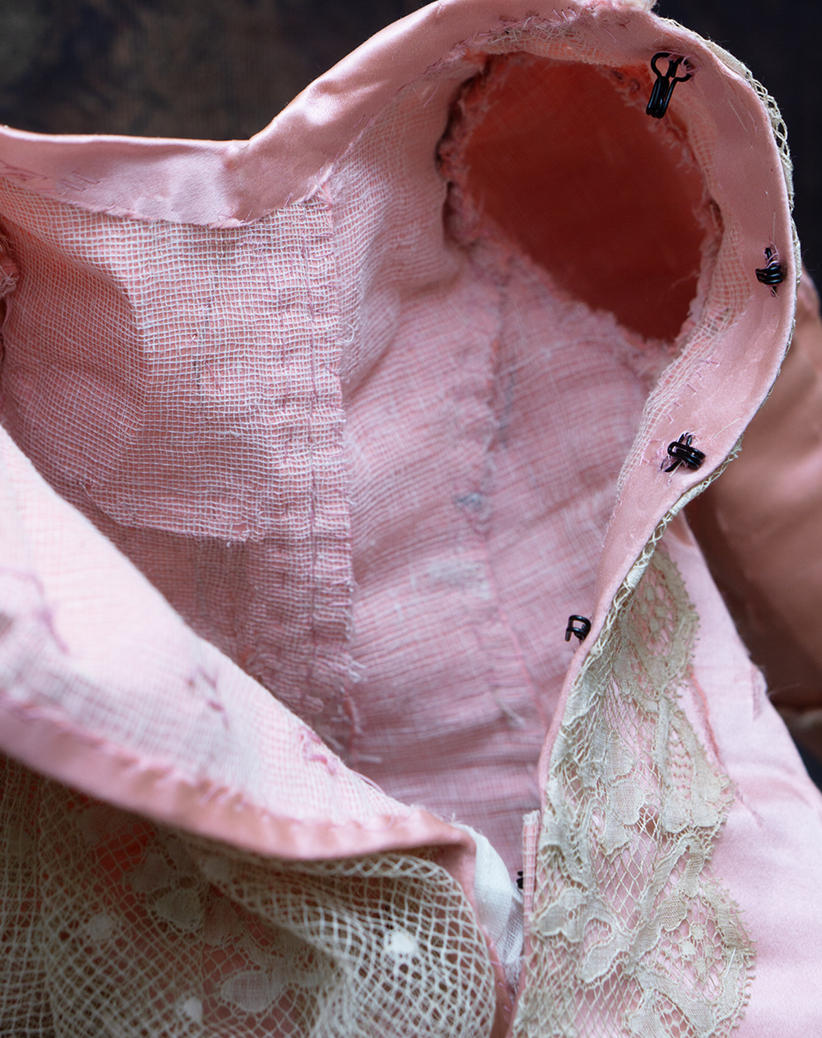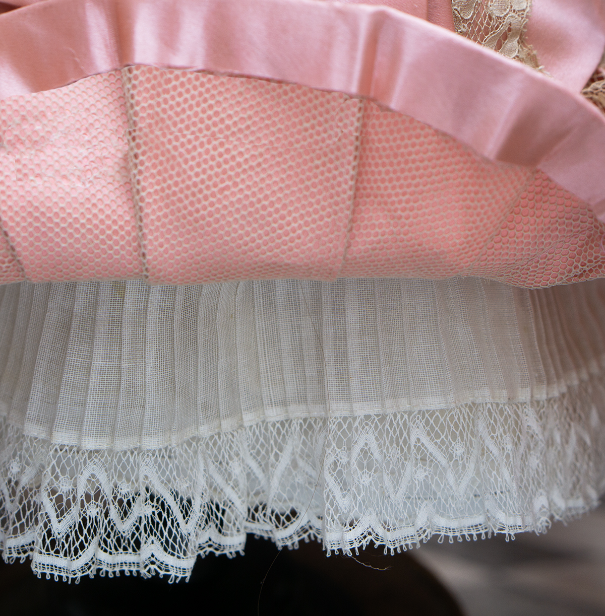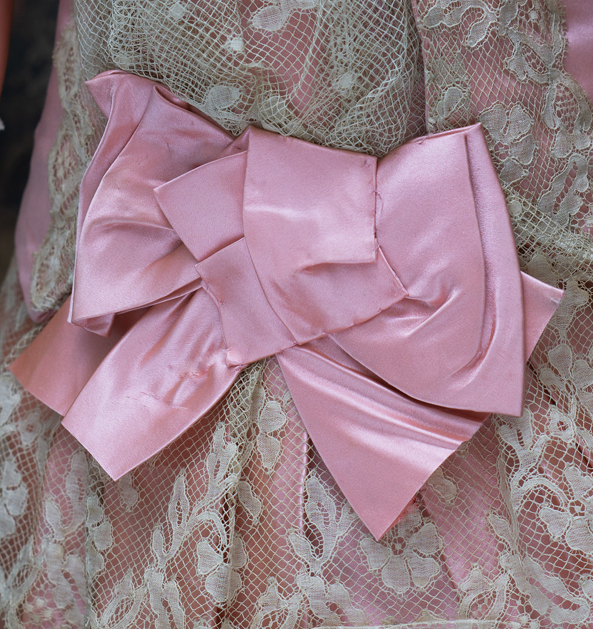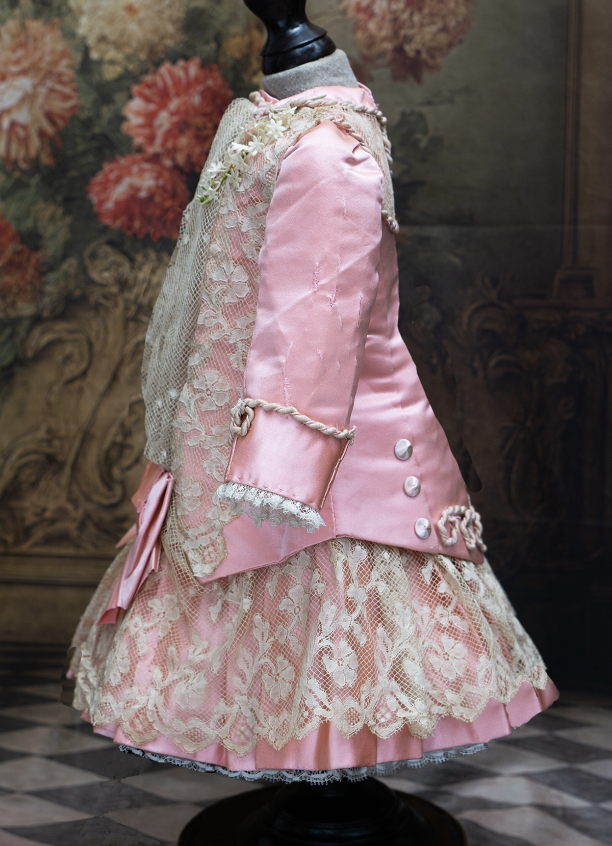 Wonderful salmon pink silk satin dress features dropped waist, long coat sleeves, an insert plastron with gathered lace, silk skirt pleats with lace covered, closure at the front with hook and eyes, decorated with beautiful net lace, small silk buttons, flowers, silk cord, large silk satin bow at the front, with muslin petticoat inside. Fully lined with tarlatan.