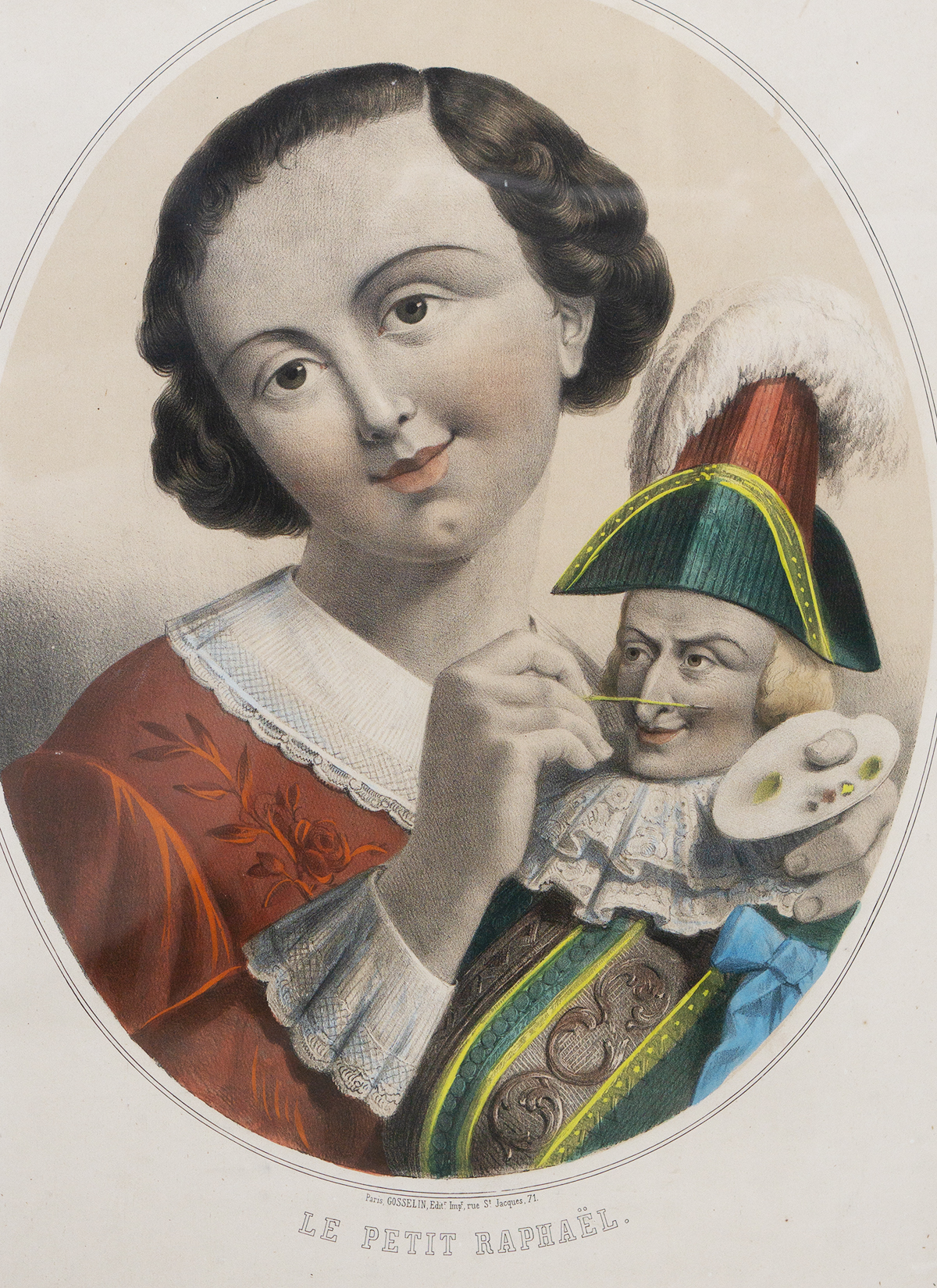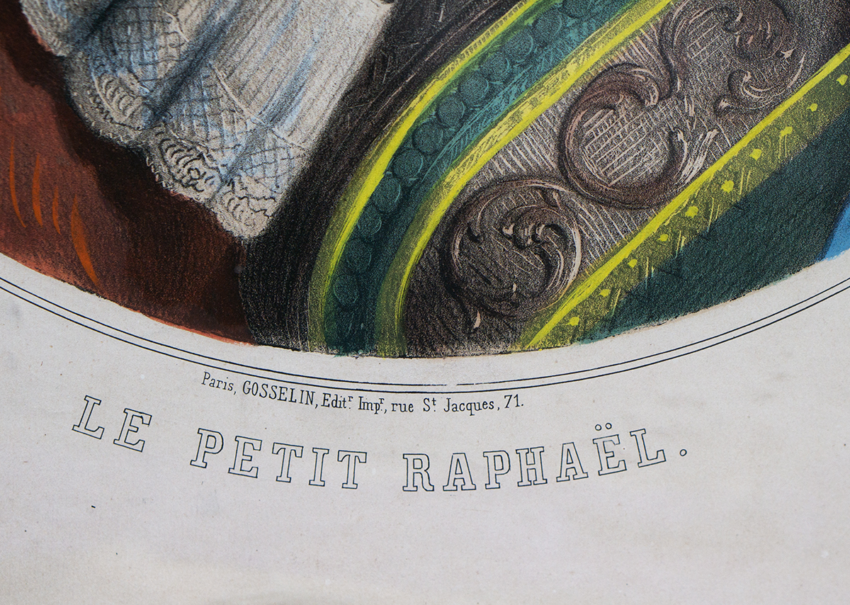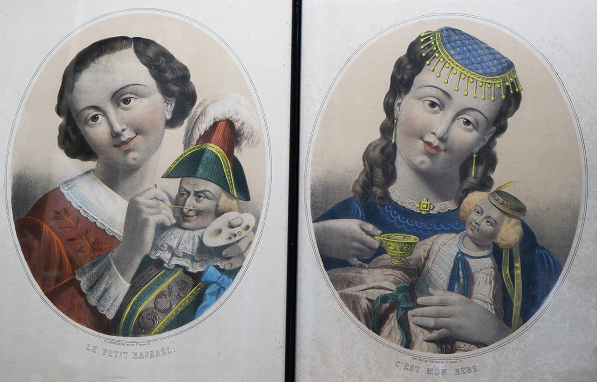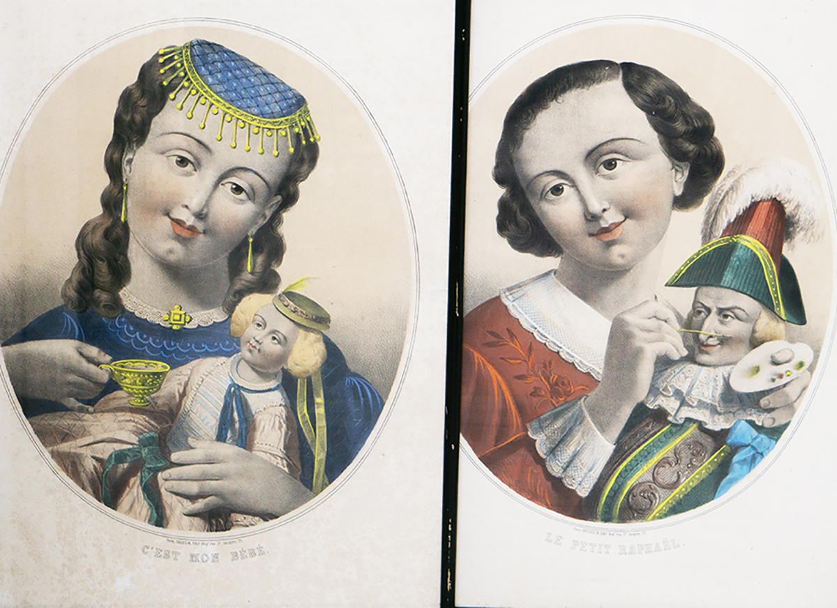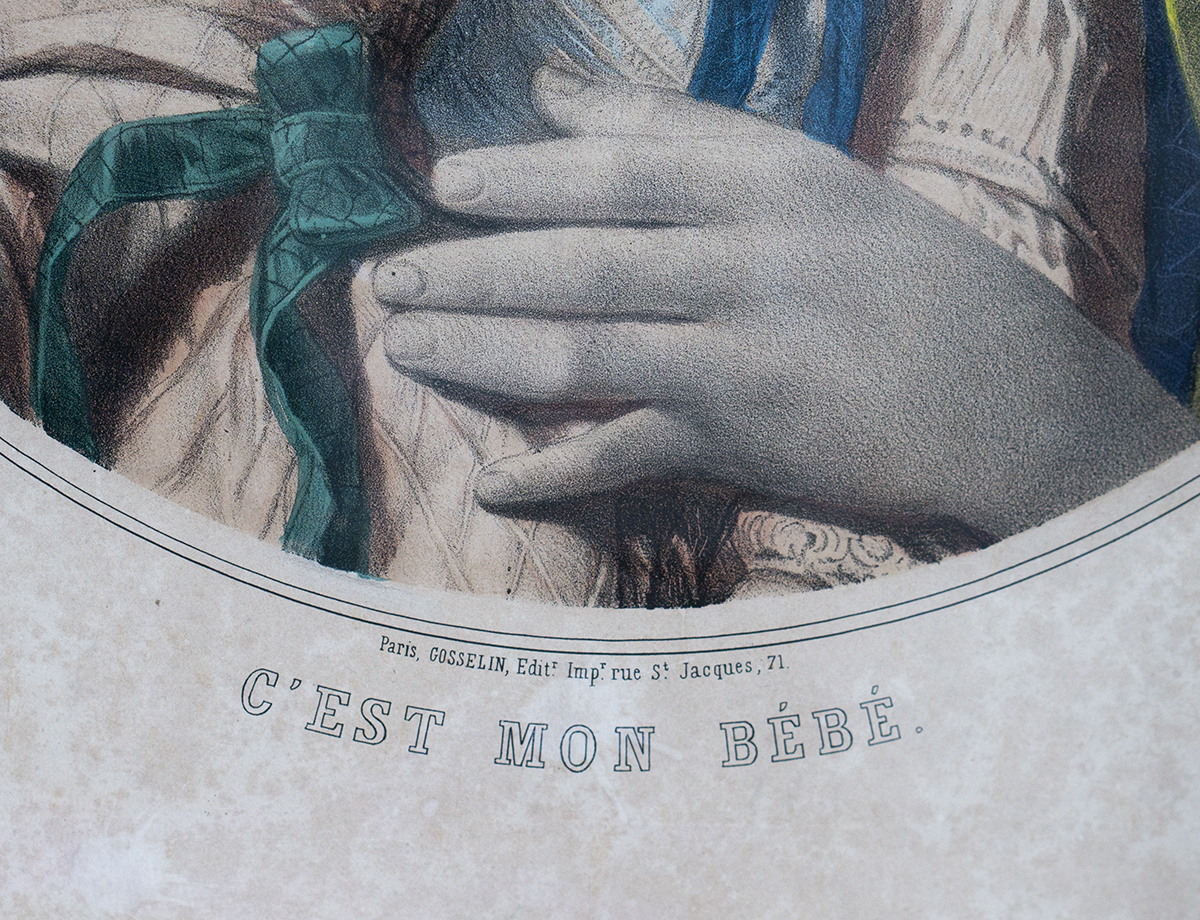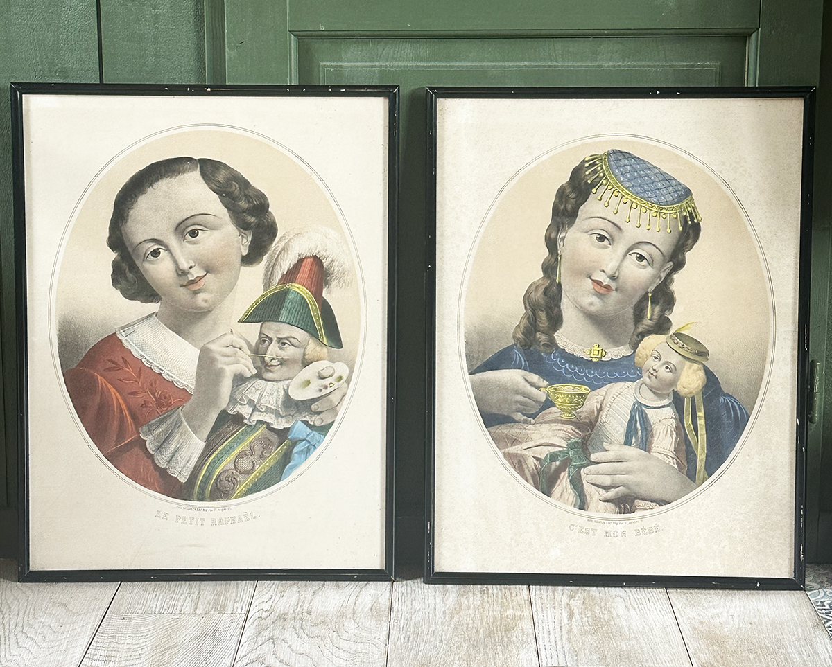 A beautiful and rare matching pair of large antique French hand-colored lithographs titled “Le Petit Raphael” and “C’est mon bebe”, published in Paris by Gosselin (editeur et imprimeur, rue Saint-Jacques, 71), dating to circa 1850.