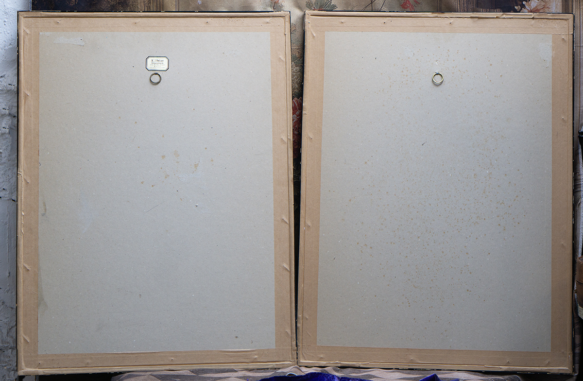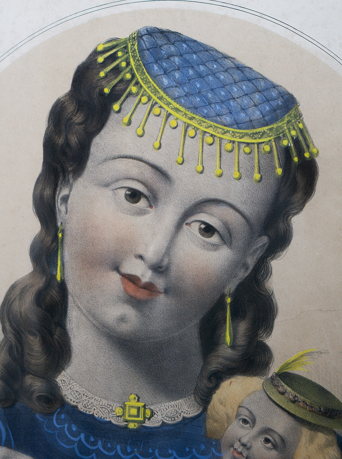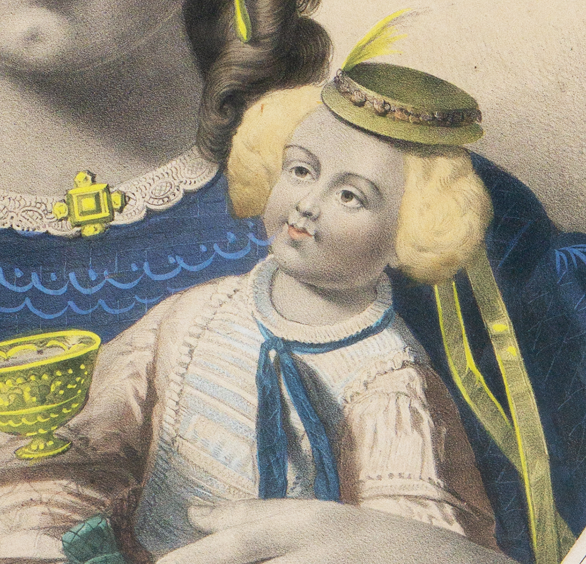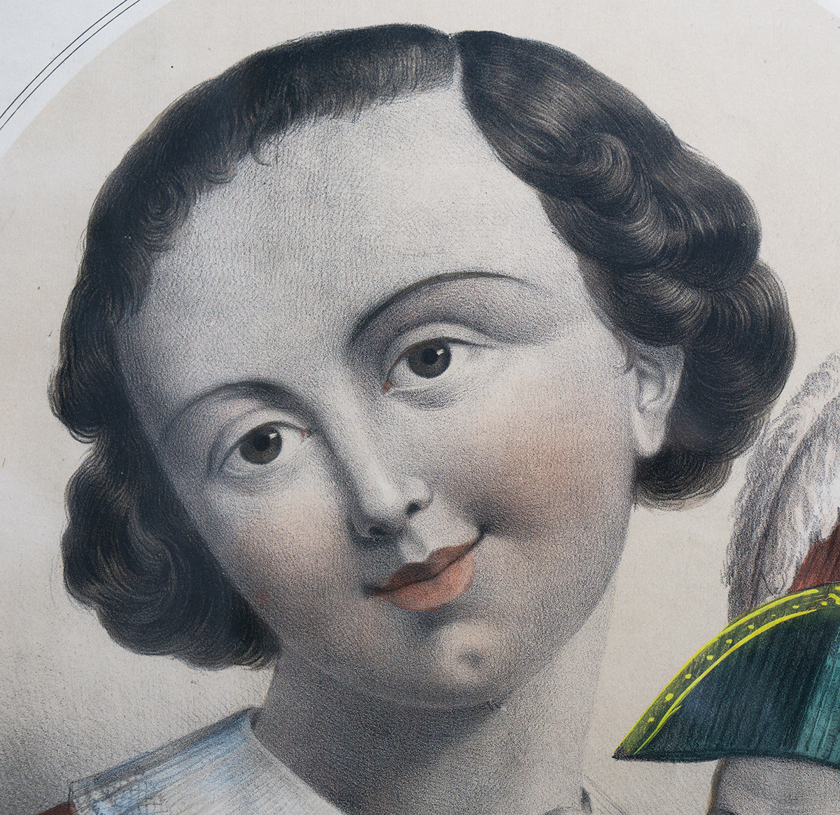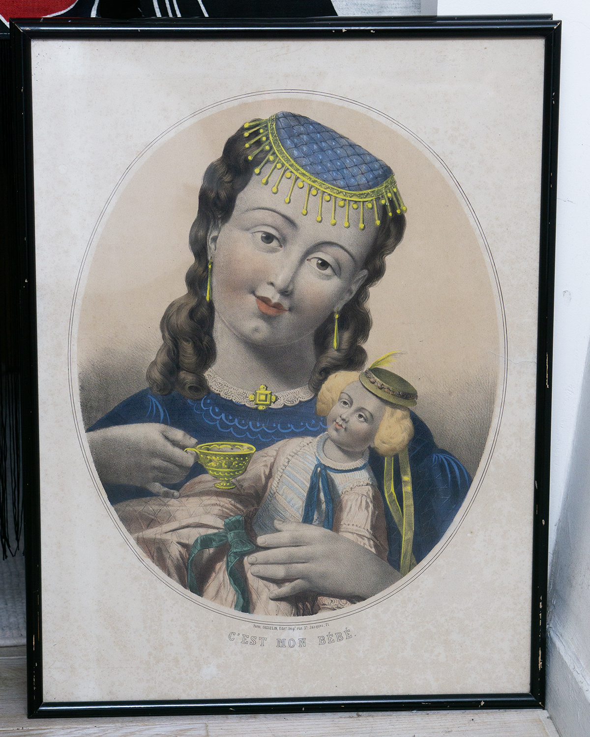 A beautiful and rare matching pair of large antique French hand-colored lithographs titled “Le Petit Raphael” and “C’est mon bebe”, published in Paris by Gosselin (editeur et imprimeur, rue Saint-Jacques, 71), dating to circa 1850.