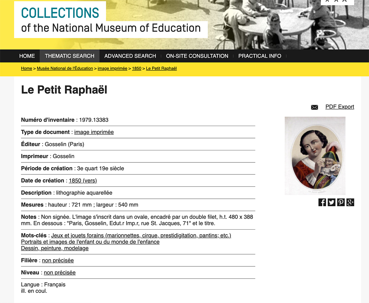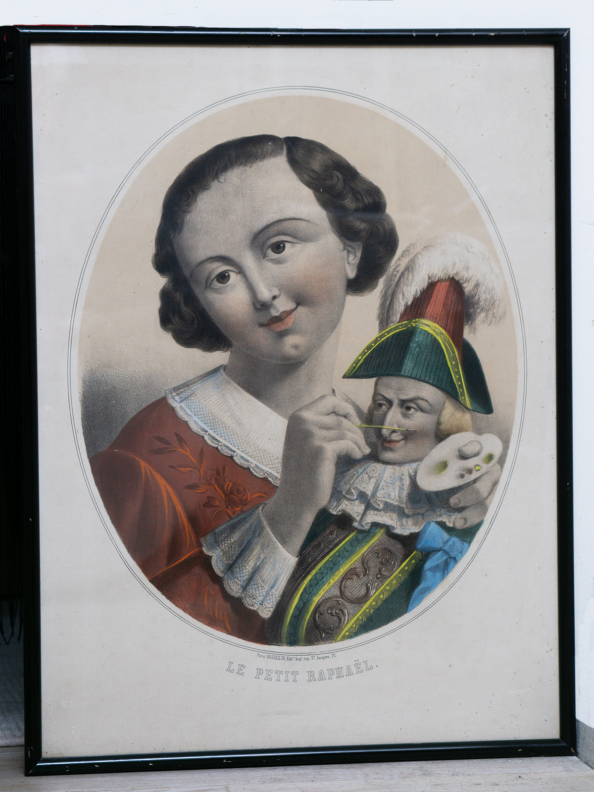 Both prints belong to the same decorative series devoted to the theme of idealized childhood, executed in the refined romantic style inspired by Renaissance models, often described as “Raphaelesque.” The compositions feature delicately modeled children with soft expressions and finely detailed costumes. • Le Petit Raphael depicts a child gently painting a Polichinelle figure, symbolizing artistic sensibility and refinement. • C’est mon bébé presents a young girl caring for her doll, illustrating the 19th-century concept of early nurturing and childhood innocence. Both works are executed as lithographies aquarellées (hand-colored lithographs), a high-quality Parisian technique widely used in the 1840s–1850s for decorative prints. Published and printed by Gosselin, Paris, a known mid-19th century lithographic editor active on rue Saint-Jacques. Important reference: The composition “Le Petit Raphael” is held in the collection of the Musée national de l'Education (France), confirming the authenticity, dating, and historical significance of this series. Please loom the last photo. These two prints are true companion pieces, sharing identical format, technique, publisher, and artistic language, and were originally intended to be displayed together. Format: large sheets with oval compositions Measures 24 1/2" x 18 1/2" (62 x 47 cm) A rare to find as a complete decorative pair of mid-19th century French lithographs, highly appealing for collectors of antique prints, childhood imagery, and Romantic period interiors. Intrenational shipping cost 180 USD ------------------------------------ I DO A LAYAWAY NO STATE SALES TAX! Thanks for your visit to Respectfulbear doll shop!