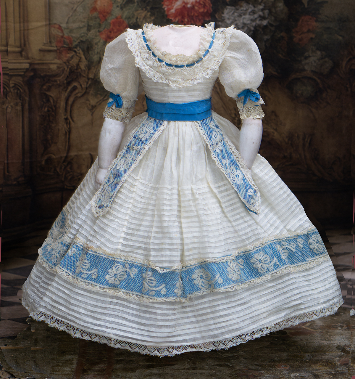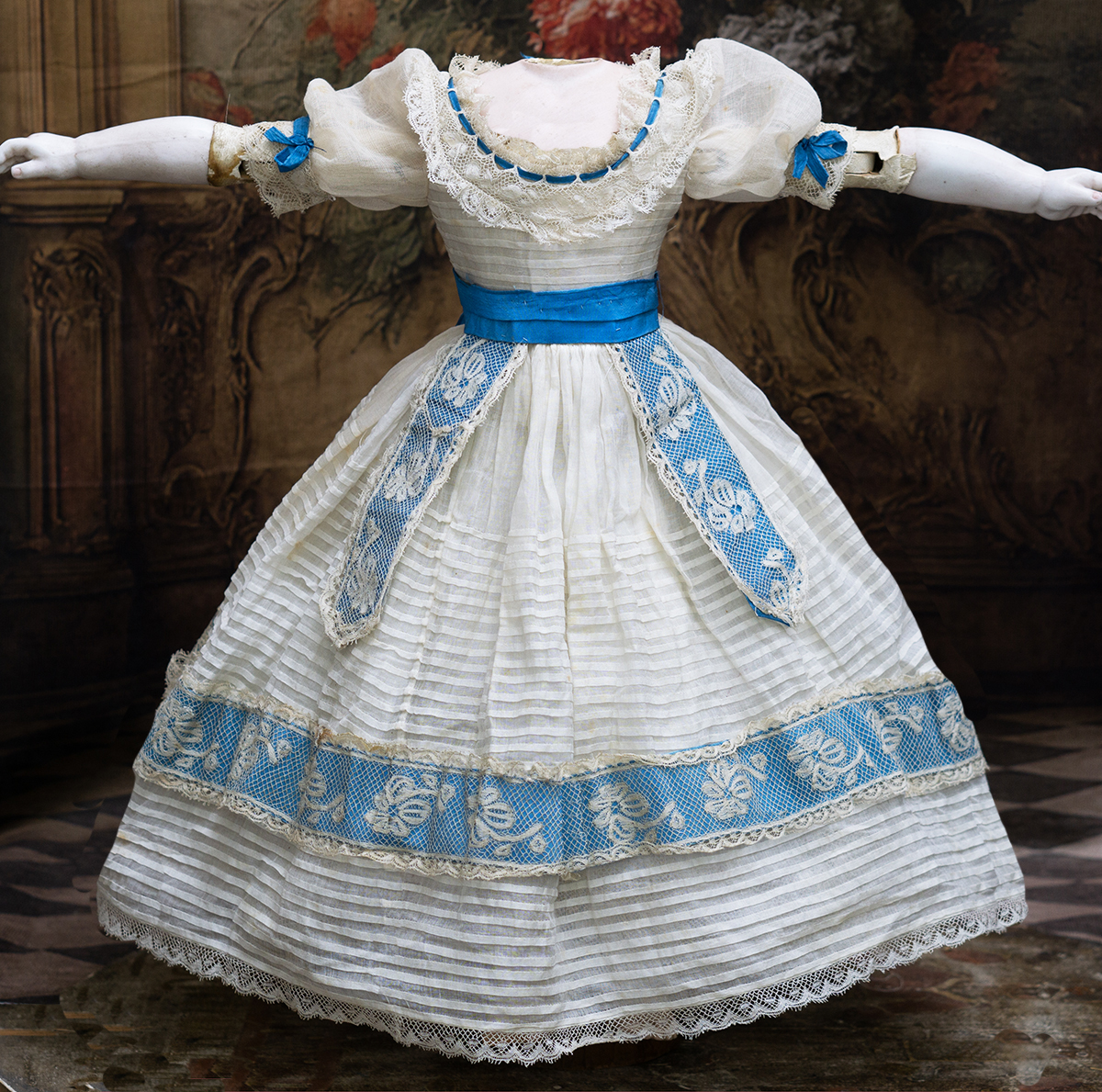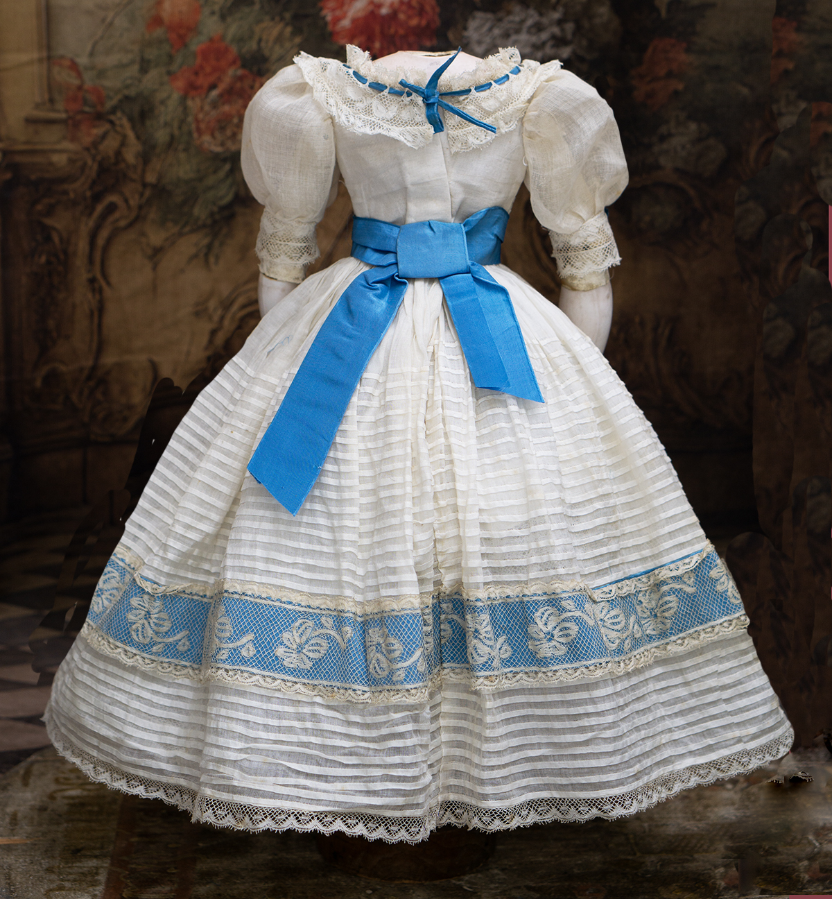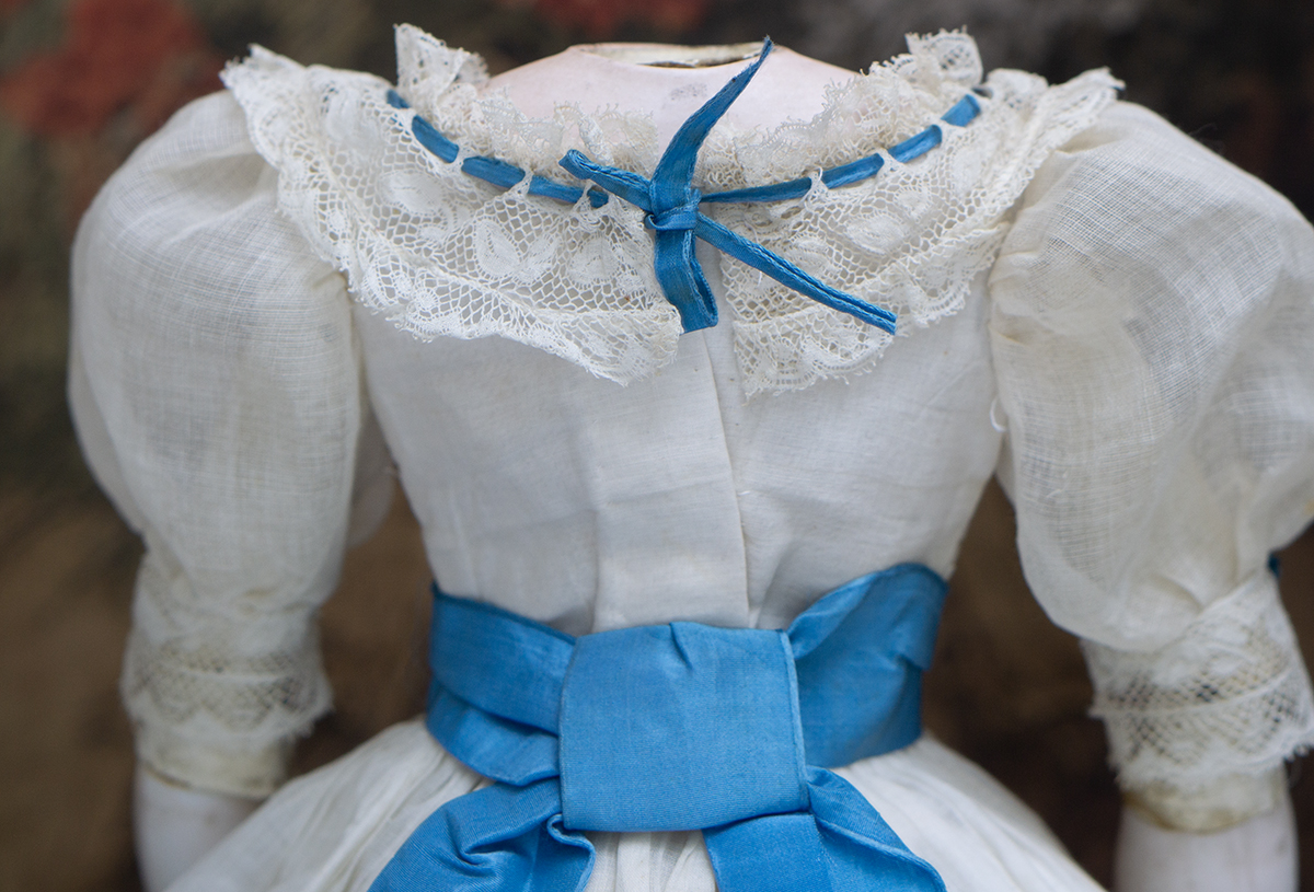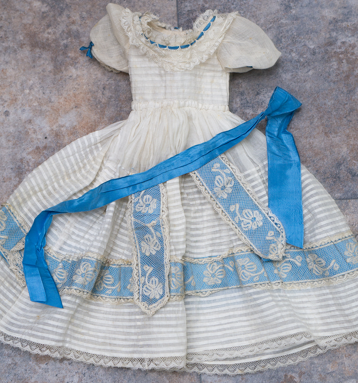 Wonderful French gown for fashion doll of sheer mull with horizontal narrow ештн tucks, the dress features puff short, rounded neckline, lace at neckline and hem has interwoven aqua silk ribbons, aqua silk sash with lace and aqua silk lapels.