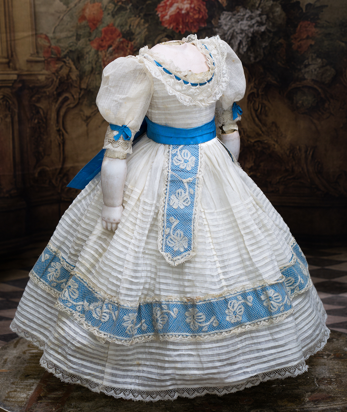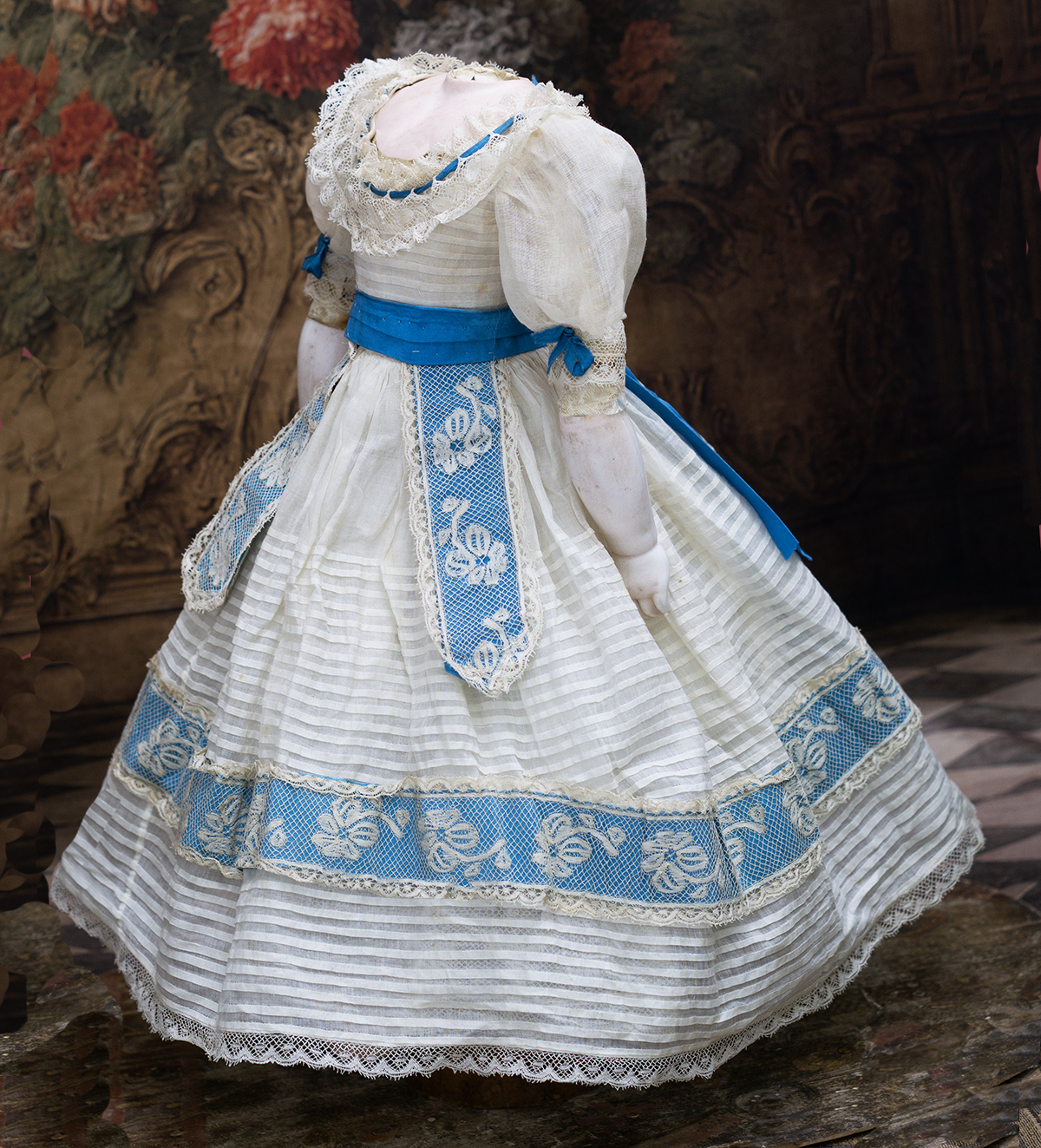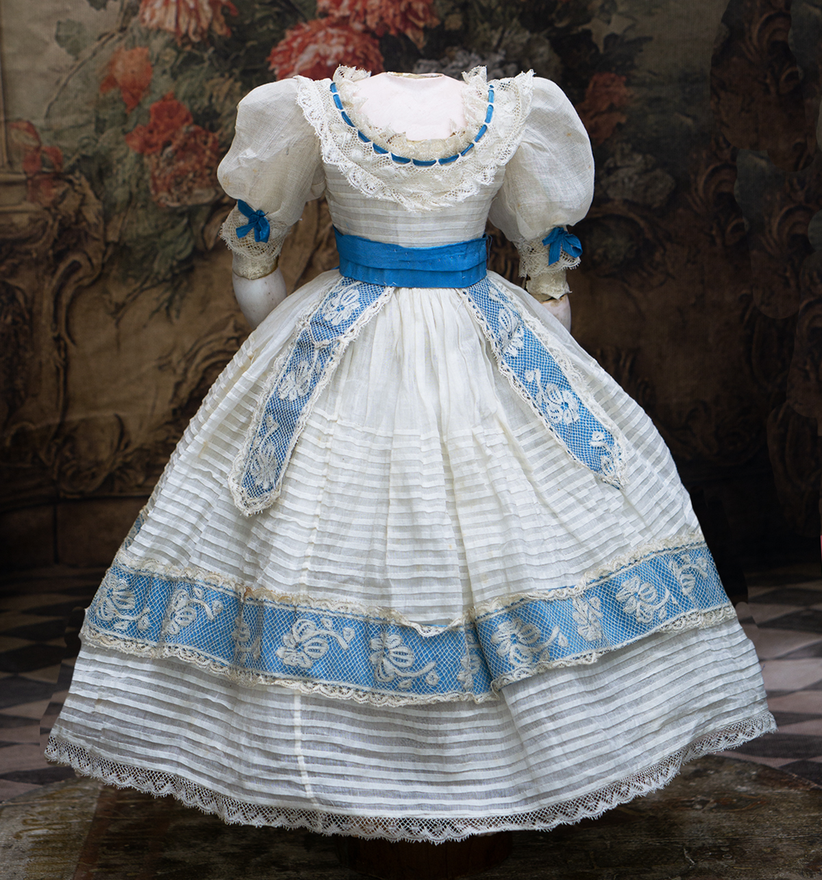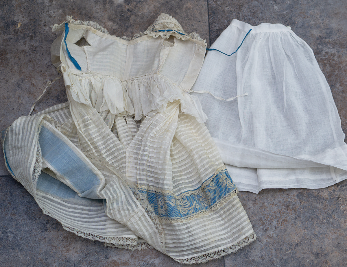 Wonderful French gown for fashion doll of sheer mull with horizontal narrow ештн tucks, the dress features puff short, rounded neckline, lace at neckline and hem has interwoven aqua silk ribbons, aqua silk sash with lace and aqua silk lapels.