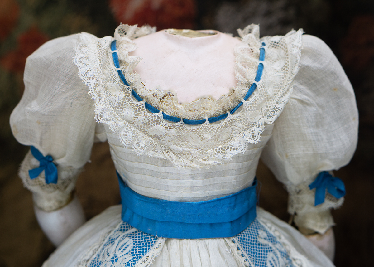 The neckline adjusting with narrow blue ribbon and the waist and waist adjusting with narrow cord. Measures: 14" (36cm) length, 9" (23 cm) waist, but can be adjusting for more small size with the cord), 4 1/2" (12cm) shoulders, 3 1/2" (9cm) sleeve. Fit for fashion doll about 17-18" tall French, circa 1870. International shipping cost $45.00 ------------------------------------ I DO A LAYAWAY NO STATE SALES TAX! Thanks for your visit to Respectfulbear doll shop!
