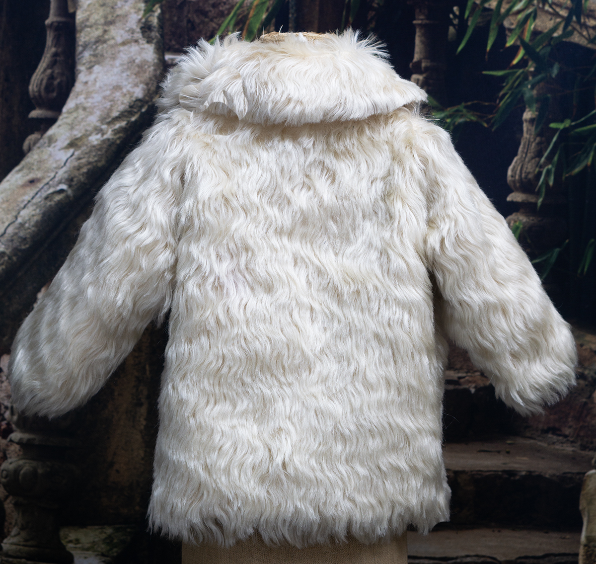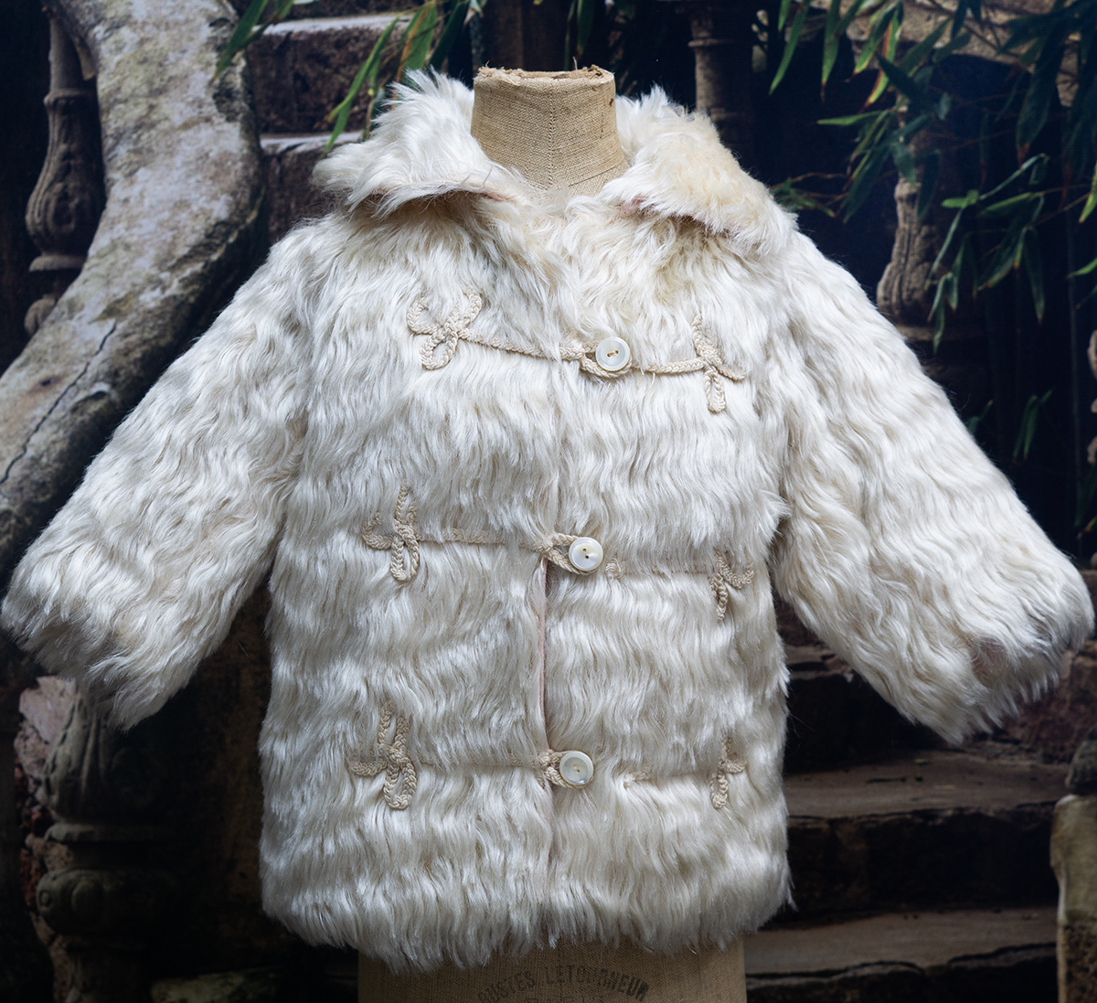 The lush angora plush coat has rounded collar, pearl button closure at the front, coat sleeves, pink silk padded lining, decorated with silk cord at the front.