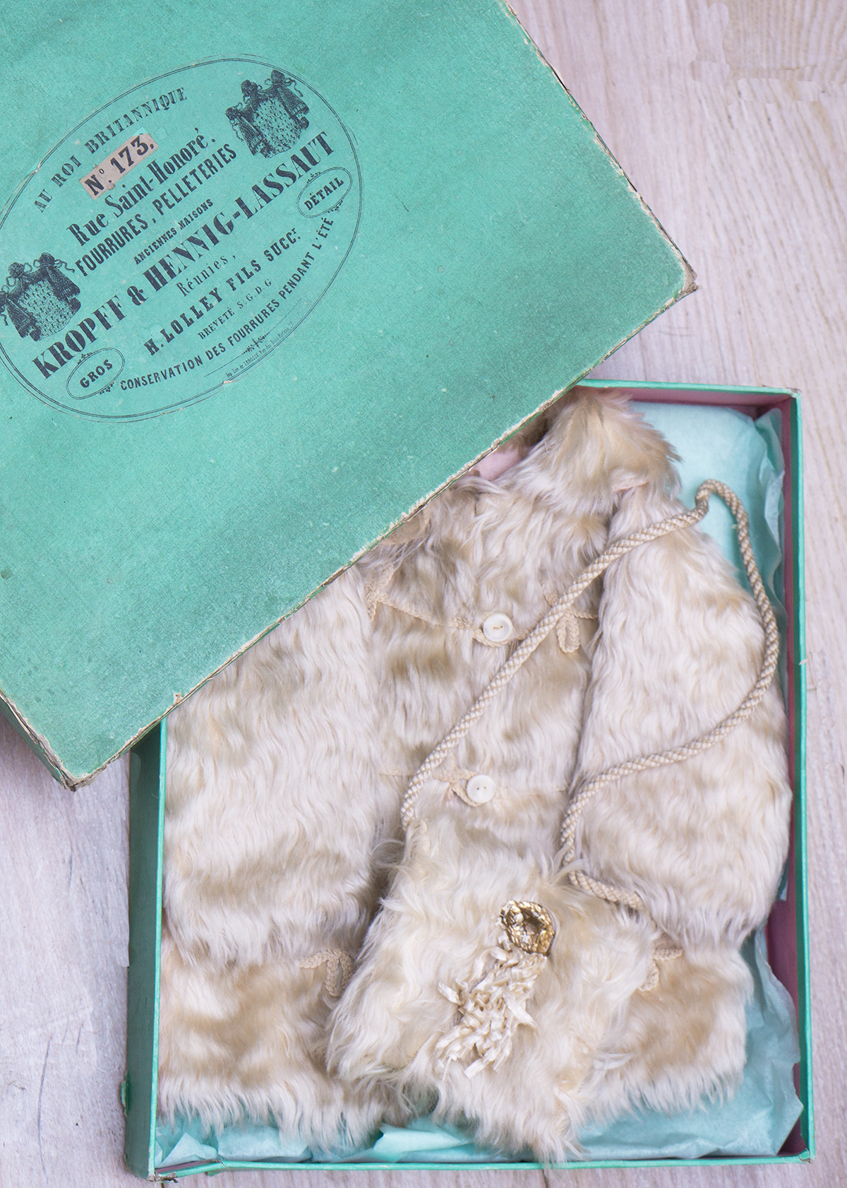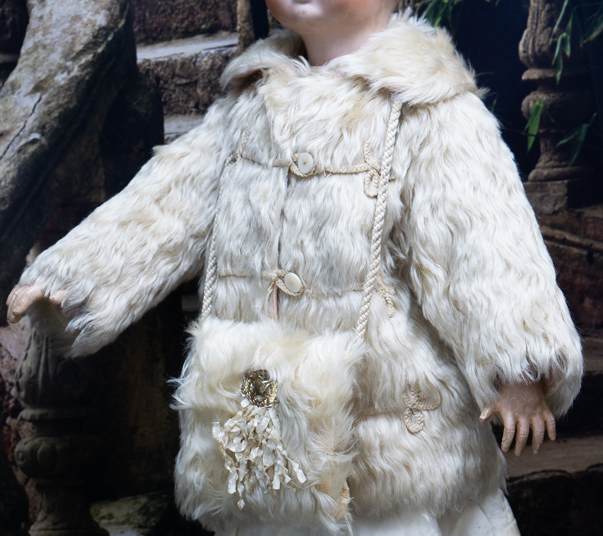 Along with matching muff with cord straps, decorative glass brooch and silk fringes. The coat and muff are presented in original green labeled store box. Good condition to age. To fit doll about 25"-26". Measures 8" (20cm) shoulder width, 12 1/2" (32cm) overall length, 20" (51cm) chest, 7 1/2" (19cm) sleeve. The muff 4 1/2" x 4" (11x10cm) The story box 13 1/2" (34cm) x 11 3/4" (30cm) x 2 1/2" (6,5cm). International shipping cost $55.00 ------------------------------------ I DO A LAYAWAY NO STATE SALES TAX! Thanks for your visit to Respectfulbear doll shop!