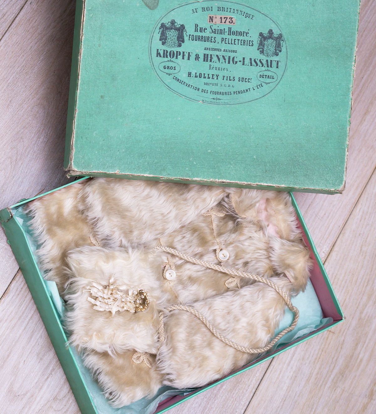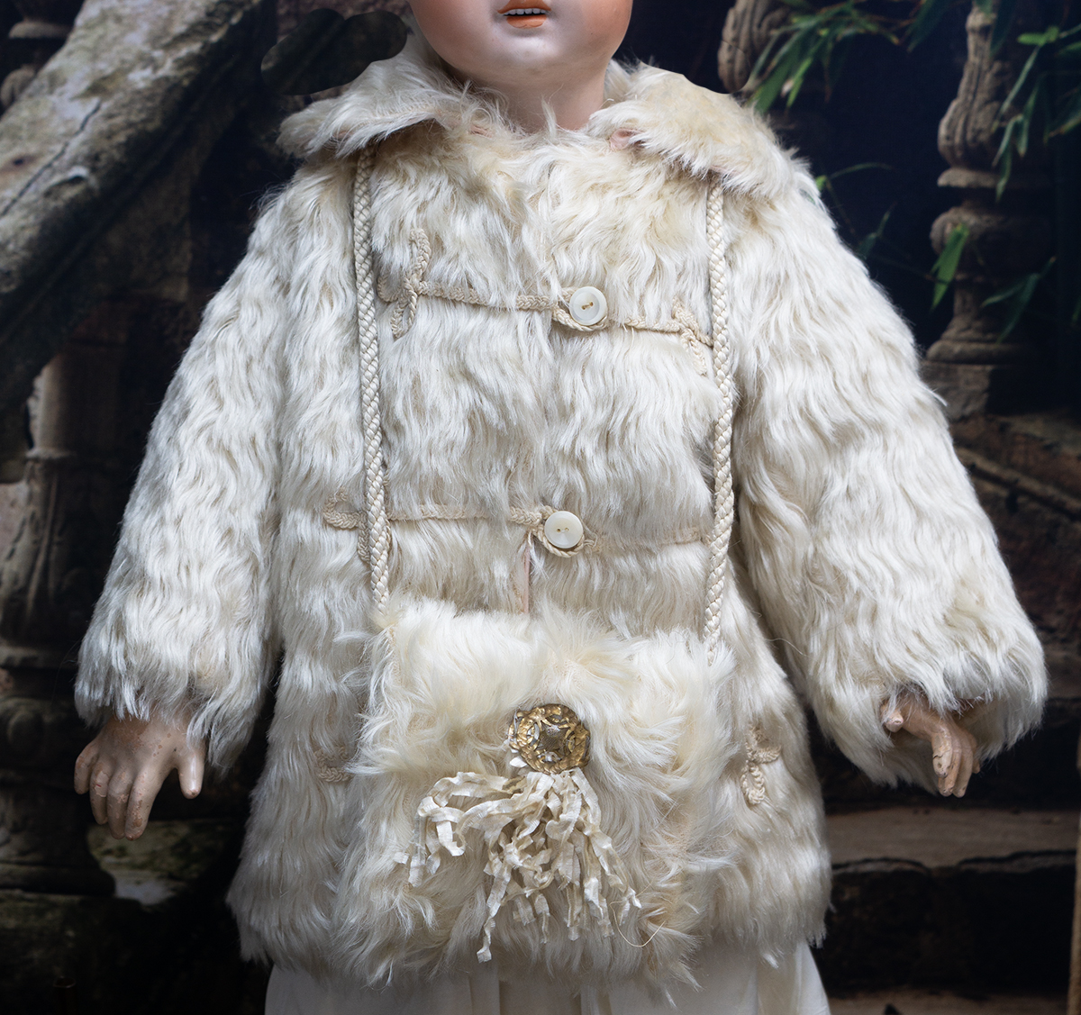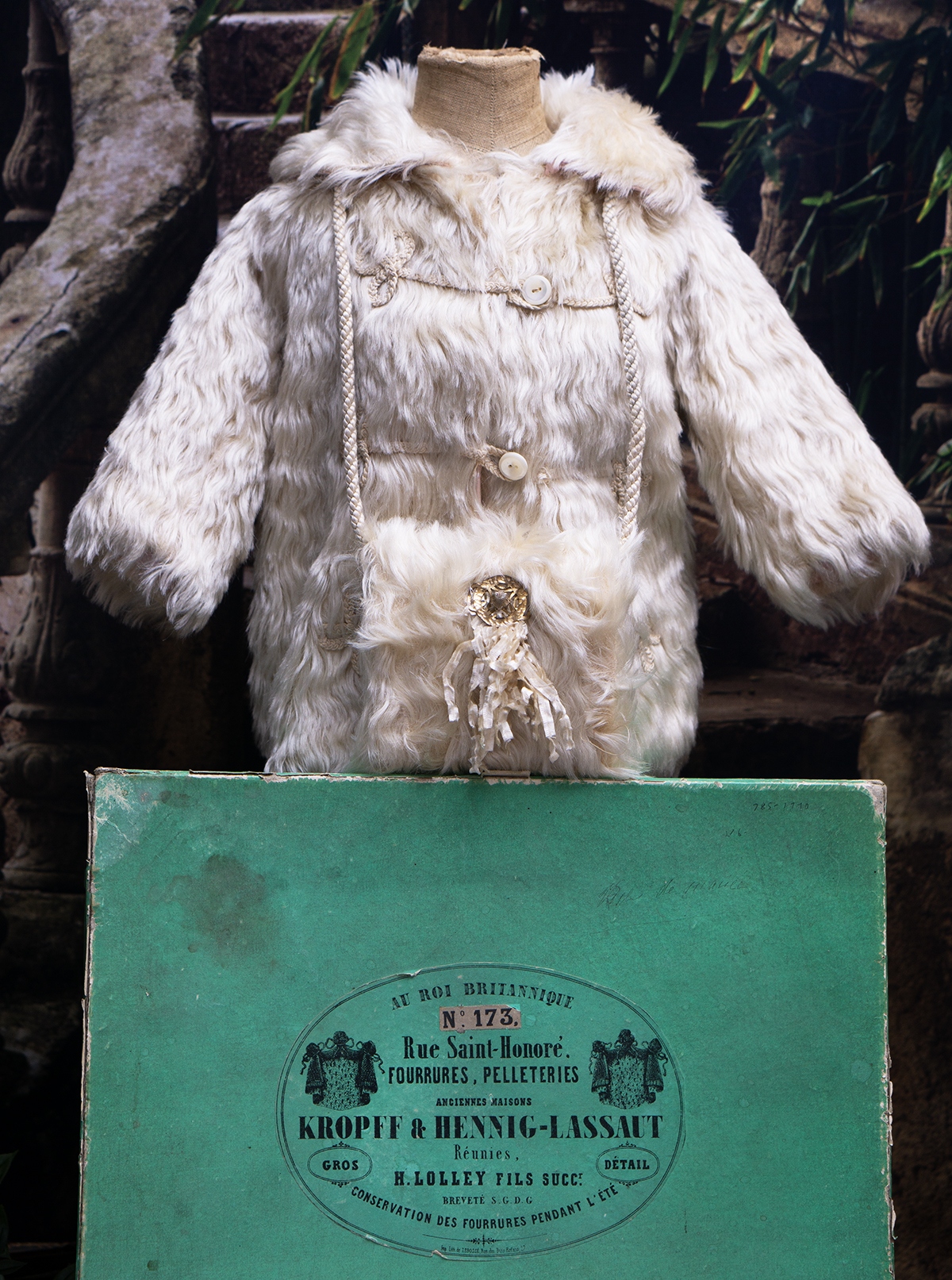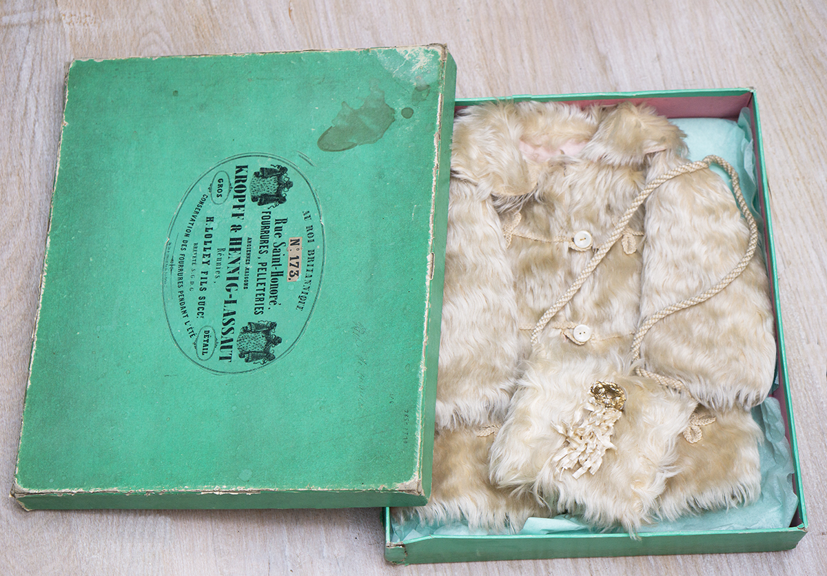 Along with matching muff with cord straps, decorative glass brooch and silk fringes. The coat and muff are presented in original green labeled store box. Good condition to age. To fit doll about 25"-26". Measures 8" (20cm) shoulder width, 12 1/2" (32cm) overall length, 20" (51cm) chest, 7 1/2" (19cm) sleeve. The muff 4 1/2" x 4" (11x10cm) The story box 13 1/2" (34cm) x 11 3/4" (30cm) x 2 1/2" (6,5cm). International shipping cost $55.00 ------------------------------------ I DO A LAYAWAY NO STATE SALES TAX! Thanks for your visit to Respectfulbear doll shop!