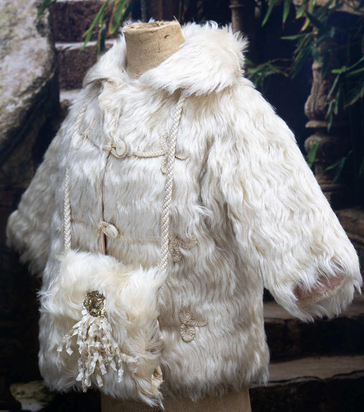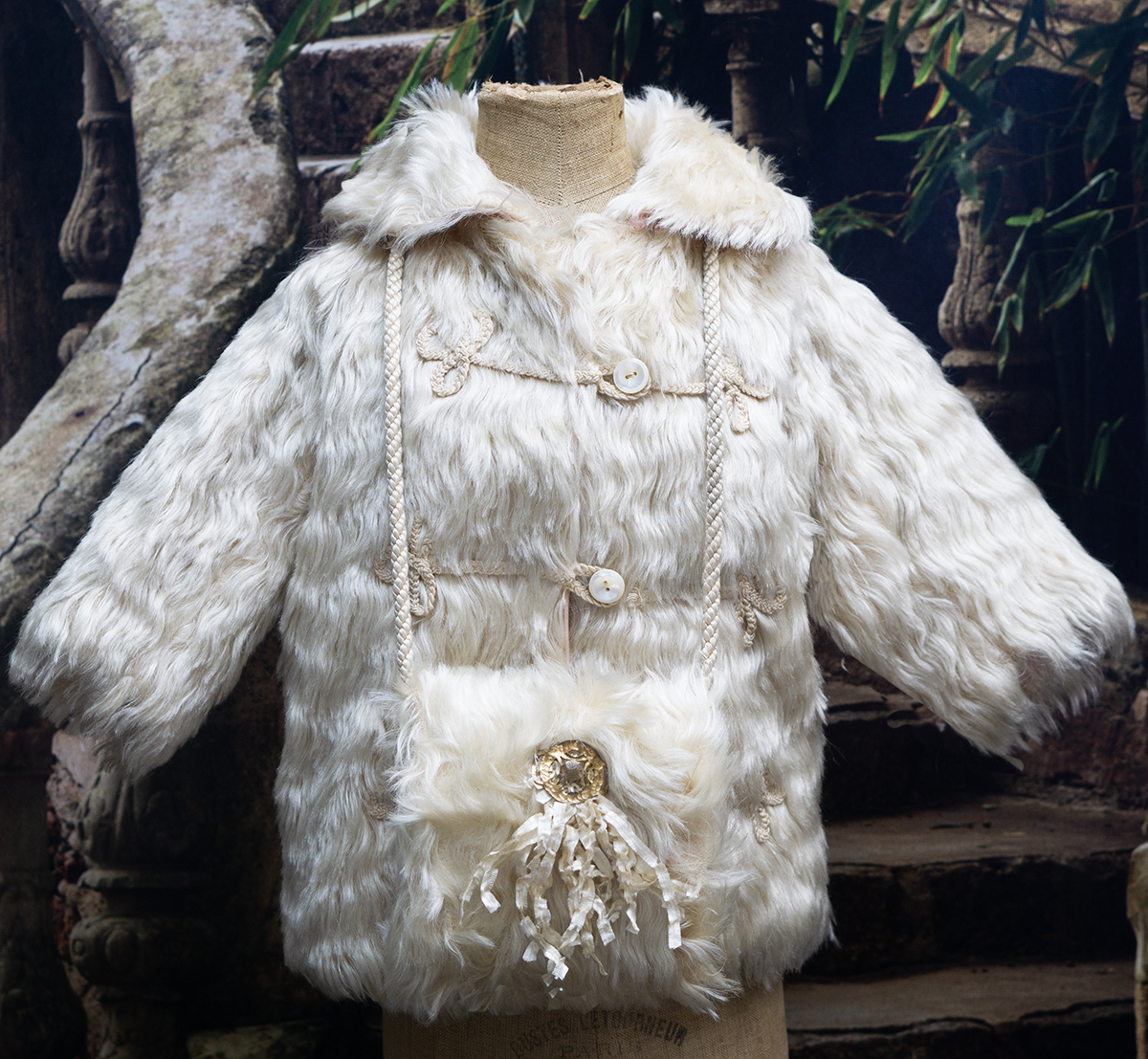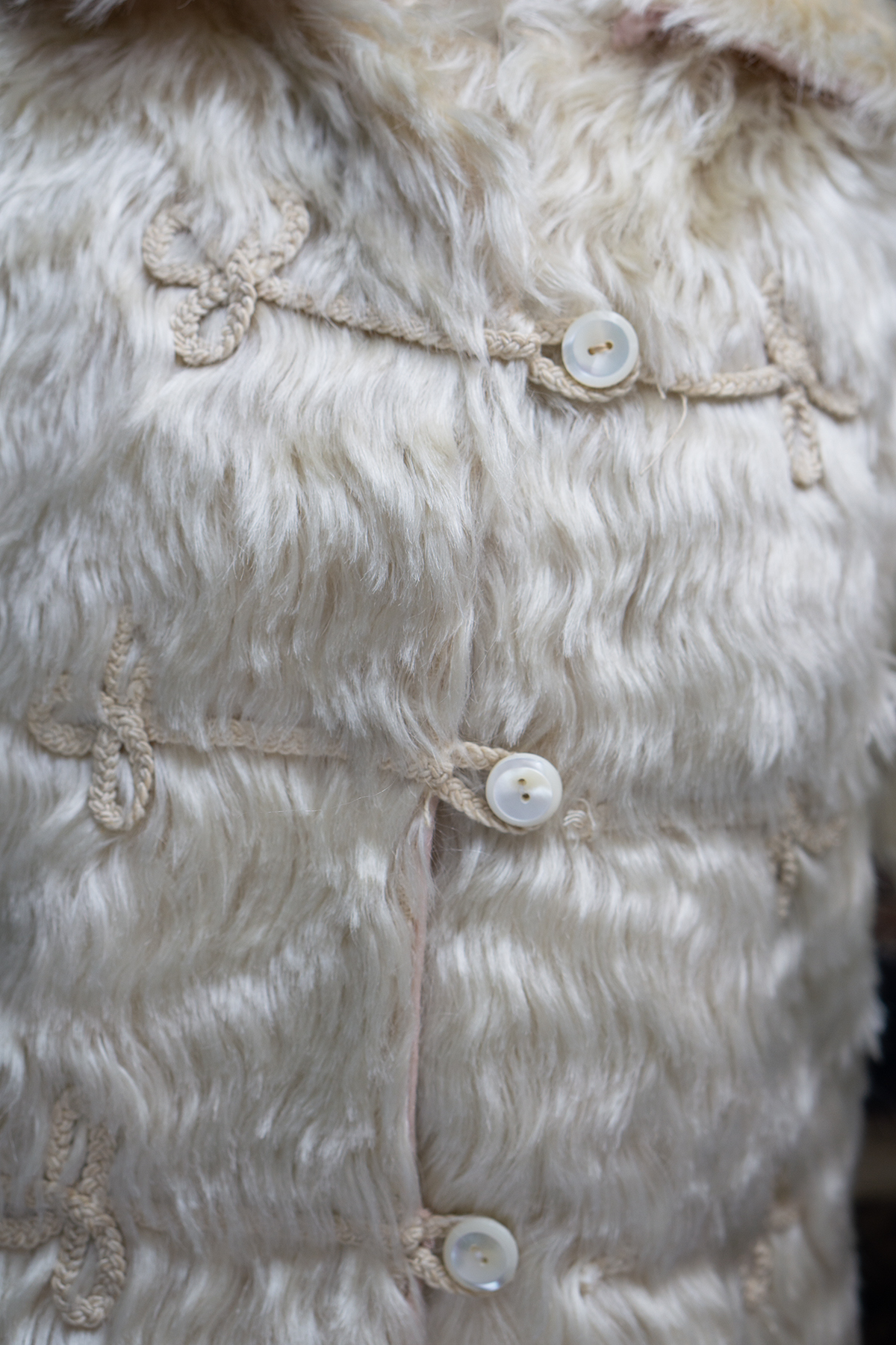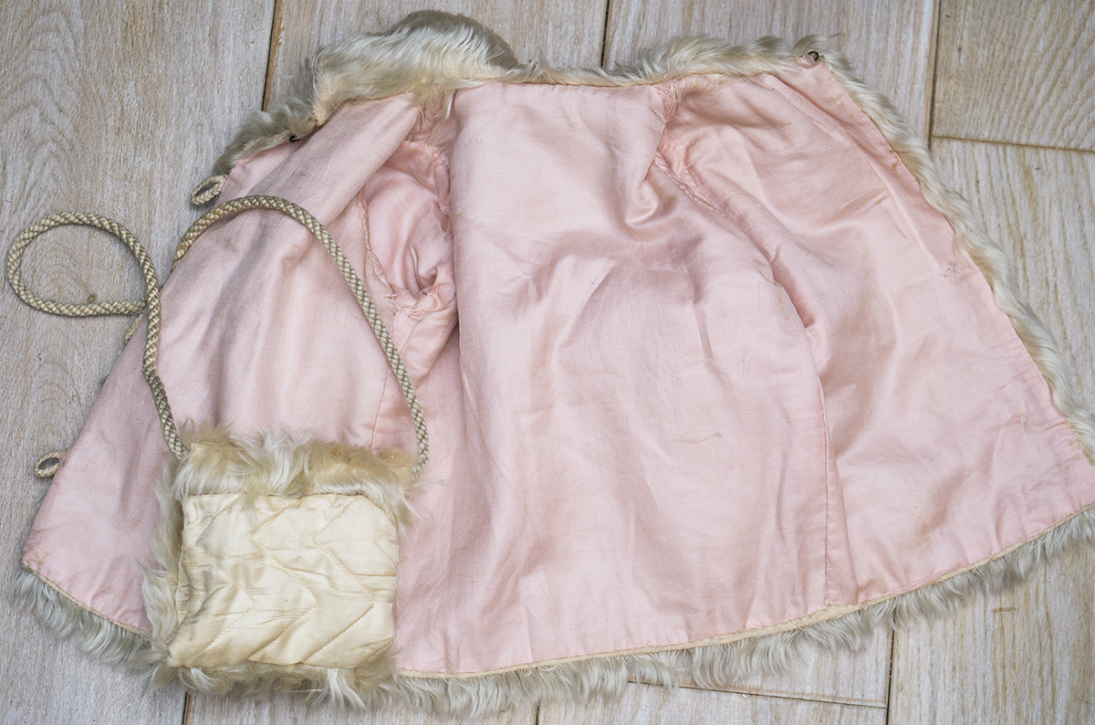 The lush angora plush coat has rounded collar, pearl button closure at the front, coat sleeves, pink silk padded lining, decorated with silk cord at the front.