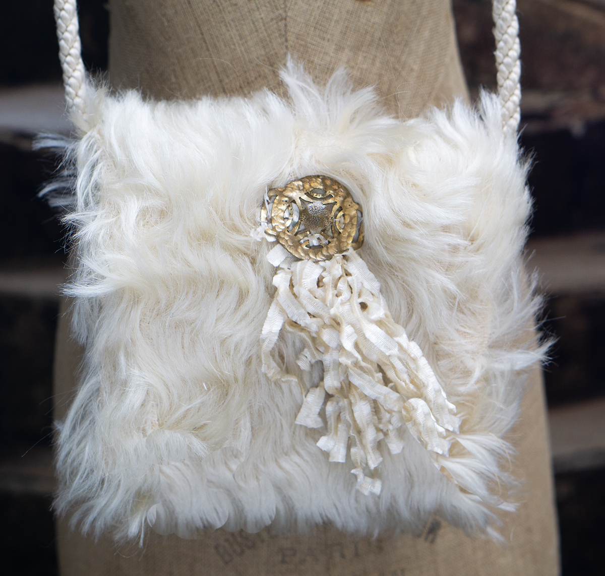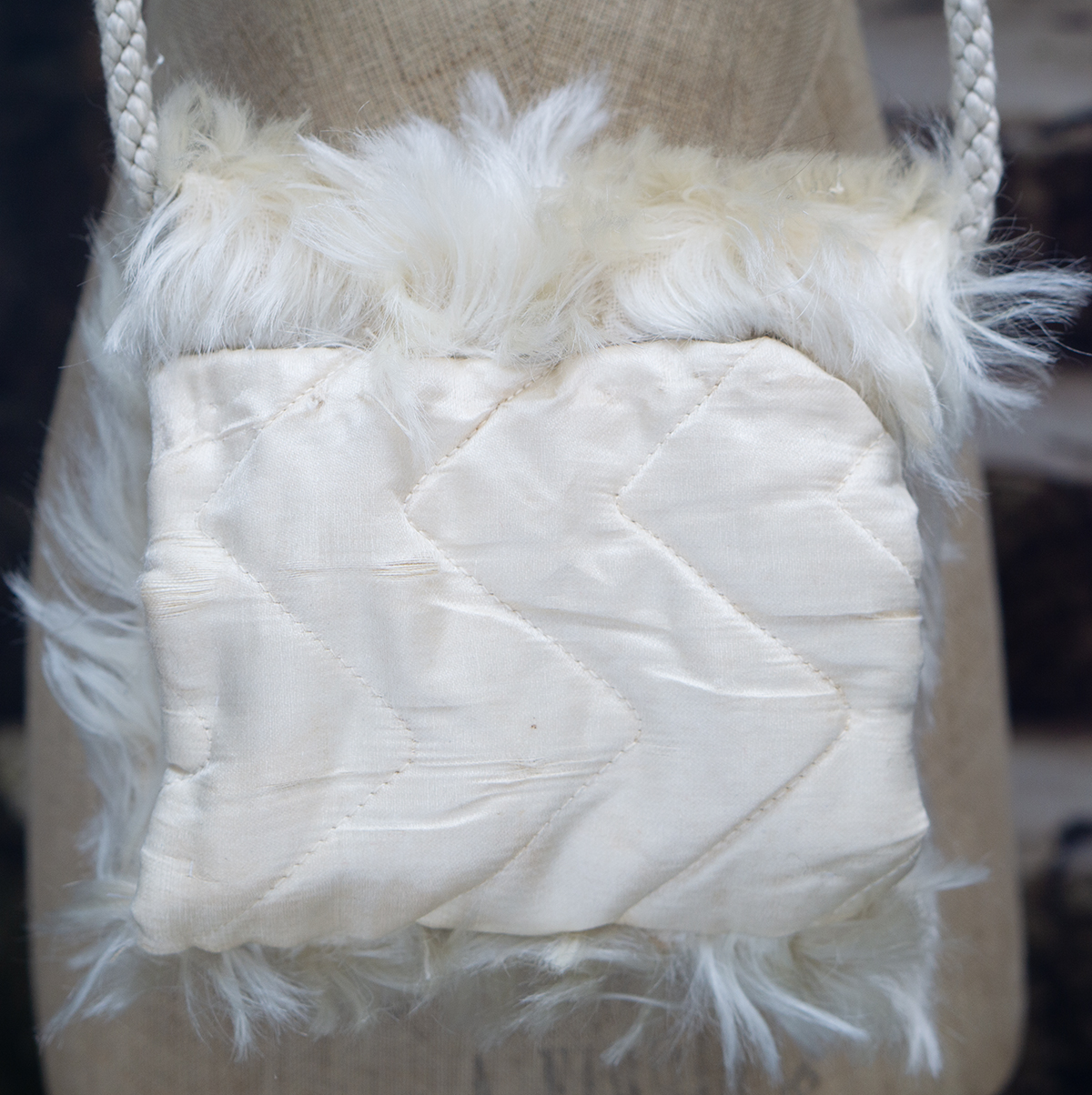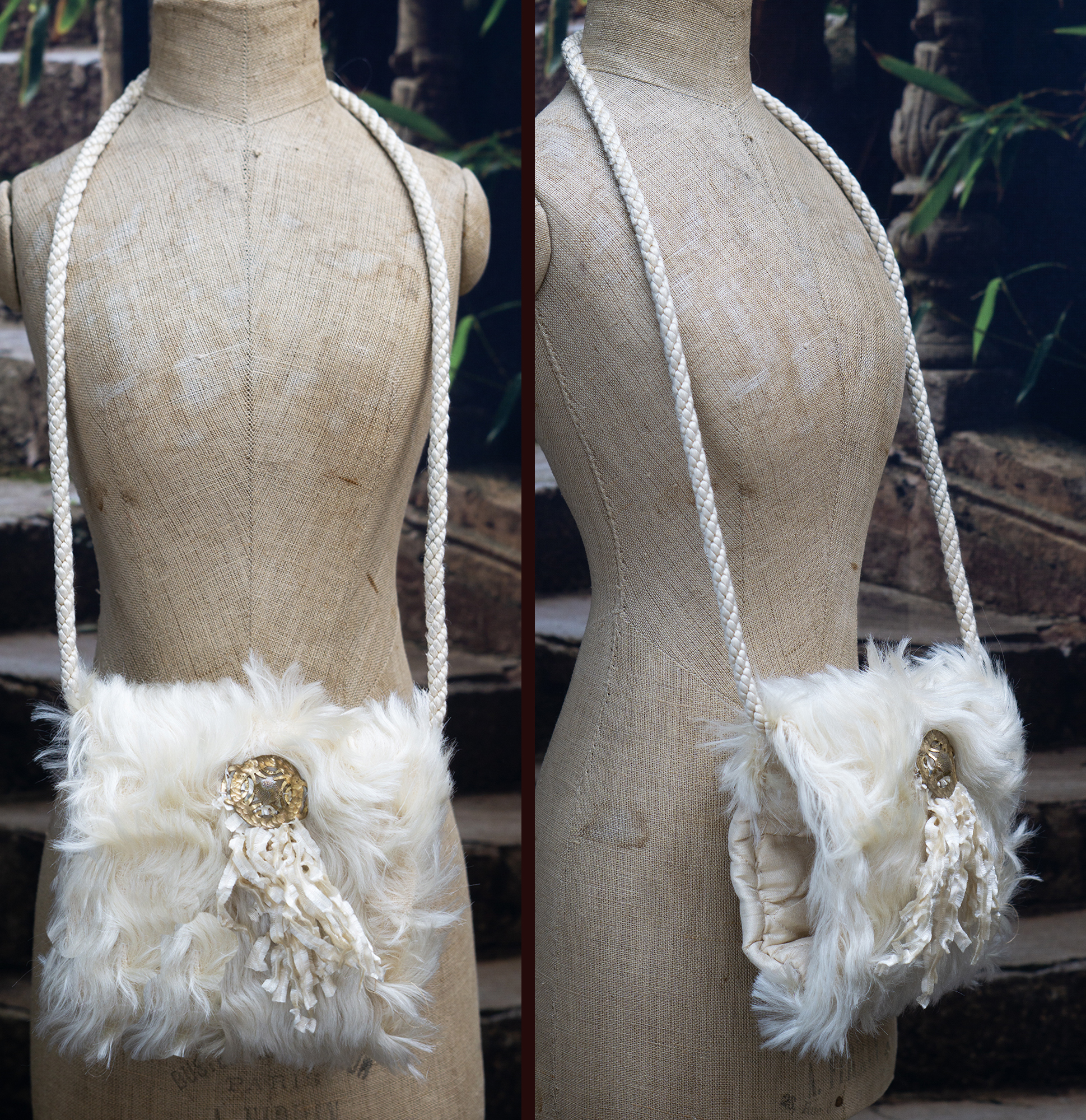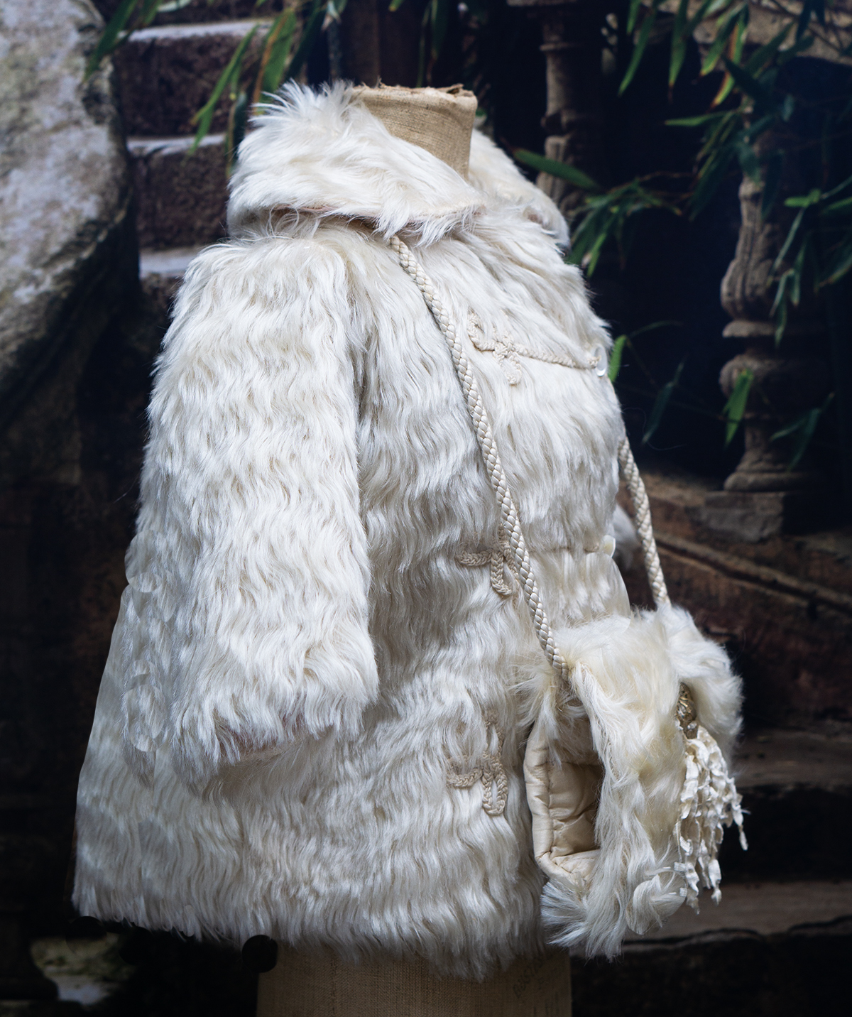 The lush angora plush coat has rounded collar, pearl button closure at the front, coat sleeves, pink silk padded lining, decorated with silk cord at the front.