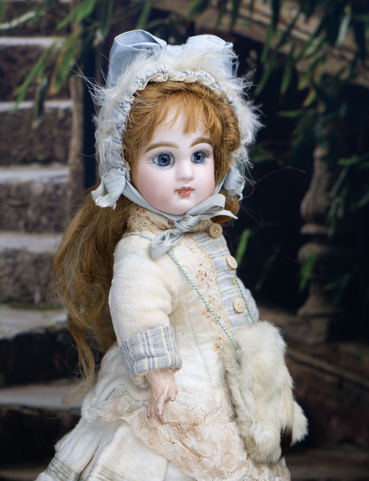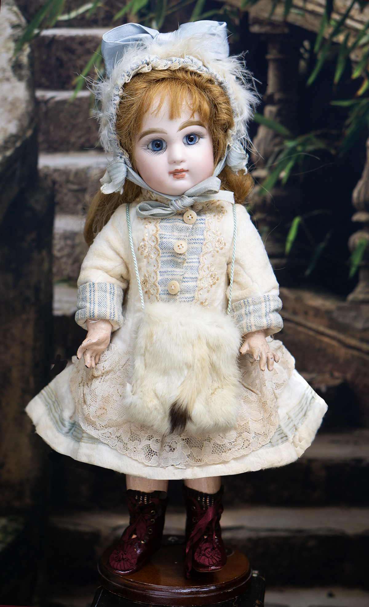 Fine luminous bisque, original wig, and wearing a very beautiful winter couturier costume, undergarments, socks and vintage leather shoes. Condition: generally excellent. Her bisque free of hairline, restopratin, any damages, original body and body finish. Marks: Depose Tete Jumeau Bte SGDG 5 (head and artist checkmarks), Jumeau Medaille d'Or Paris (body). Emile Jumeau, circa 1888. International shipping cost by UPS $55.00 ------------------------------------ I DO A LAYAWAY NO STATE SALES TAX! Thanks for your visit to Respectfulbear doll shop!