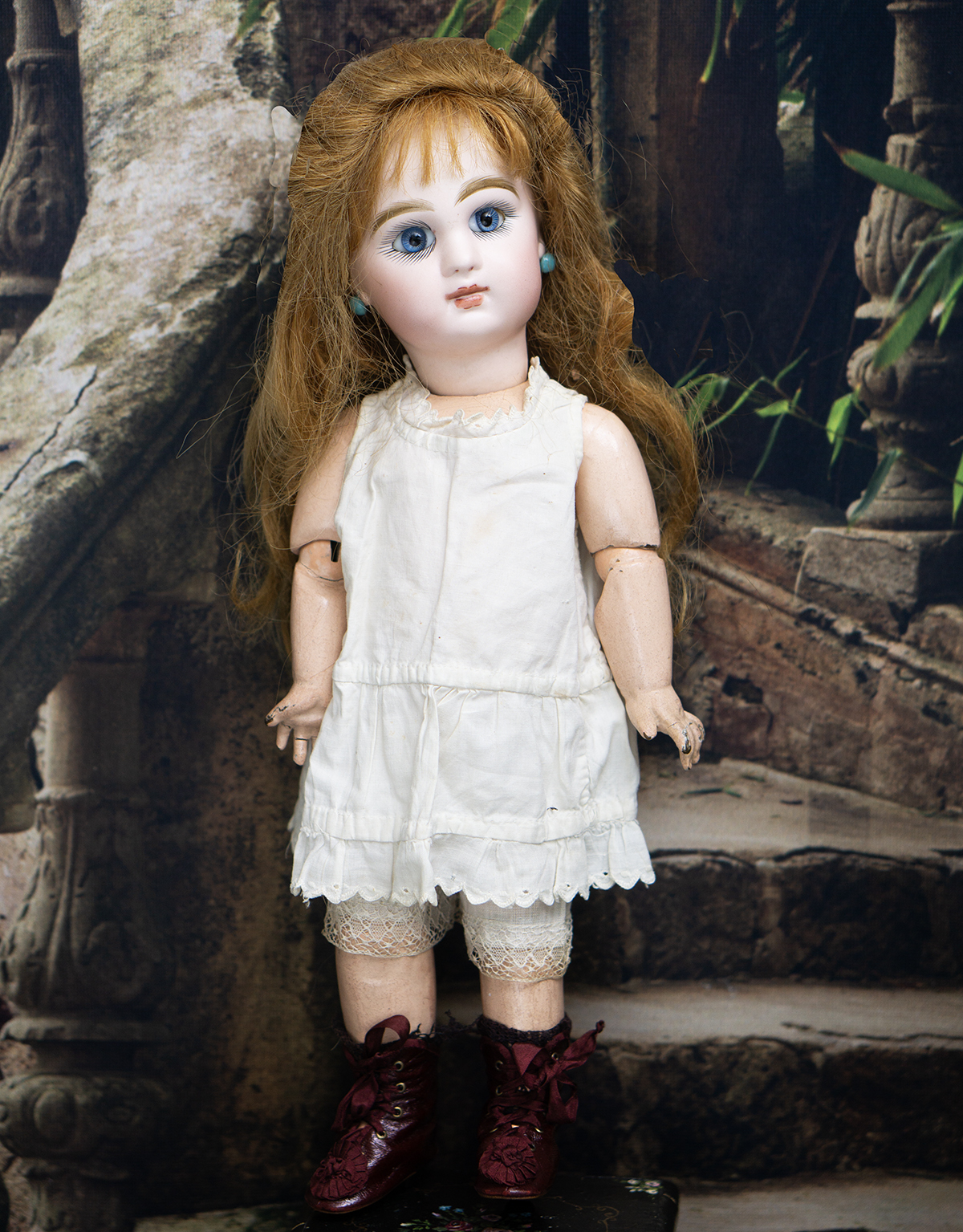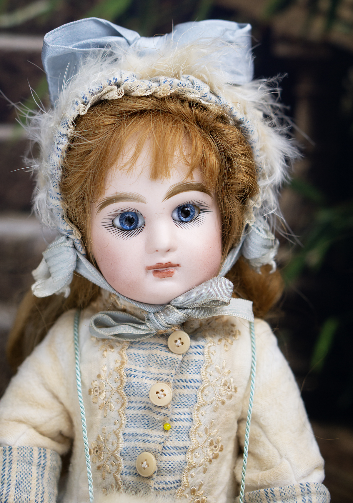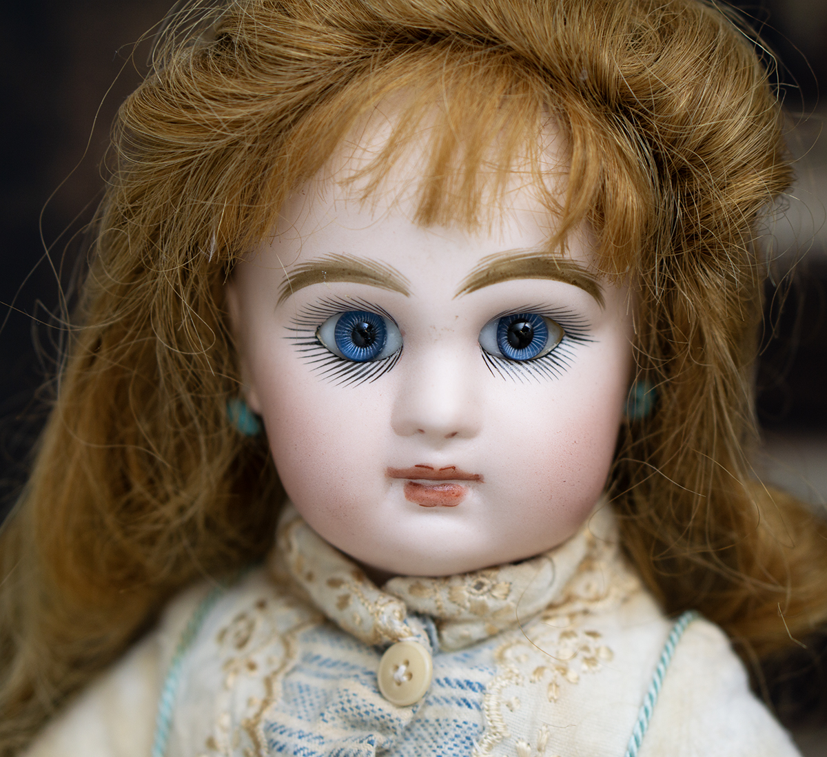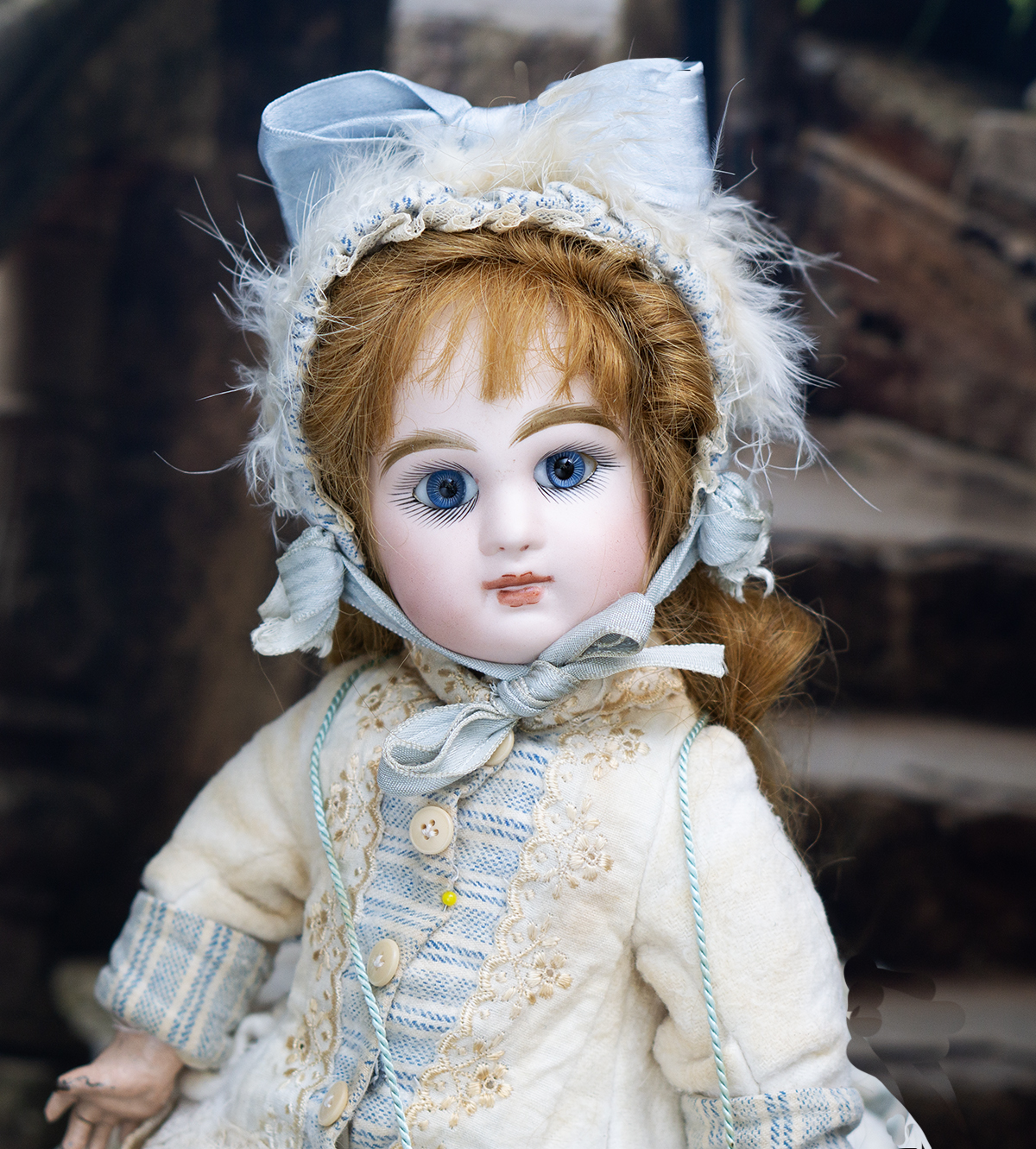 Bisque socket head, blue glass paperweight inset eyes, dark eyeliner, lushly-painted lashes, brushstroked brows, accented nostrils, closed mouth with richly-shaded lips, pierced ears, brown wig over cork pate, French composition and wooden fully-jointed body with straight wrists.