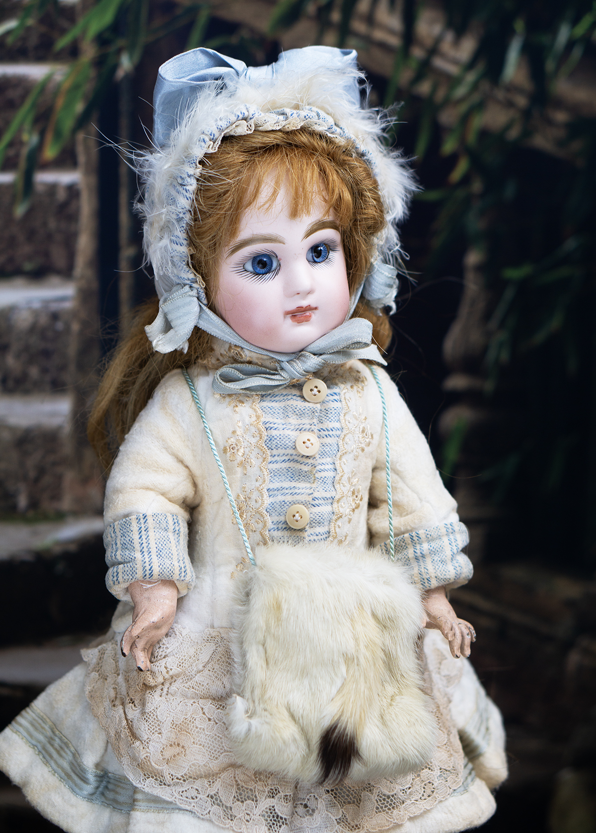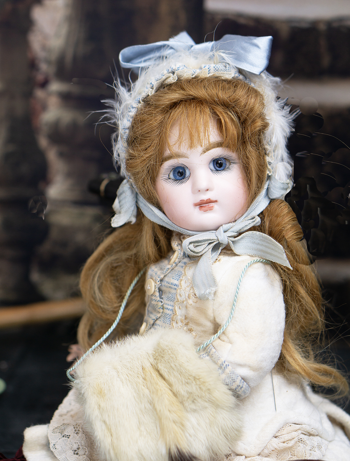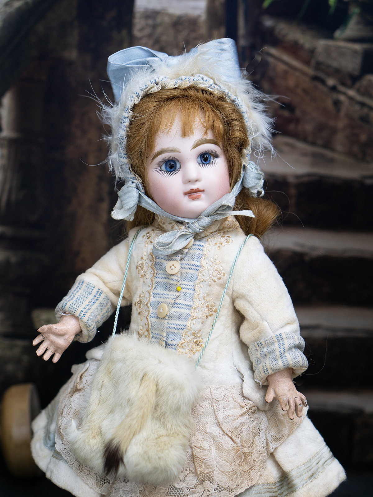 Bisque socket head, blue glass paperweight inset eyes, dark eyeliner, lushly-painted lashes, brushstroked brows, accented nostrils, closed mouth with richly-shaded lips, pierced ears, brown wig over cork pate, French composition and wooden fully-jointed body with straight wrists.