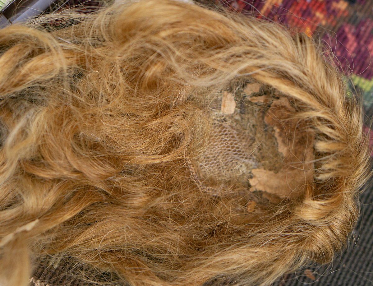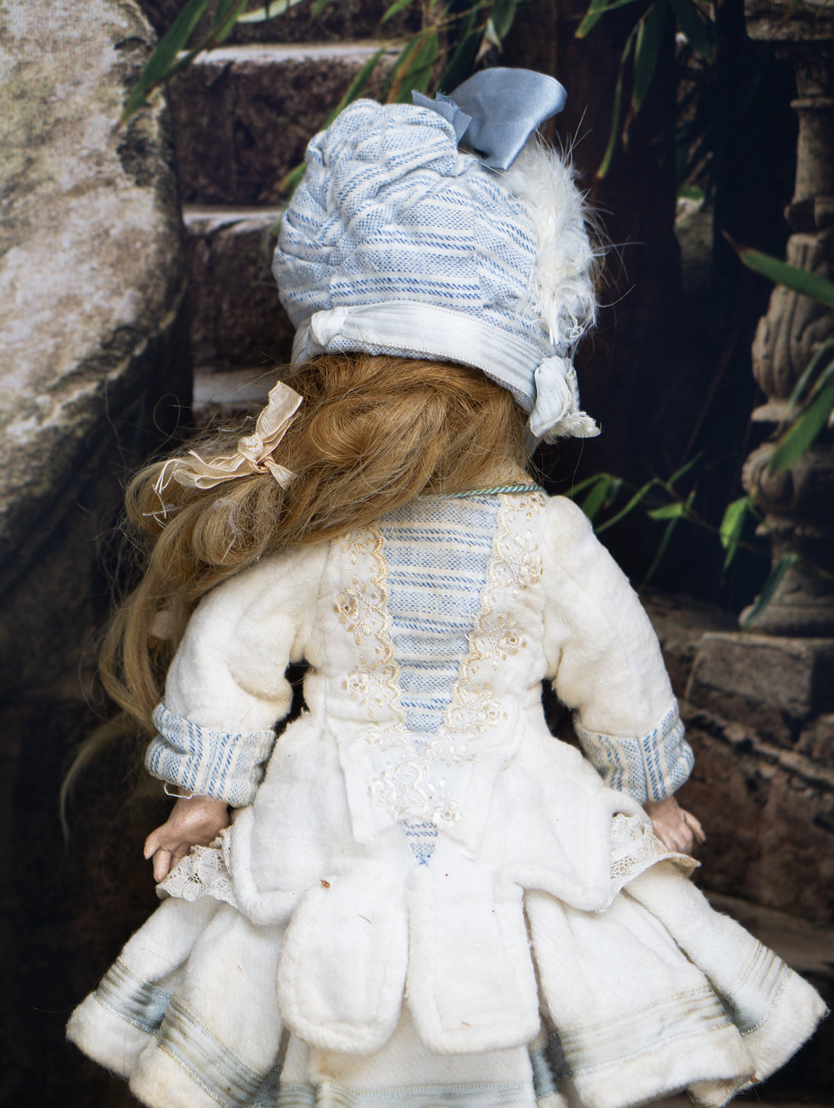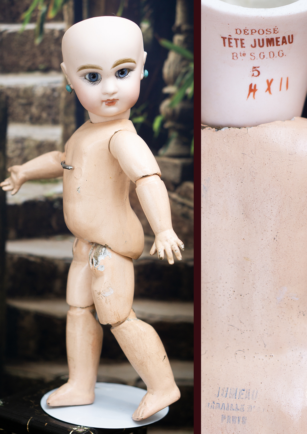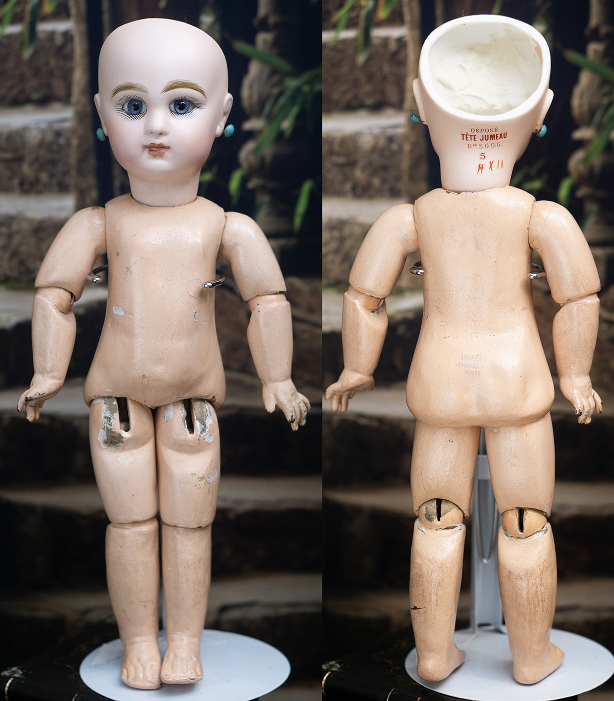 Bisque socket head, blue glass paperweight inset eyes, dark eyeliner, lushly-painted lashes, brushstroked brows, accented nostrils, closed mouth with richly-shaded lips, pierced ears, brown wig over cork pate, French composition and wooden fully-jointed body with straight wrists.