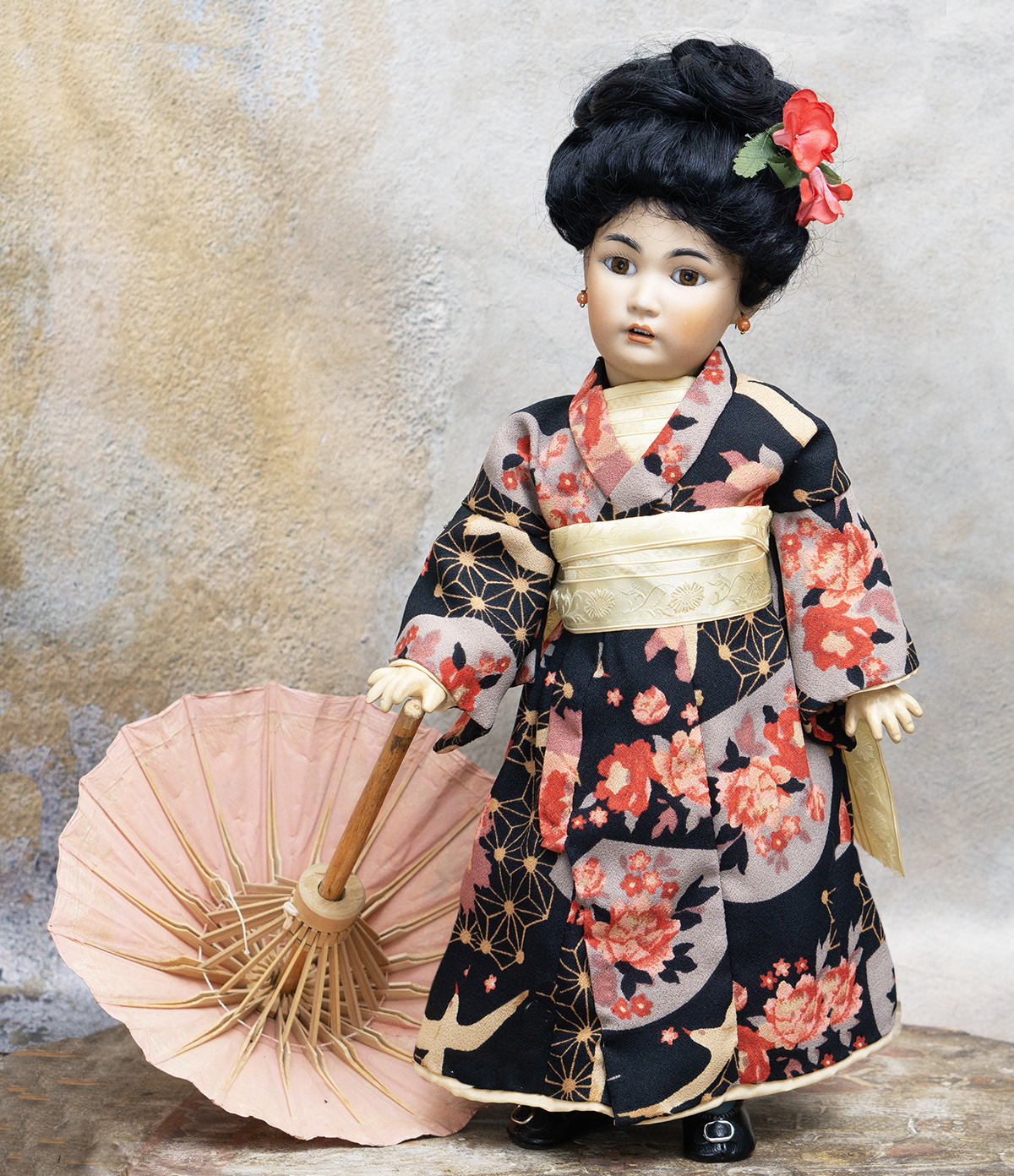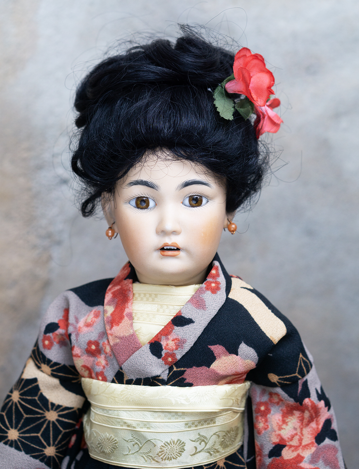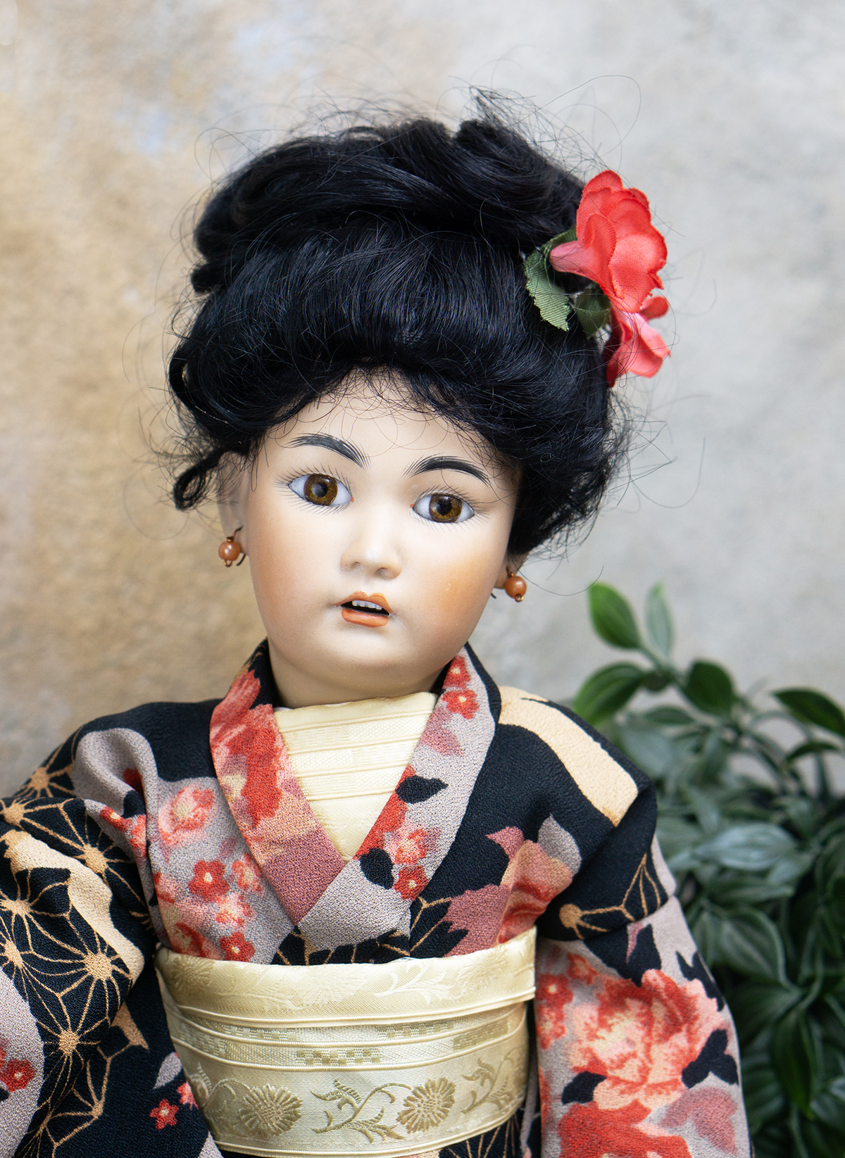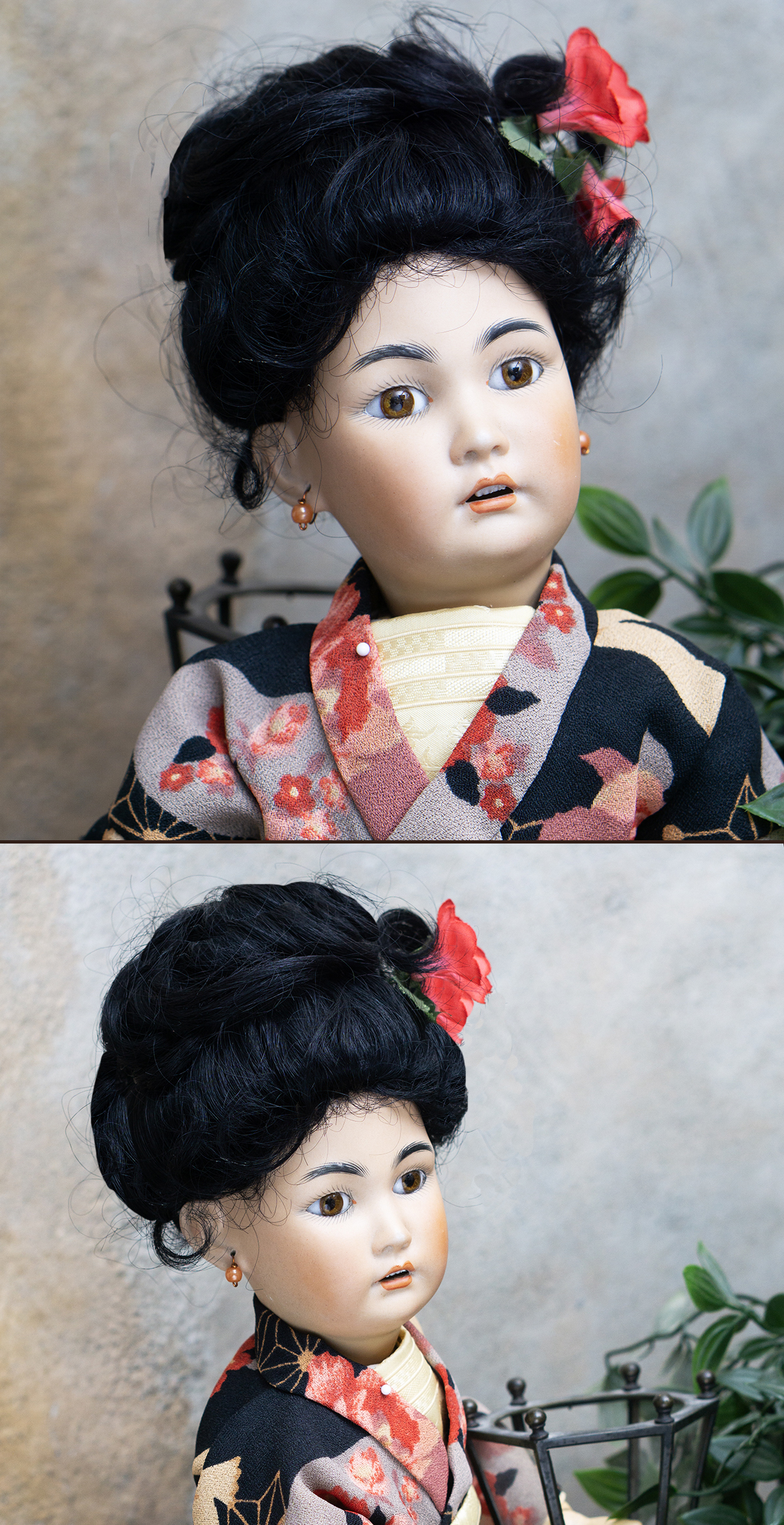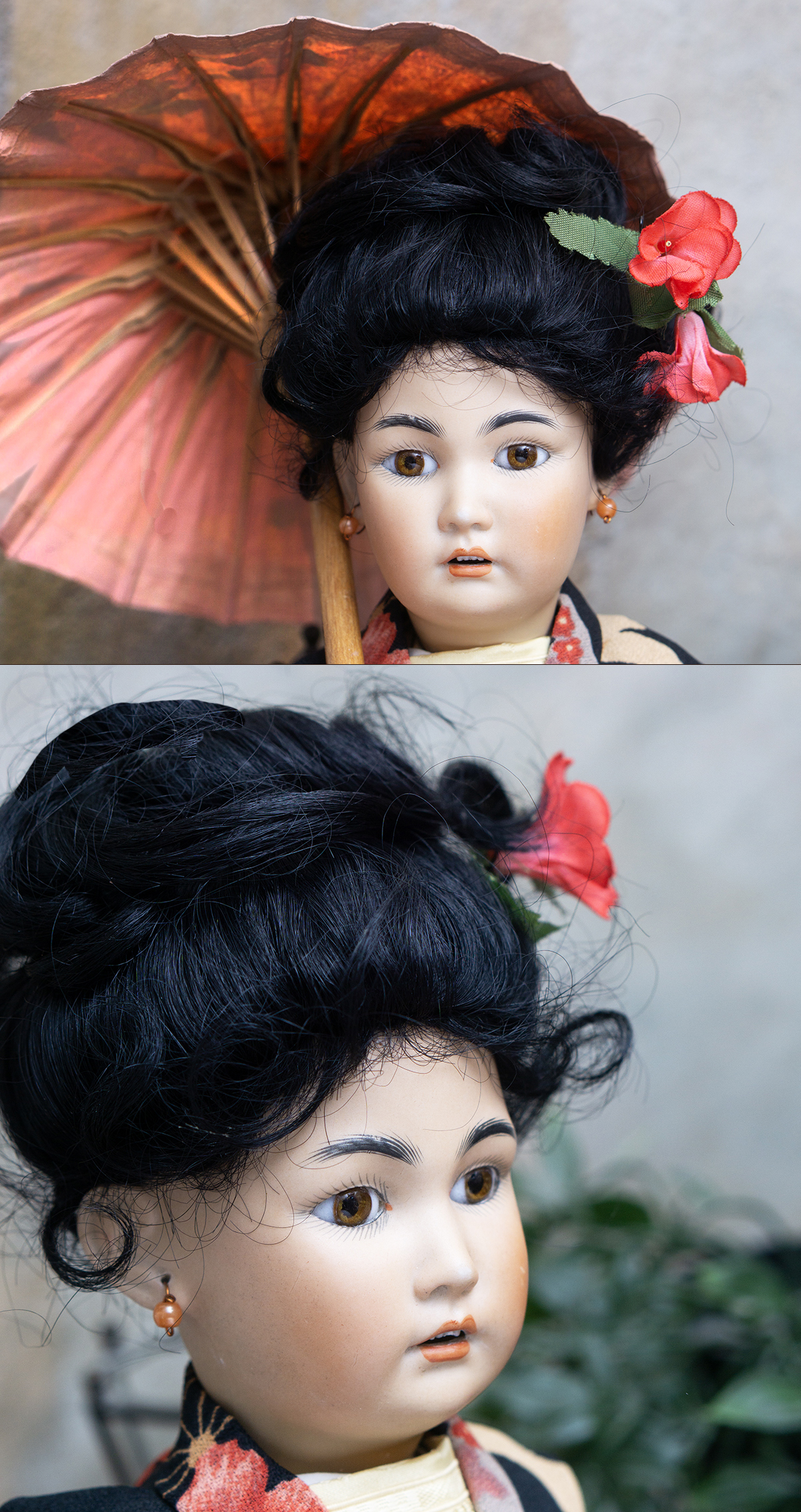 Amber tinted bisque socket head, brown glass eyes, black painted brows with feathered highlights, black painted short curly lashes, accented nostrils and eye corners, open mouth, shaded and accented lips, four porcelain teeth, pierced ears, black mohair wig in upswept fashion, amber tinted composition and wooden ball-jointed body, wearing antique silk kimono, undergarments, leather shoes.