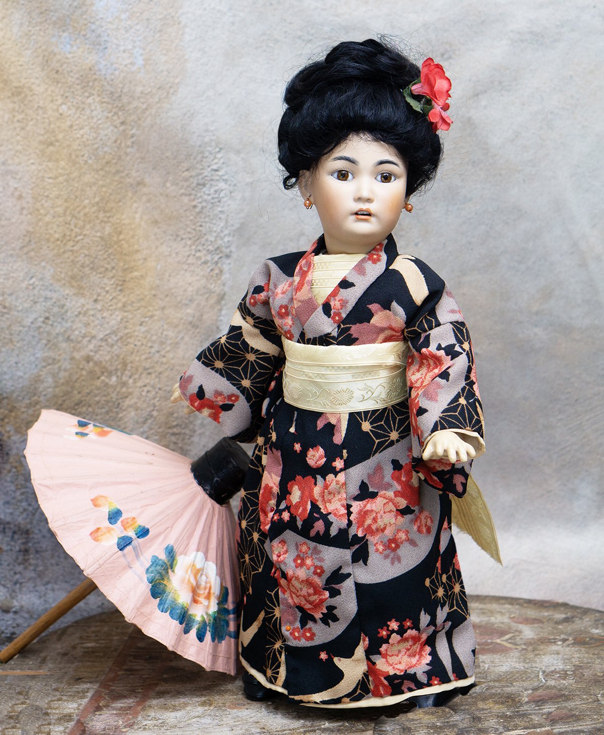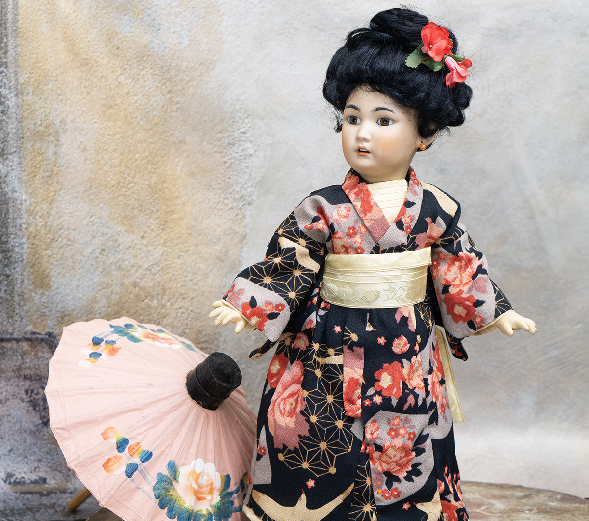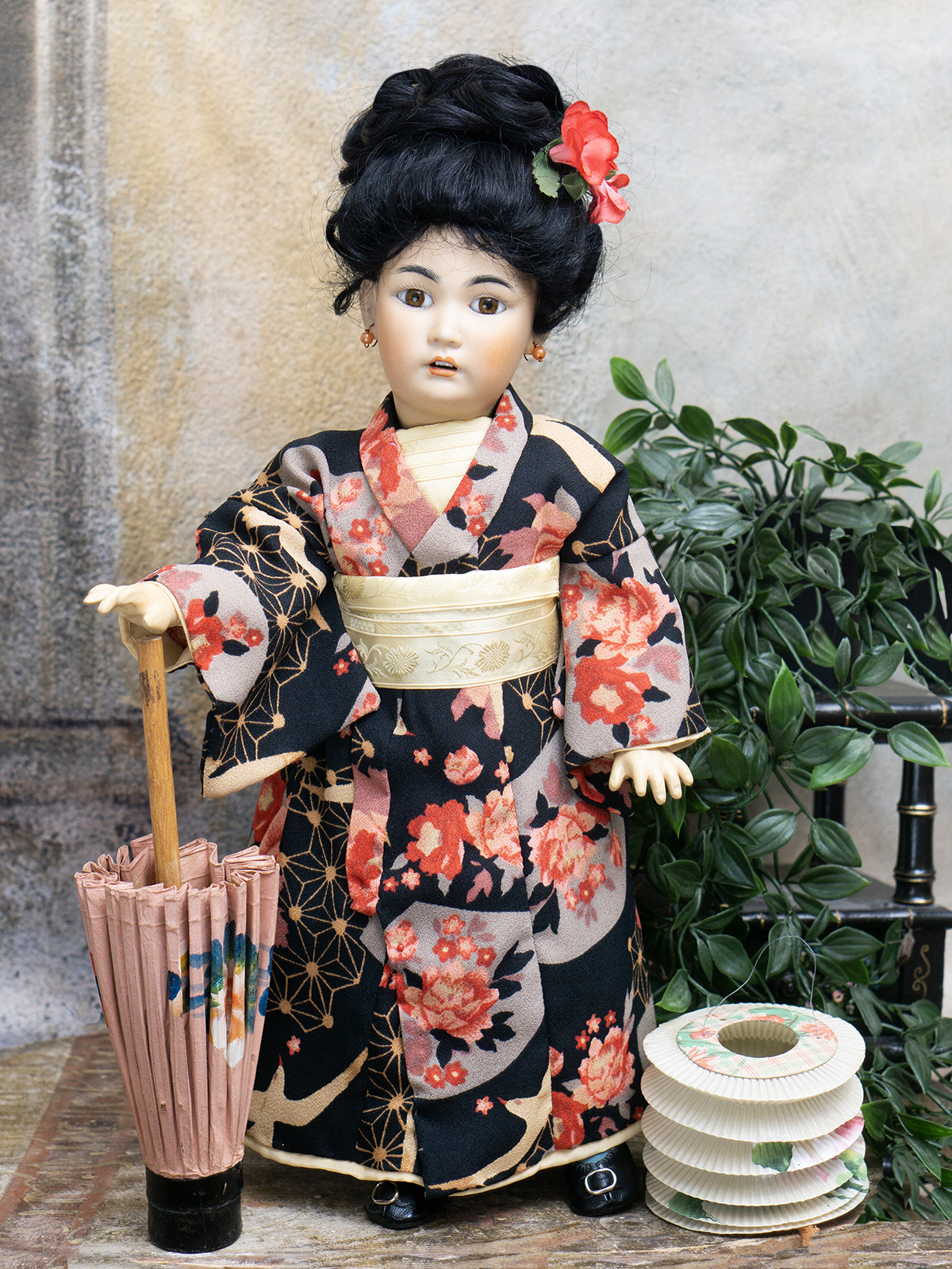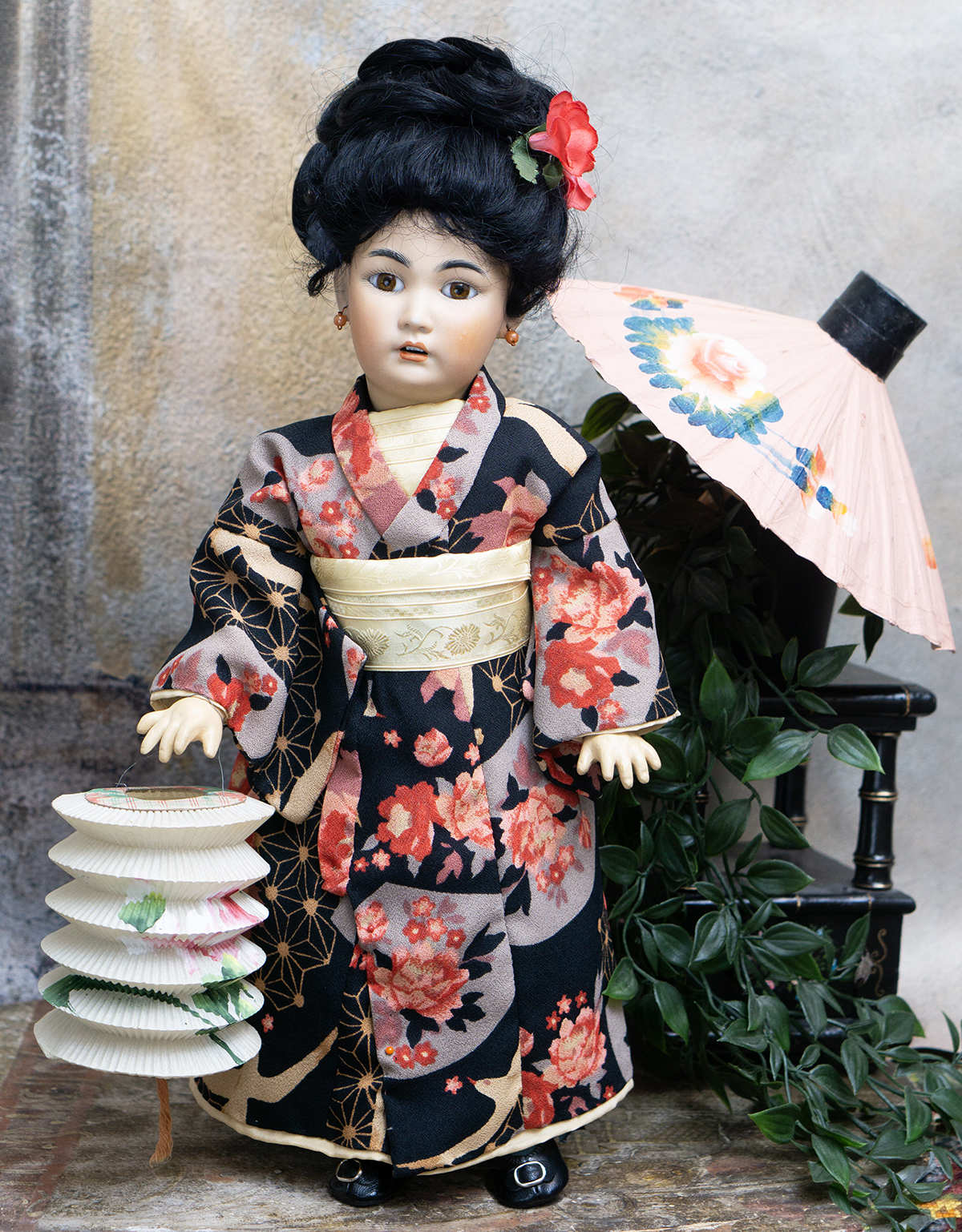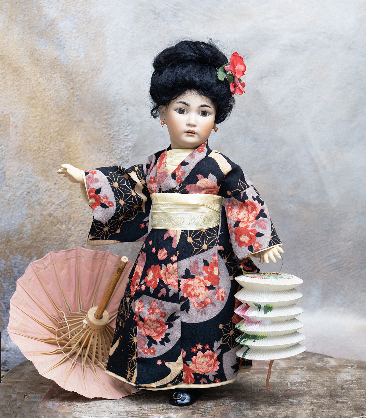 Amber tinted bisque socket head, brown glass eyes, black painted brows with feathered highlights, black painted short curly lashes, accented nostrils and eye corners, open mouth, shaded and accented lips, four porcelain teeth, pierced ears, black mohair wig in upswept fashion, amber tinted composition and wooden ball-jointed body, wearing antique silk kimono, undergarments, leather shoes.