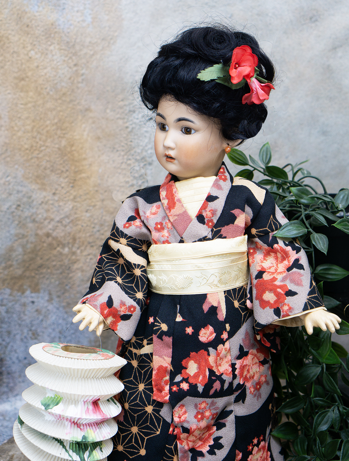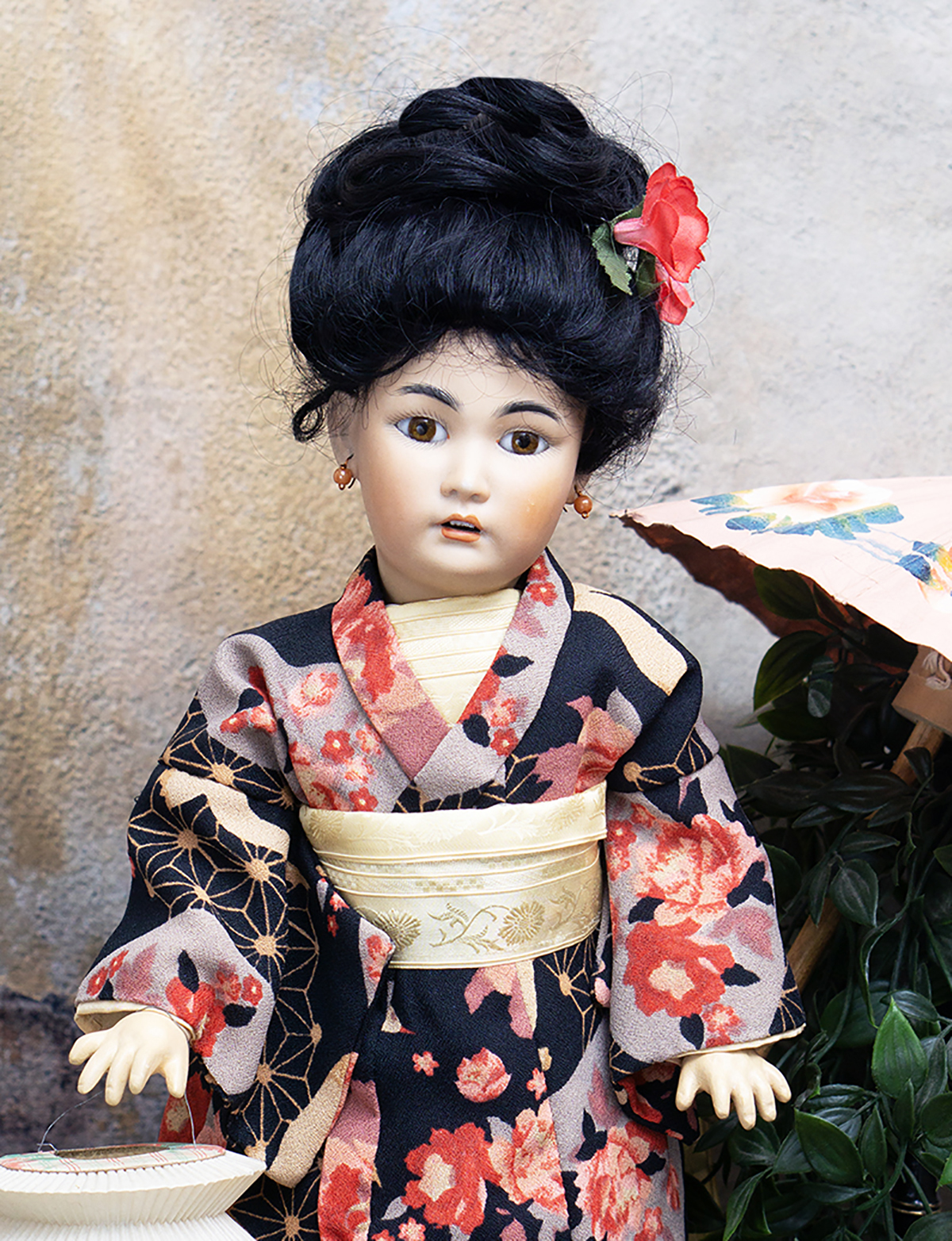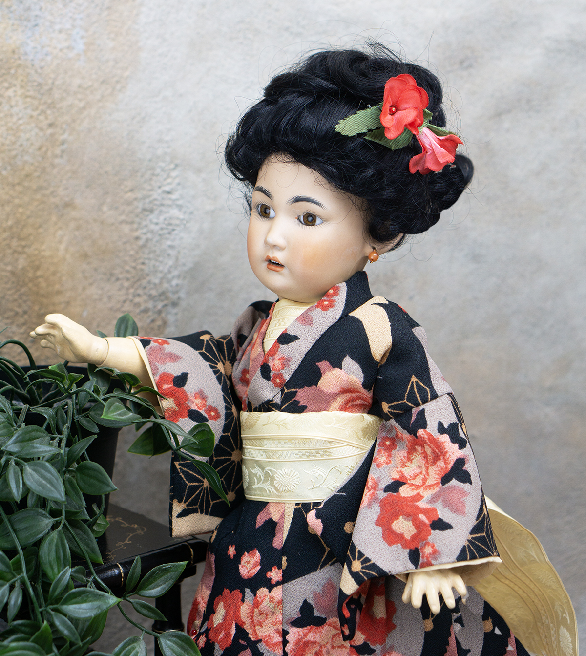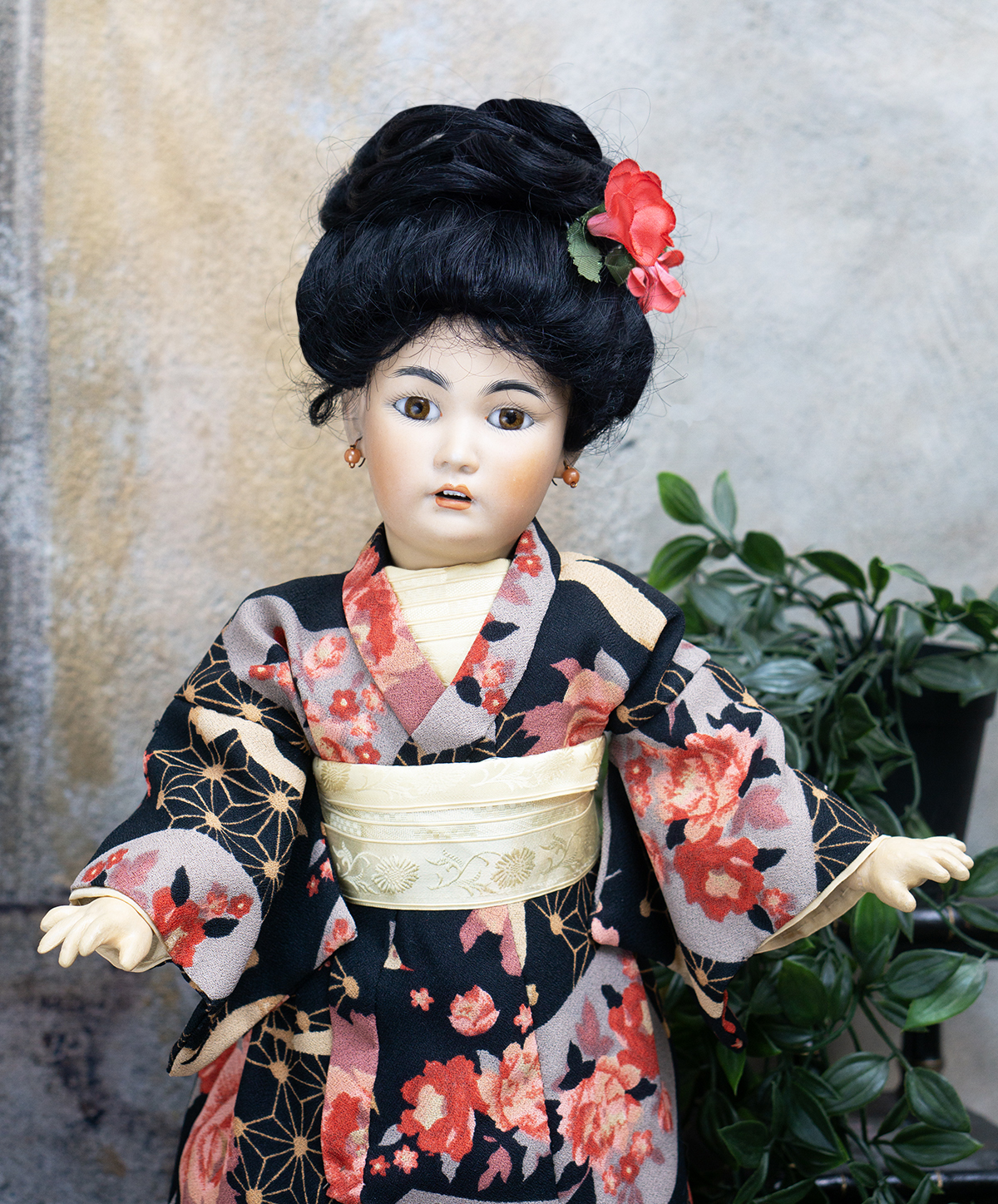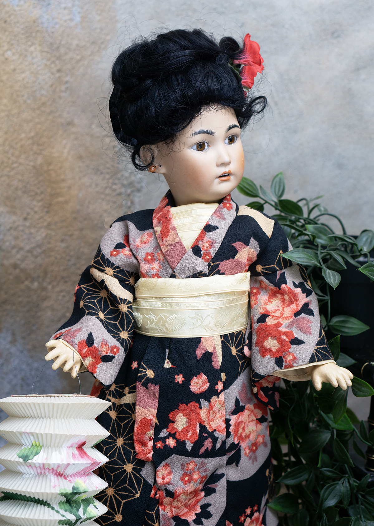Amber tinted bisque socket head, brown glass eyes, black painted brows with feathered highlights, black painted short curly lashes, accented nostrils and eye corners, open mouth, shaded and accented lips, four porcelain teeth, pierced ears, black mohair wig in upswept fashion, amber tinted composition and wooden ball-jointed body, wearing antique silk kimono, undergarments, leather shoes.