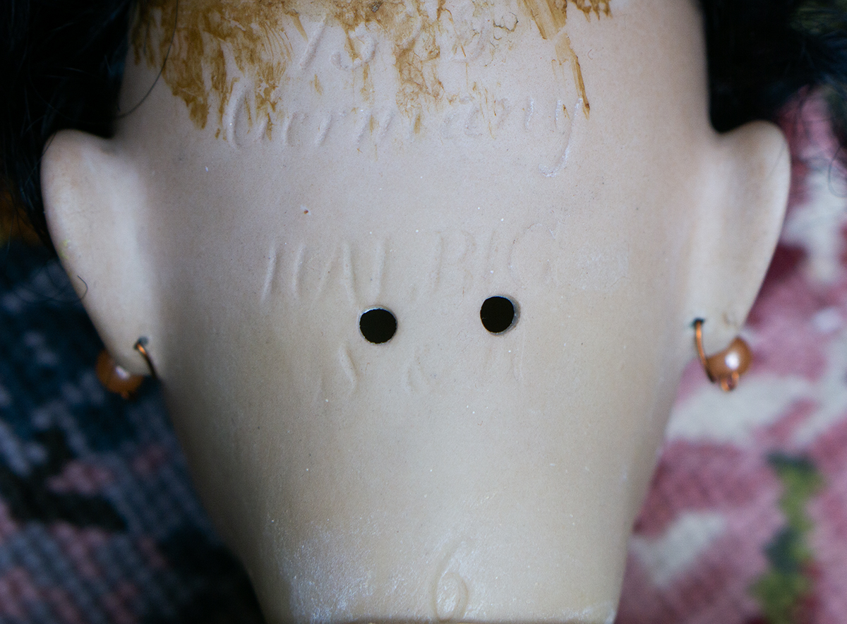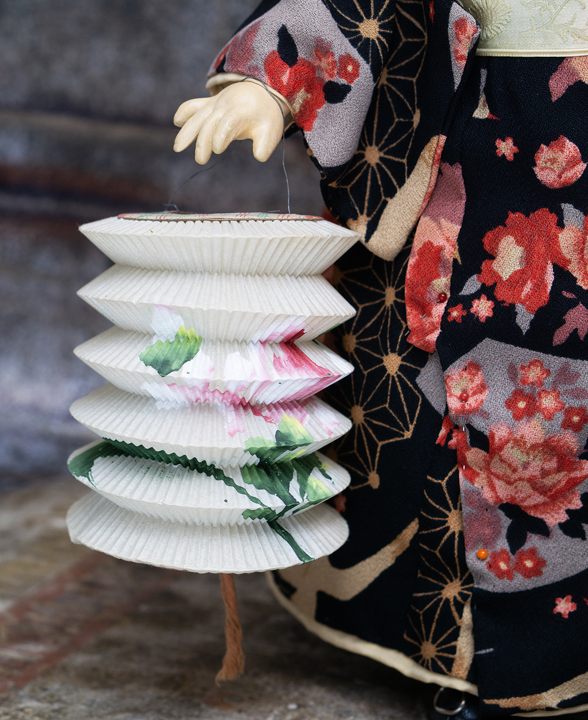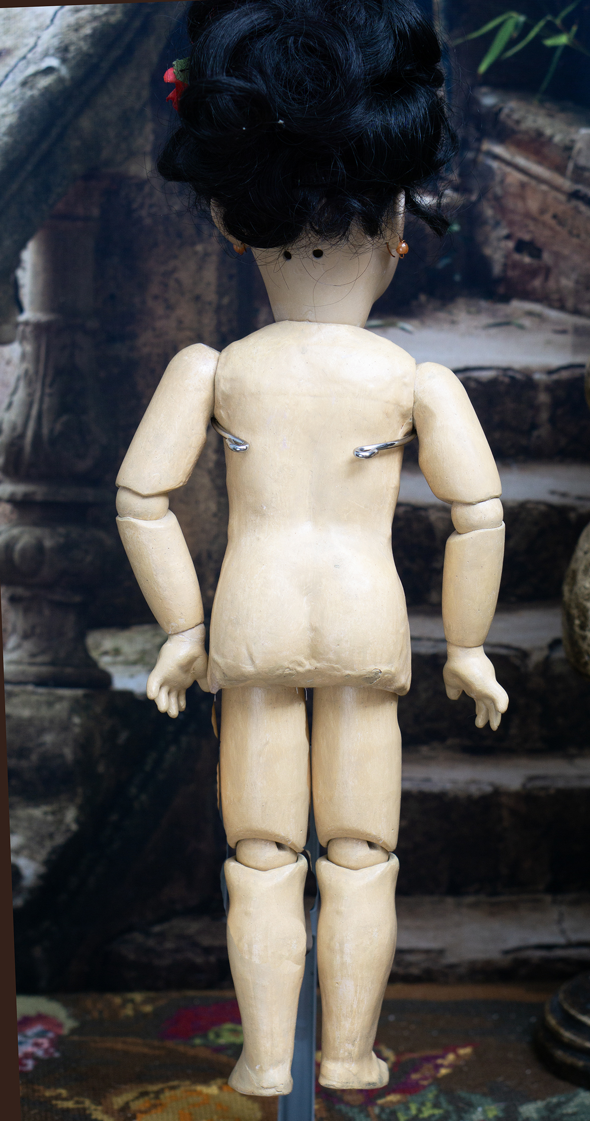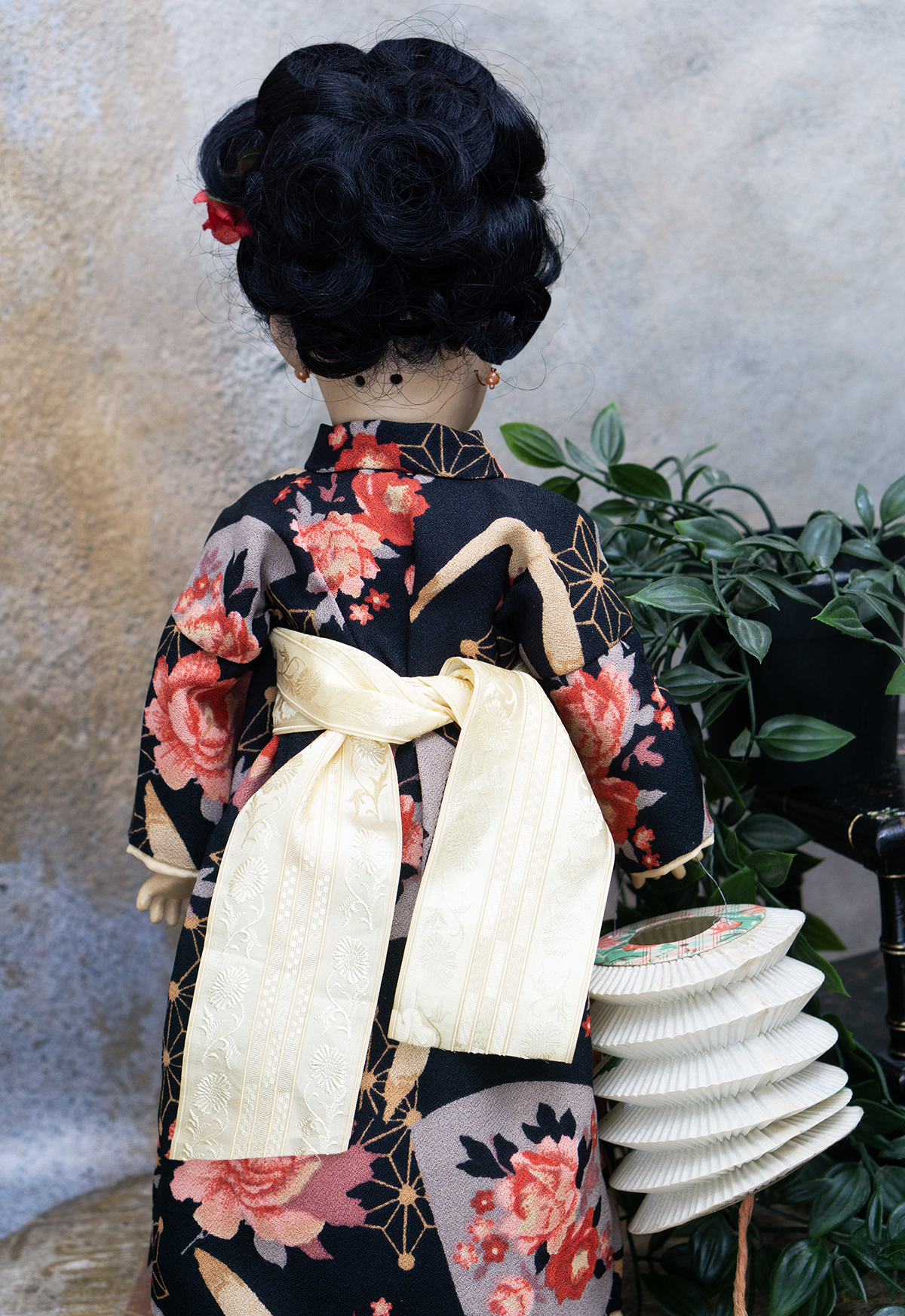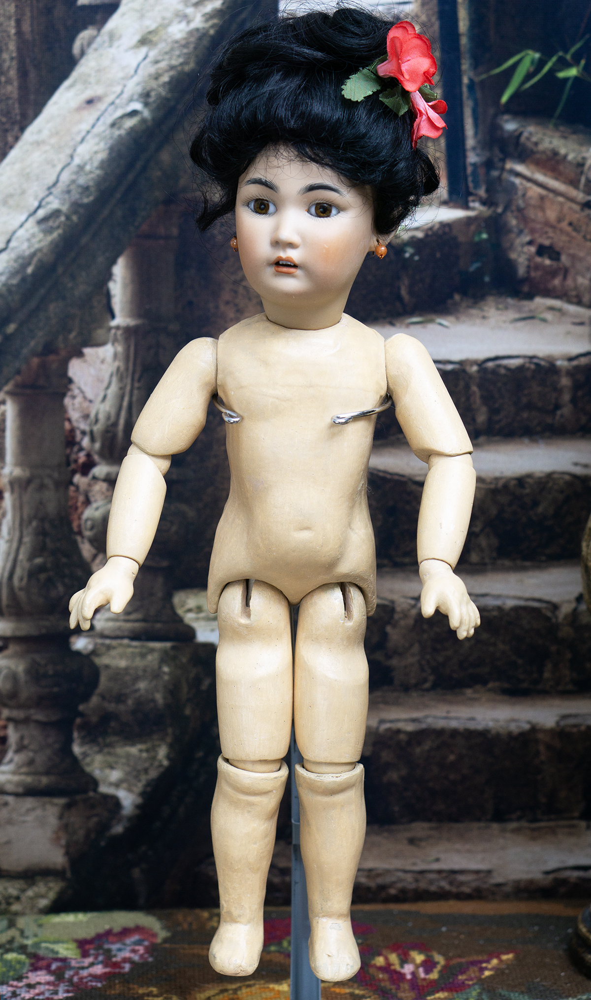 Amber tinted bisque socket head, brown glass eyes, black painted brows with feathered highlights, black painted short curly lashes, accented nostrils and eye corners, open mouth, shaded and accented lips, four porcelain teeth, pierced ears, black mohair wig in upswept fashion, amber tinted composition and wooden ball-jointed body, wearing antique silk kimono, undergarments, leather shoes.