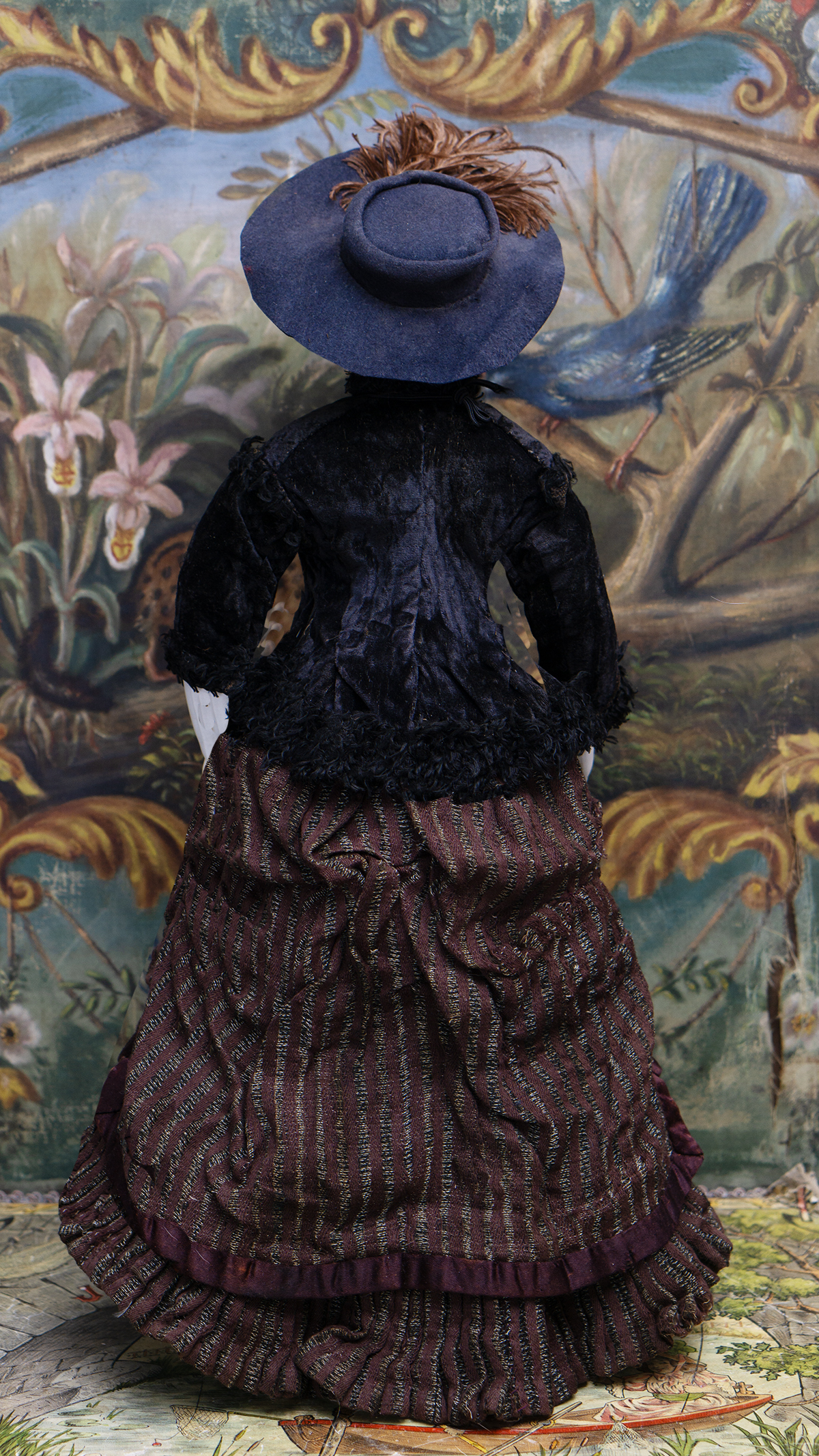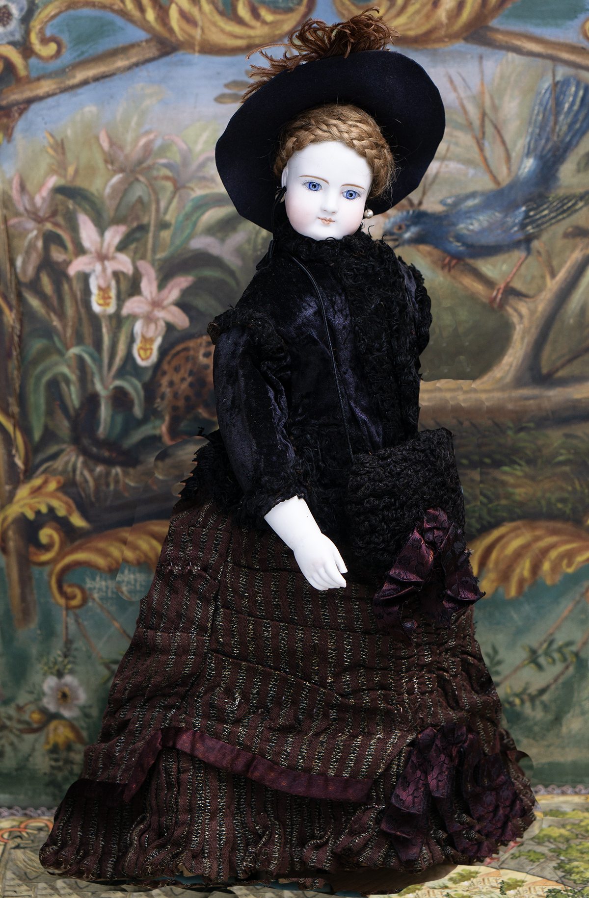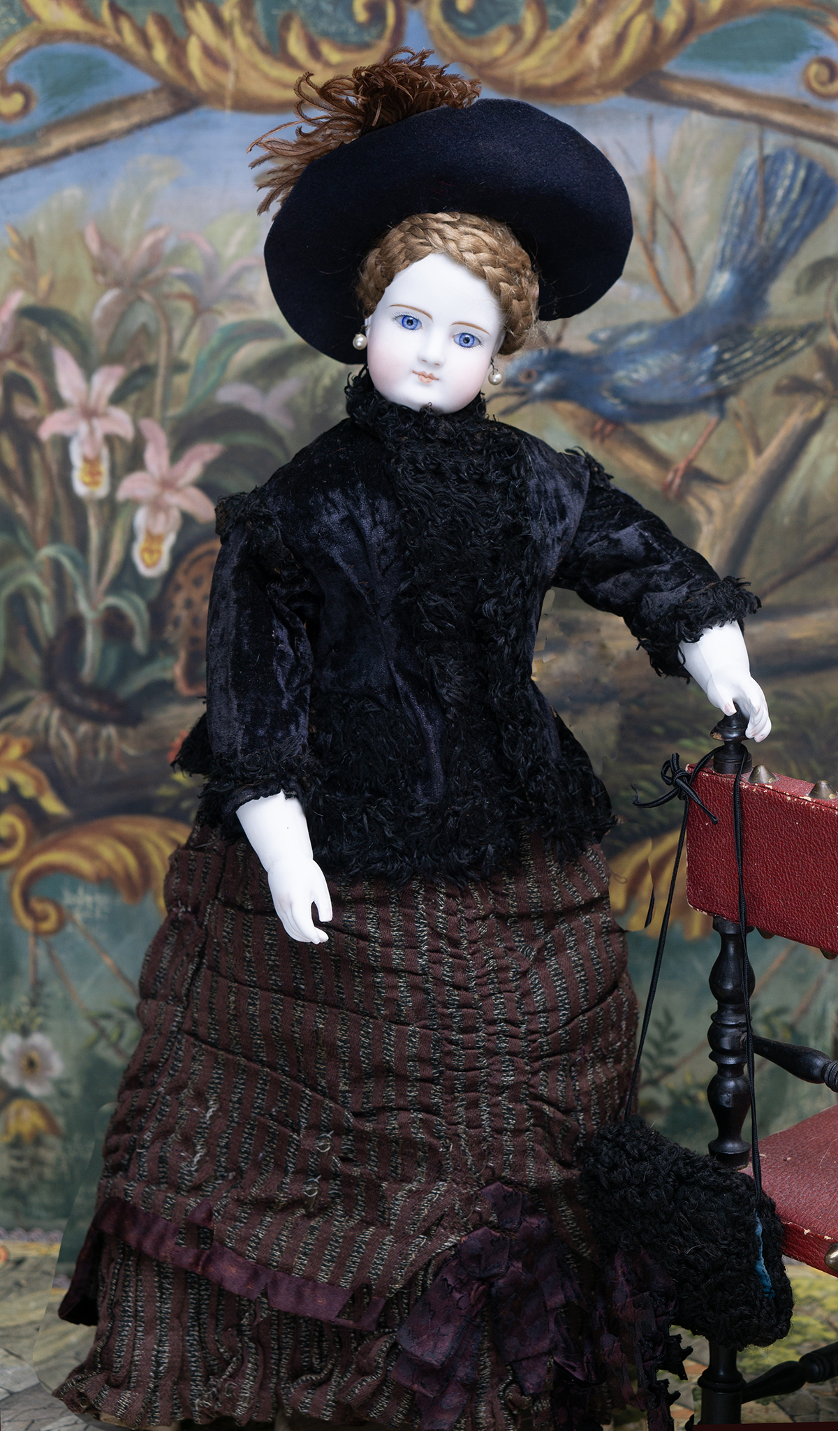 Pale bisque swivel head on kid-edged bisque shoulderplate, cobalt blue glass inset eyes, thick dark eyeliner, delicately-painted lashes and brows, rose-blushed eye shadow, feathered brows, accented nostrils and eye corners, closed mouth with pale outlined lips, pierced ears, mohair wig, twill-over-wooden lady body with defined waist, dowel-jointing at shoulders, hips, knees and ankles, bisque arms from elbows. She is wearing lovely antique original gown, antique underwear, beautiful earrings, vintage heeled brown leather boots, felt hat with feather.