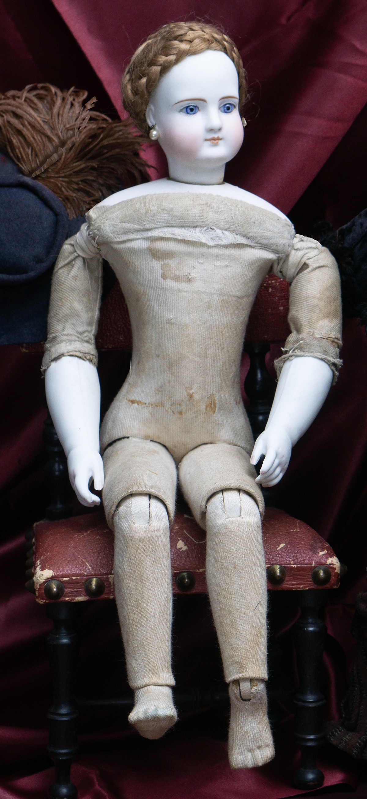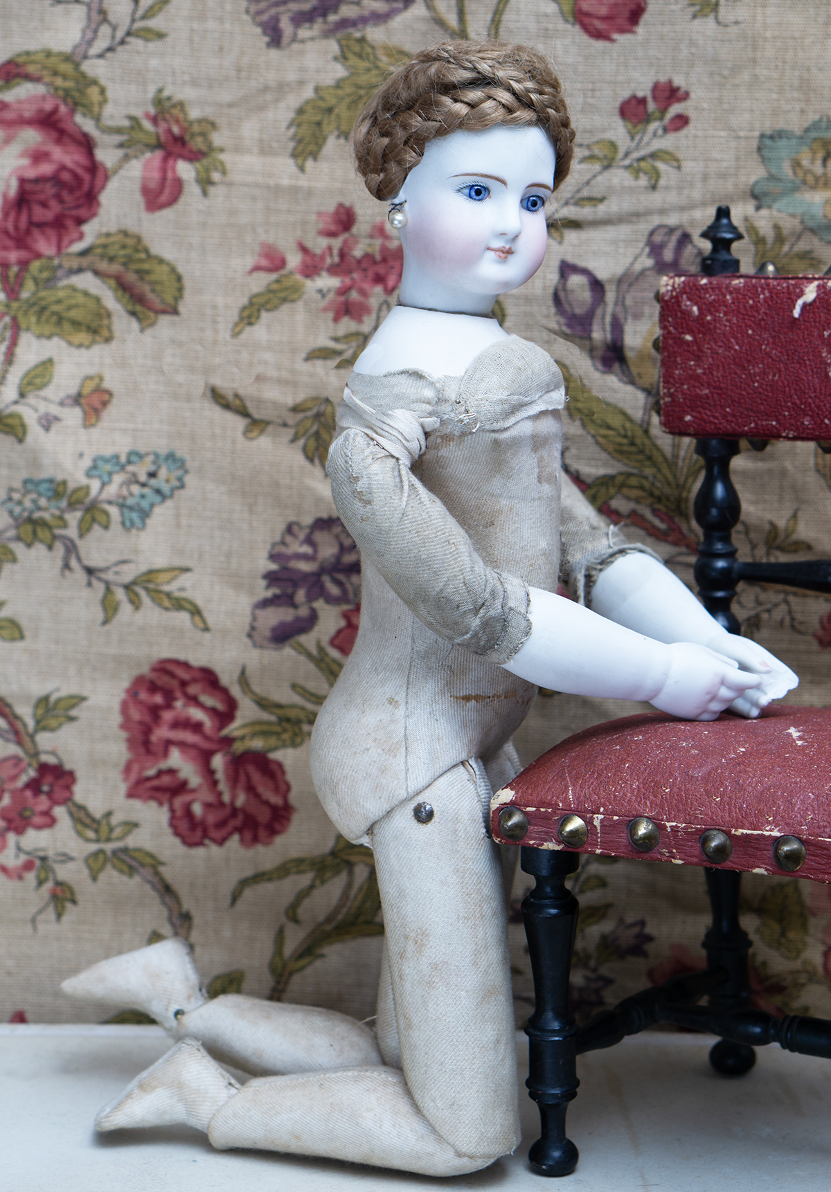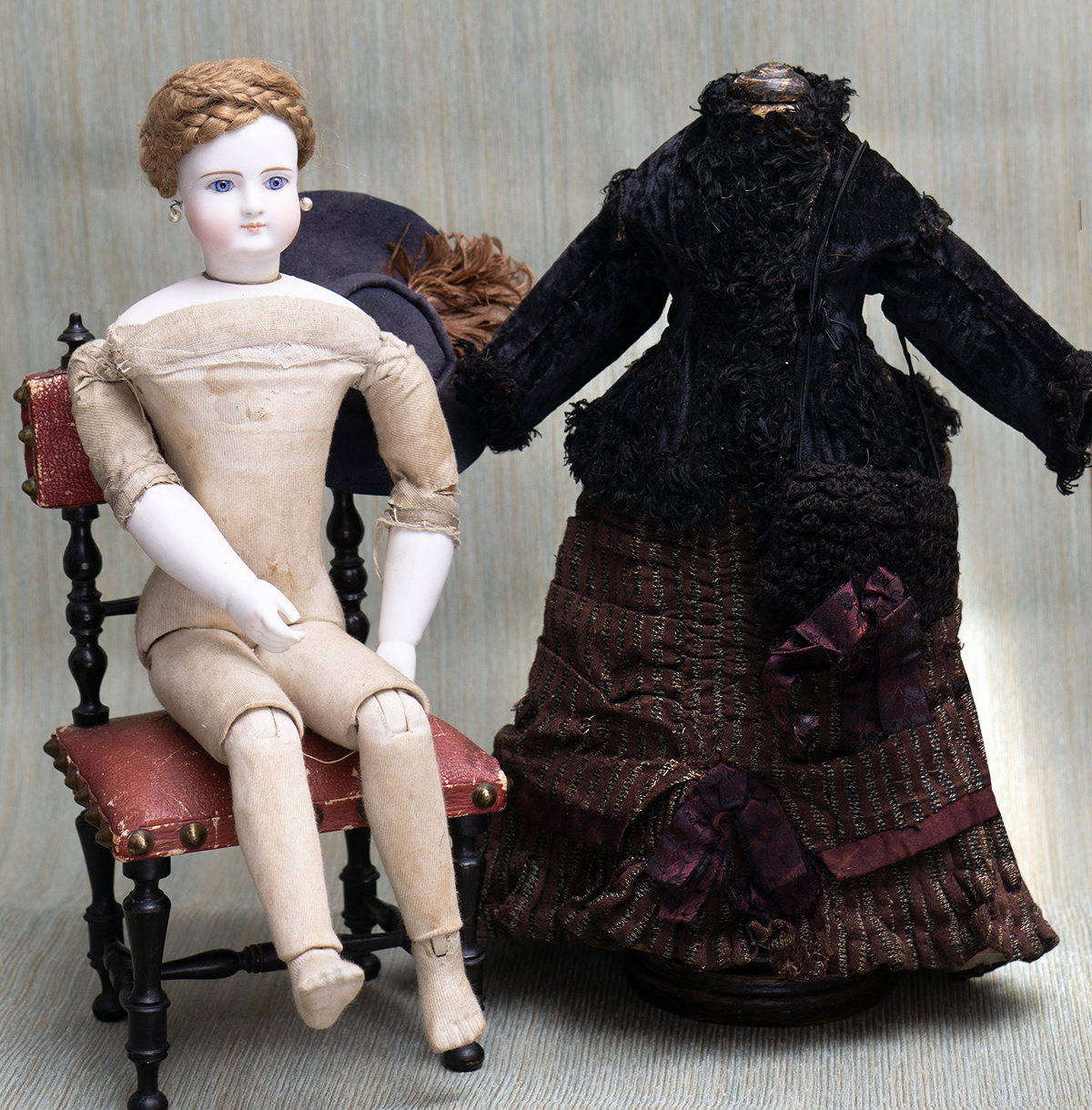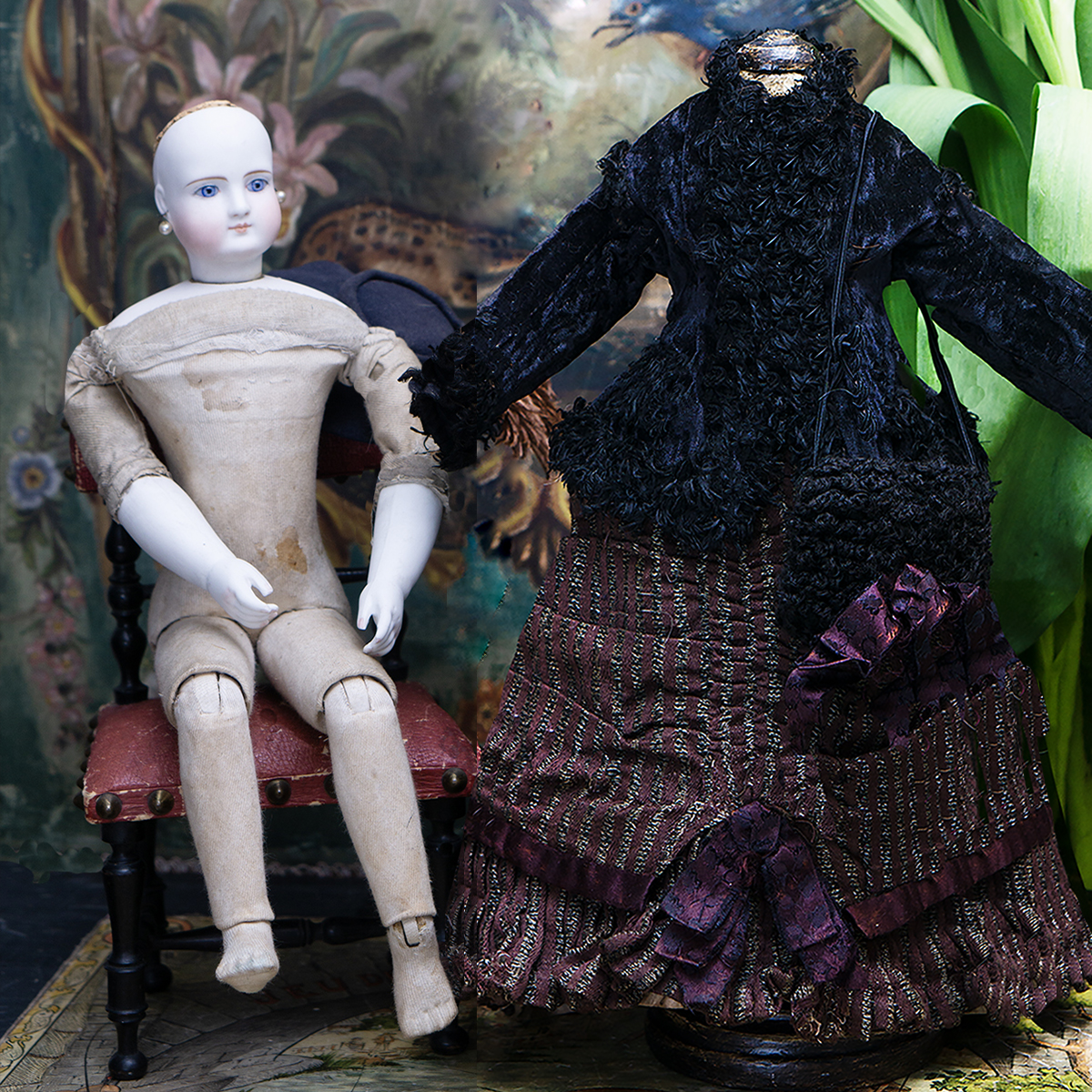 Pale bisque swivel head on kid-edged bisque shoulderplate, cobalt blue glass inset eyes, thick dark eyeliner, delicately-painted lashes and brows, rose-blushed eye shadow, feathered brows, accented nostrils and eye corners, closed mouth with pale outlined lips, pierced ears, mohair wig, twill-over-wooden lady body with defined waist, dowel-jointing at shoulders, hips, knees and ankles, bisque arms from elbows. She is wearing lovely antique original gown, antique underwear, beautiful earrings, vintage heeled brown leather boots, felt hat with feather.