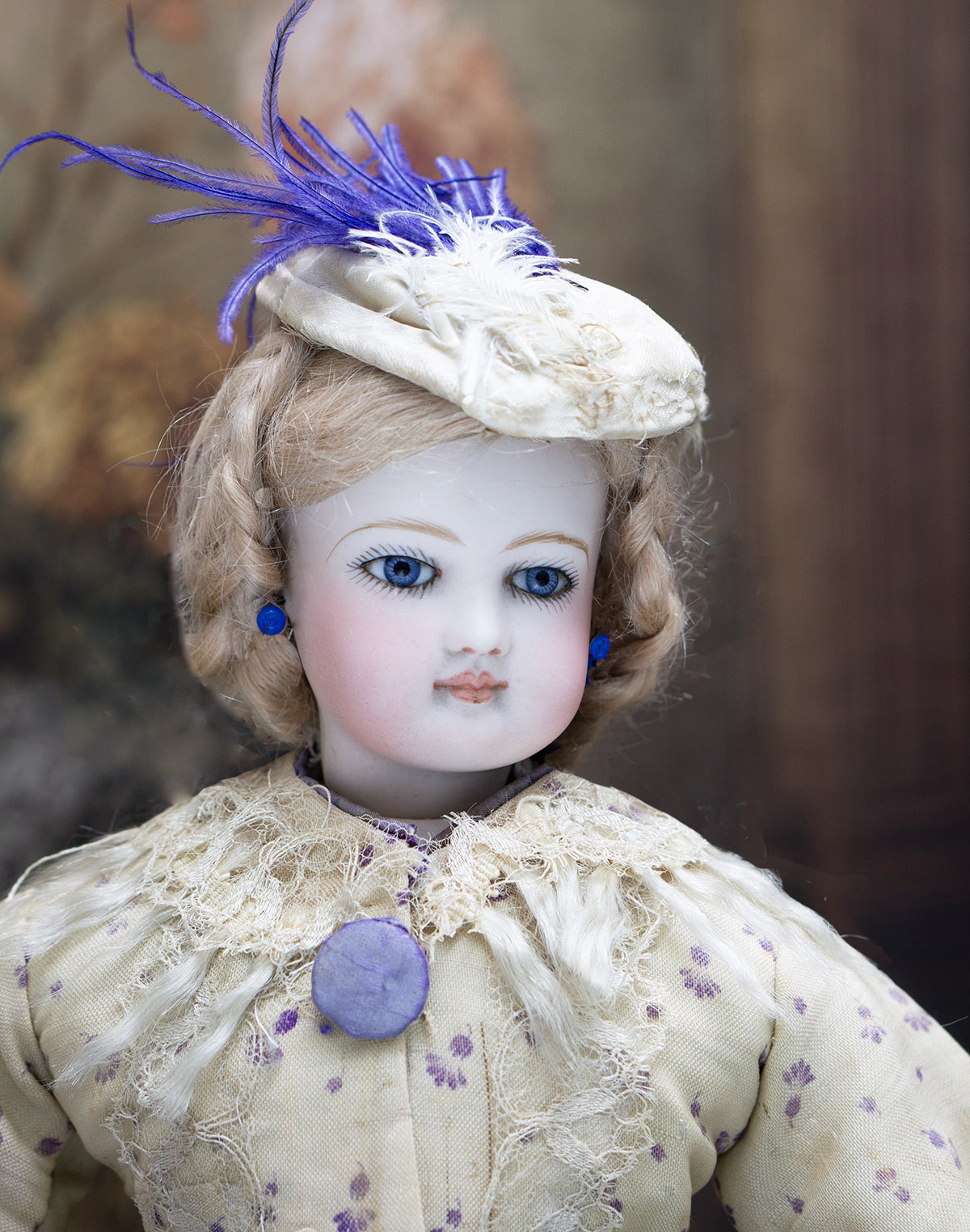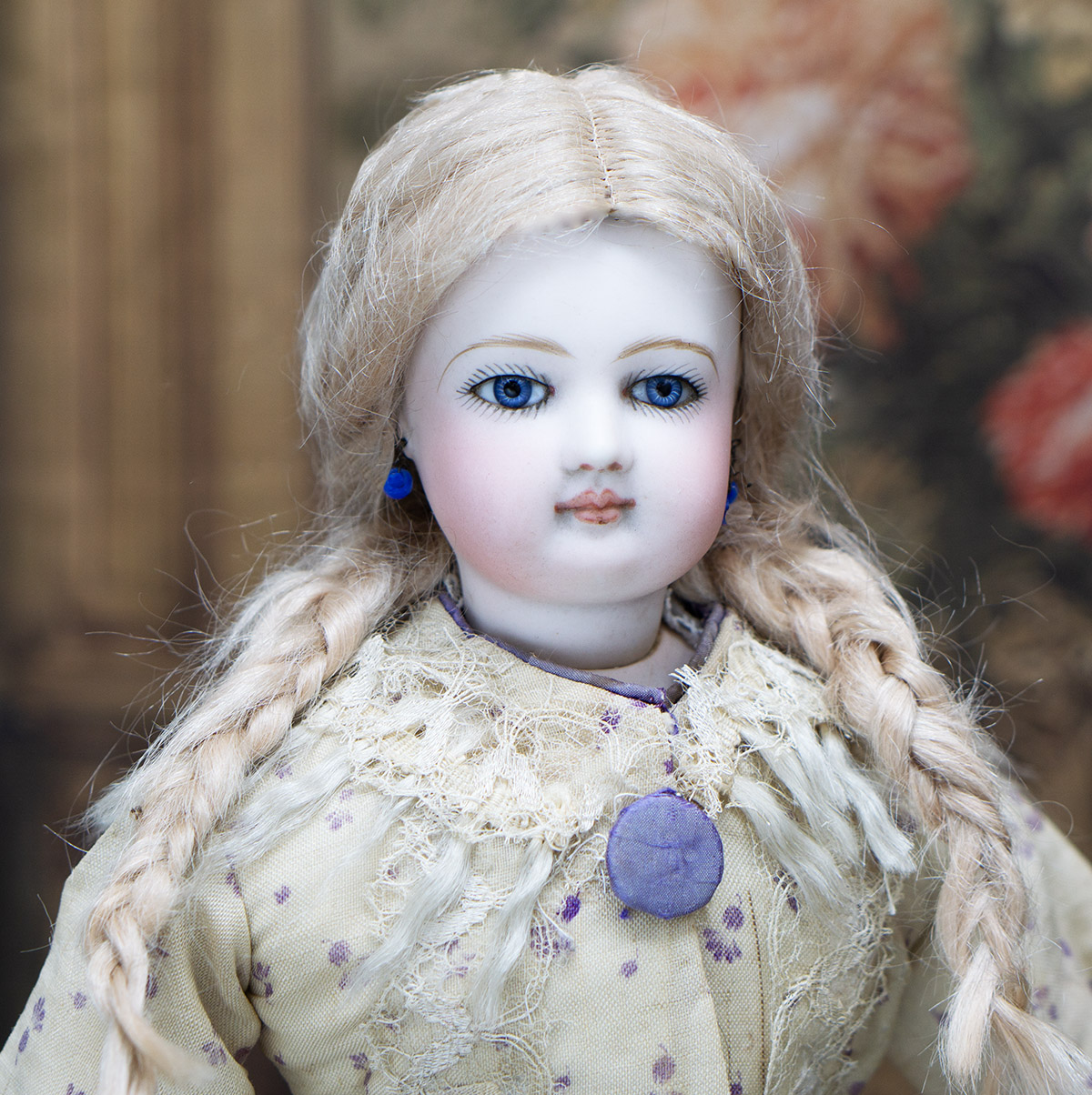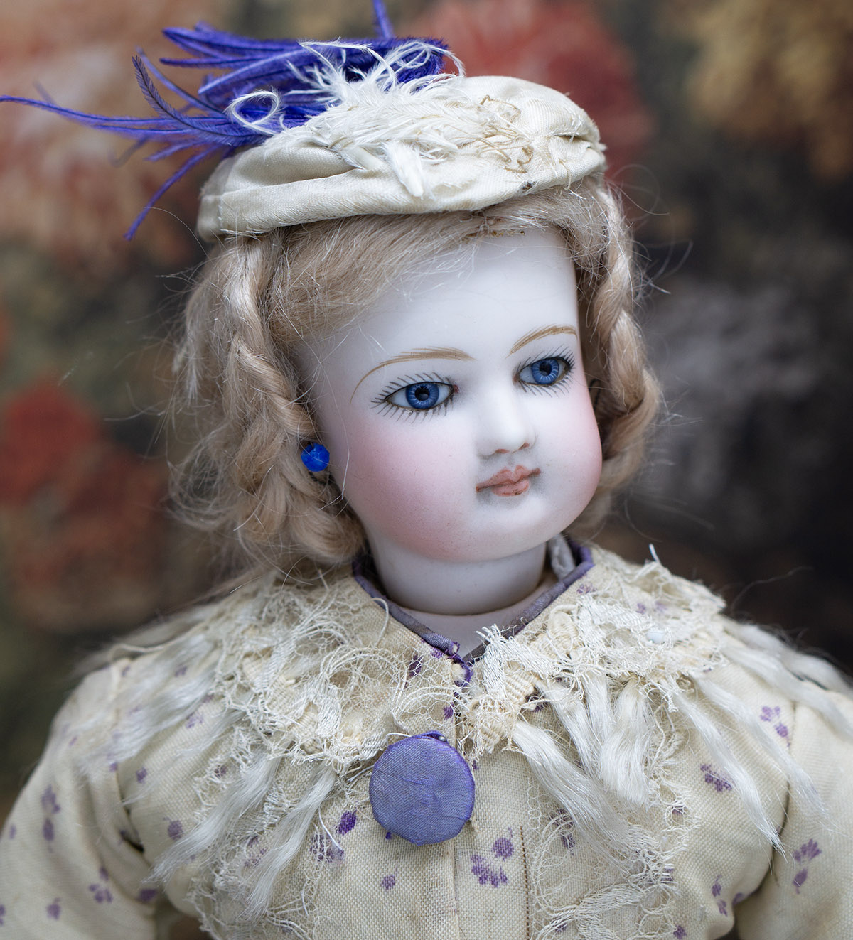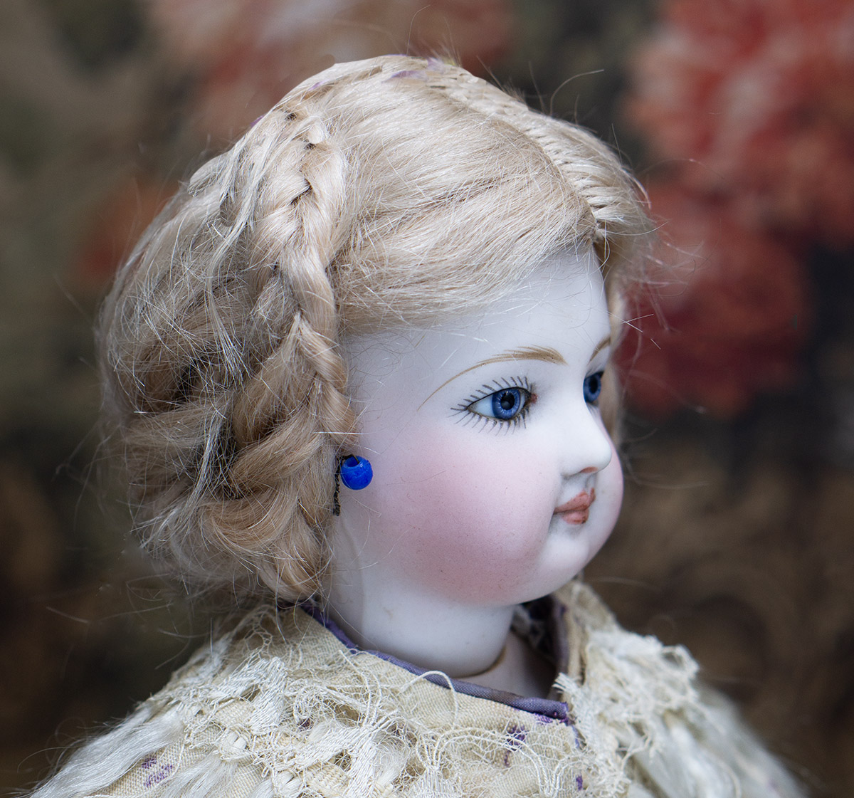 Bisque swivel head on kid-edged bisque shoulderplate, blue glass spiral-threaded eyes with dark iris rims, dark eyeliner, painted lashes, feathered brows, accented nostrils, closed mouth with delicately shaded accented lips, pierced ears, original blonde mohair wig over cork pate, French kid poupee body with gusset-jointing at elbows, hips and knees.