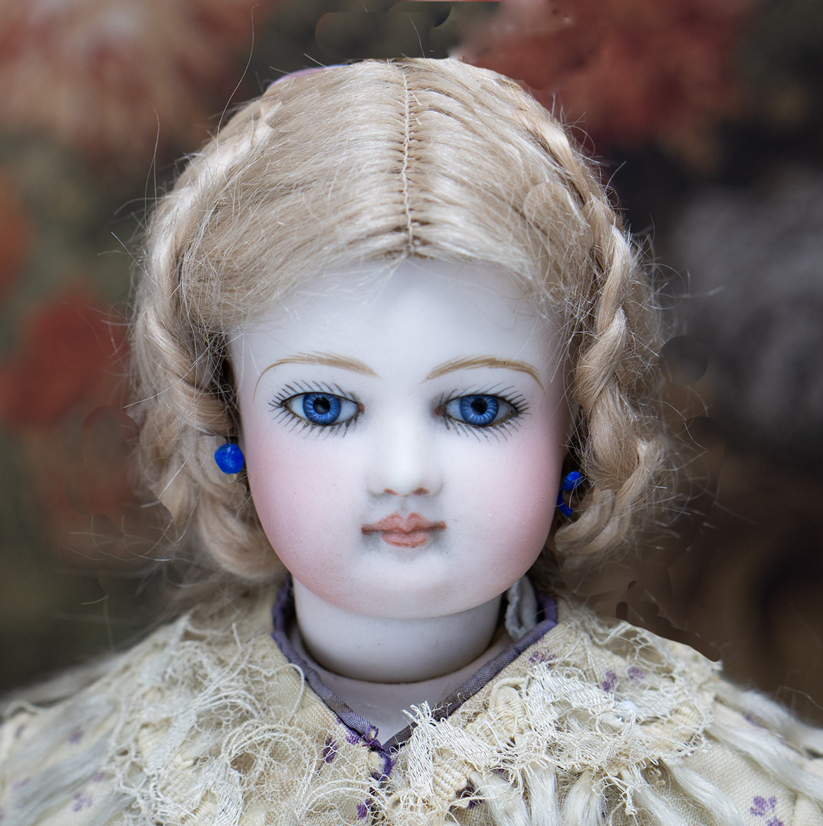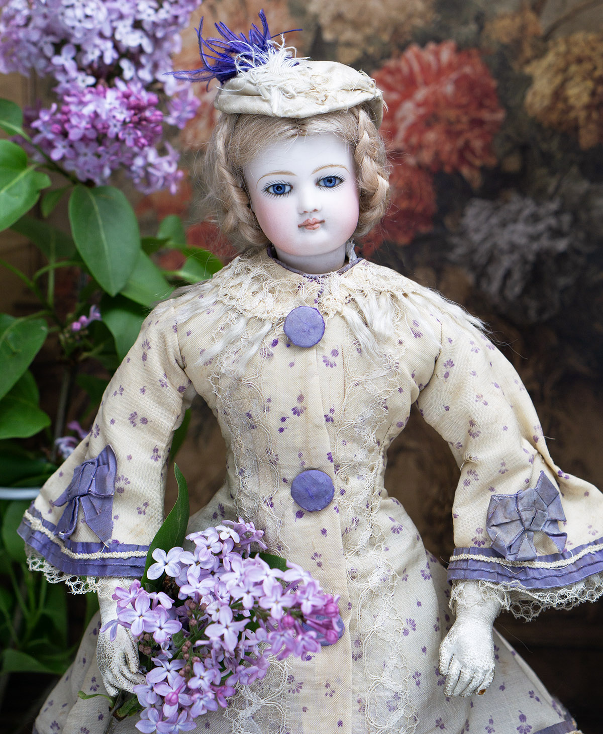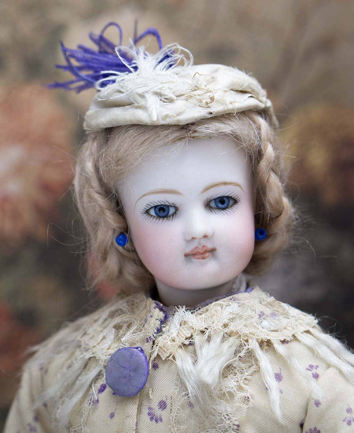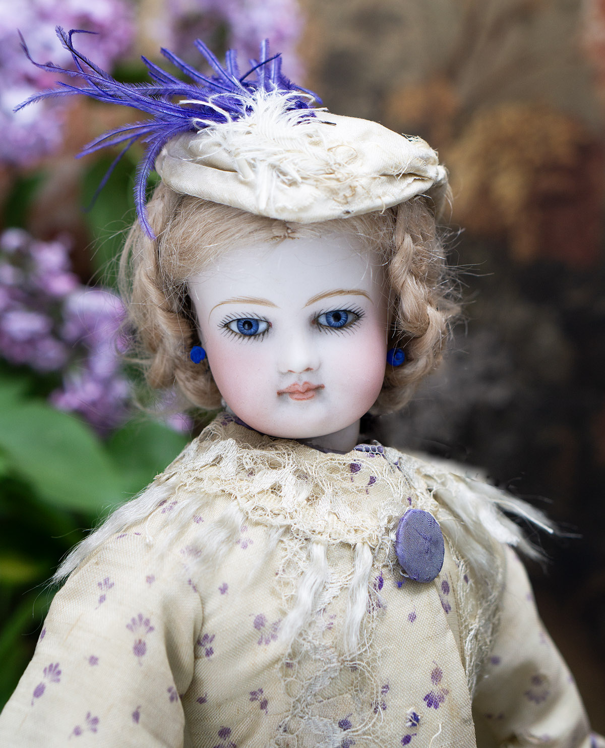 Bisque swivel head on kid-edged bisque shoulderplate, blue glass spiral-threaded eyes with dark iris rims, dark eyeliner, painted lashes, feathered brows, accented nostrils, closed mouth with delicately shaded accented lips, pierced ears, original blonde mohair wig over cork pate, French kid poupee body with gusset-jointing at elbows, hips and knees.