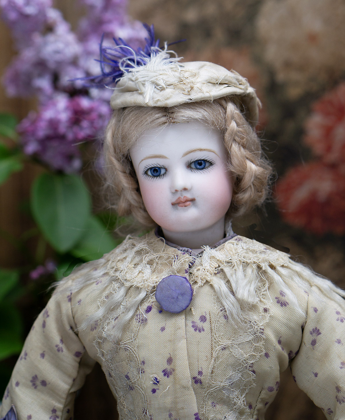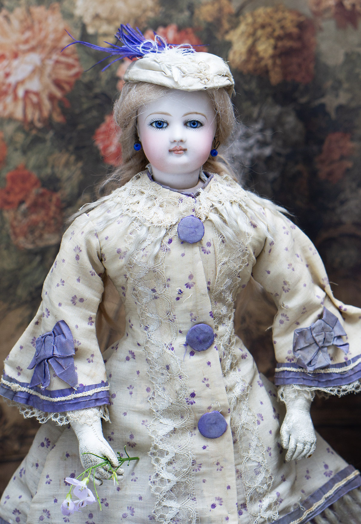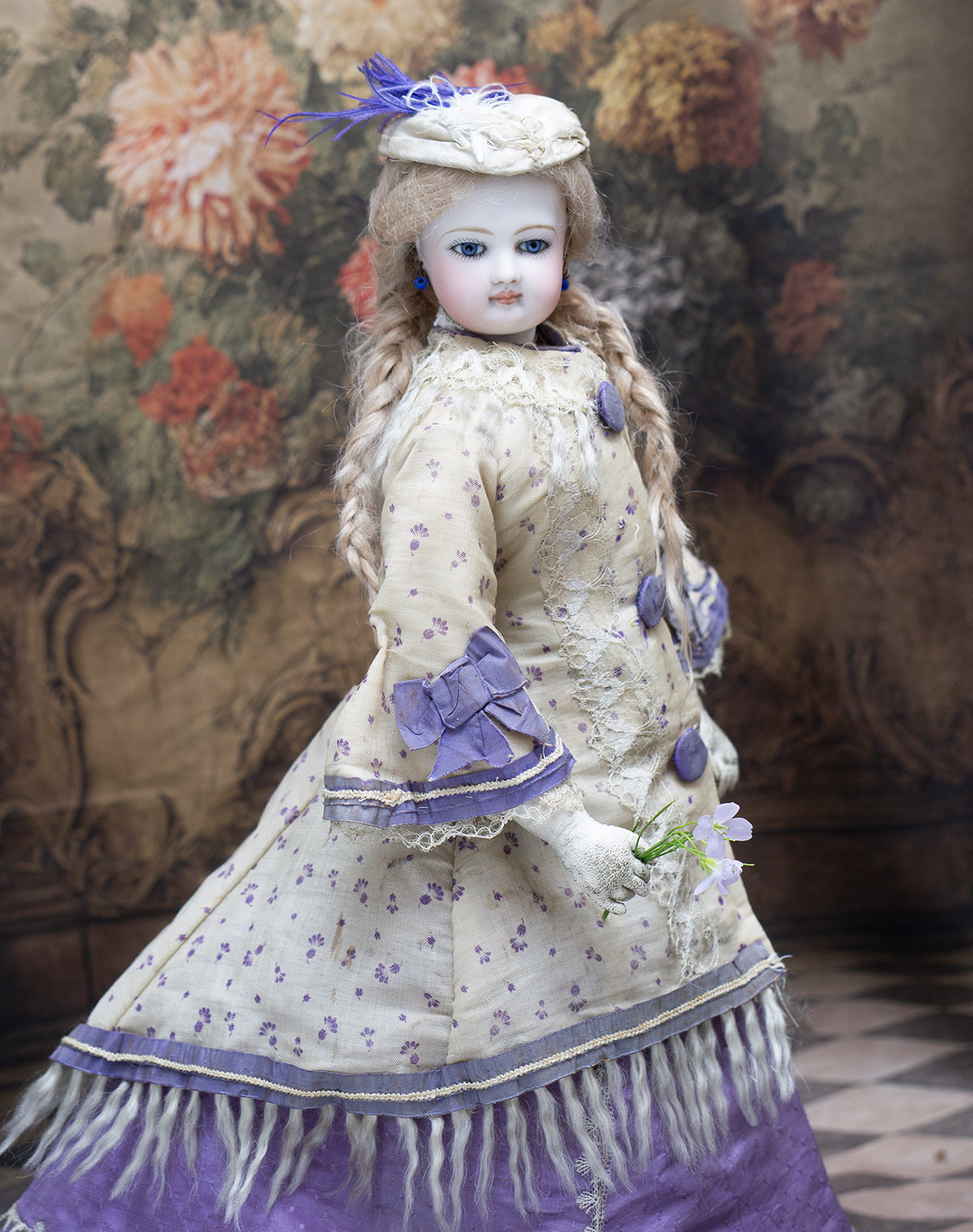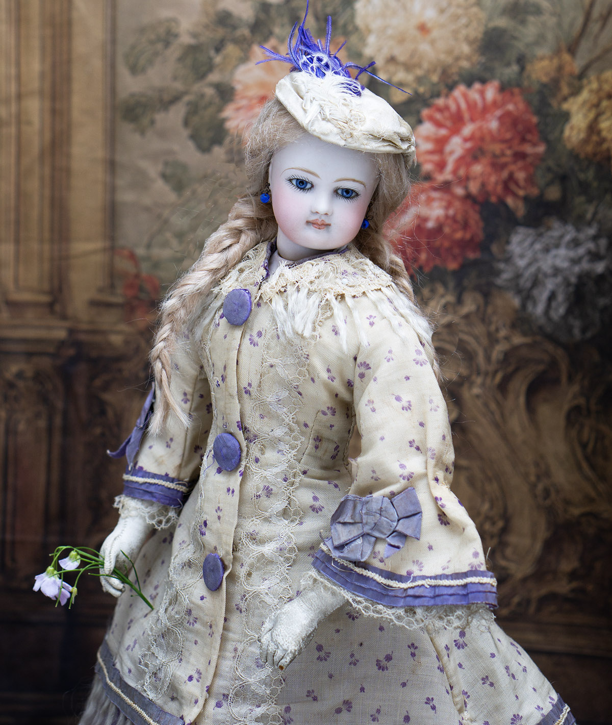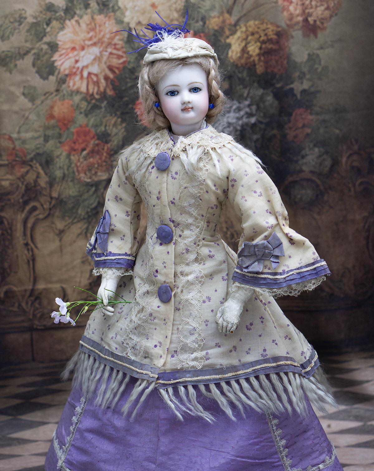 Bisque swivel head on kid-edged bisque shoulderplate, blue glass spiral-threaded eyes with dark iris rims, dark eyeliner, painted lashes, feathered brows, accented nostrils, closed mouth with delicately shaded accented lips, pierced ears, original blonde mohair wig over cork pate, French kid poupee body with gusset-jointing at elbows, hips and knees.